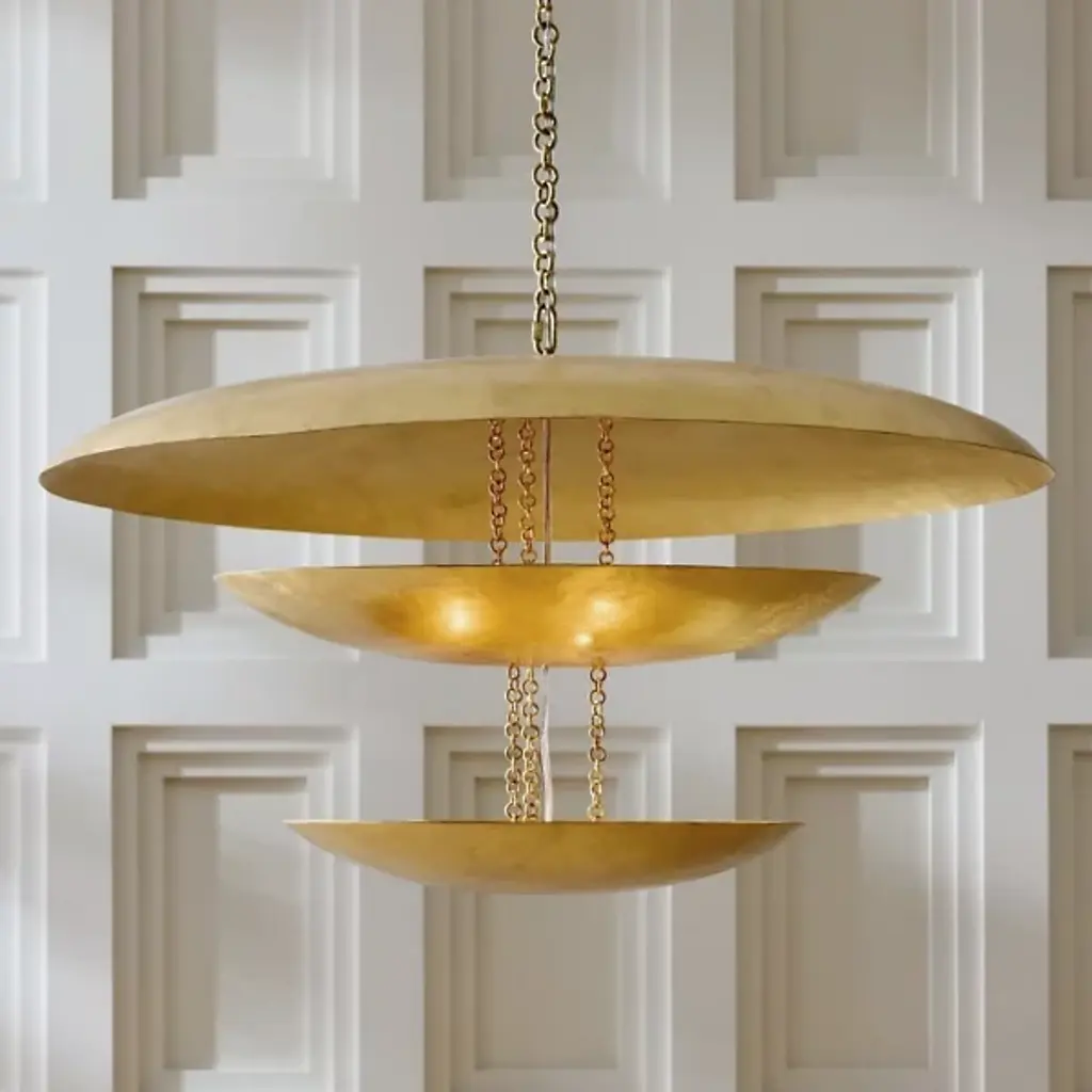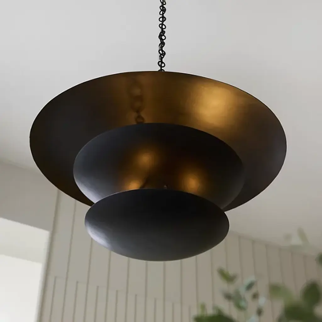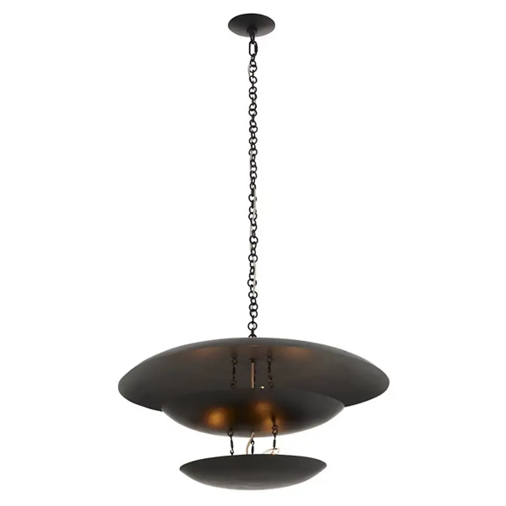 The Arteriors Florko Chandelier has a modern design that seemingly floats in space. This space age fixture features three discs made of iron with the largest on top followed by two smaller concave discs below. The two lower levels hold the lamps, the illumination being thrown upward to create a lit atmosphere with a unique flair.