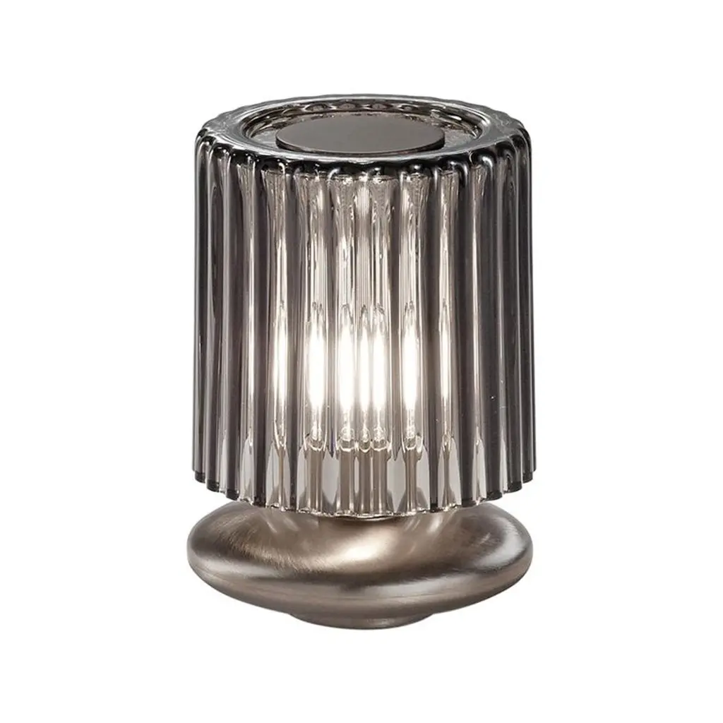 Flos Last Order Rechargeable Indoor/Outdoor Table Lamp in Steel with Clear Base by Michael AnastassiadesLast Order is a continuation of the table light that was originally designed for the new Four Seasons restaurant in New York City, which relocated and opened in 2018 with the interiors designed by São Paolo-based architect Isay Weinfeld.It is a rechargeable, portable table lamp that diffuses light through a transparent solid crystal base whose shape makes reference to architectural typology of the ancient column. The top cover comes in a combination of different metal and color finishes: stainless steel, brass, satin copper or matte green.Features: Outdoor and indoor use: Stainless Steel & Matte GreenAutonomous usage lasts between 6 hours (at full power) and 24 hoursCharges via USB-C3-step dimmer : 100% intensity, 50% intensity, 3% intensity"Night shift" mode - Dims directly to 3% intensity when pressing and holding the optical sensor.Additional Information:Material: Crystal, Brass, PolycarbonateFinish: Stainless Steel (Indoors & Outdoors)Model: Clear BaseMounting: Table TopEnvironment: Indoor/Outdoor - Wet LocationsLamp (Bulb) Description: LED 2.5W 200lm 2700KVoltage: 100-240VIP Rating: IP55Dimensions: Ø 3.94 x 5.51 H inchAvailable in other finish options: Matte Green (Indoors & Outdoors), Copper (Indoors only), Brass (Indoors only)Available in other model option: Fluted Base