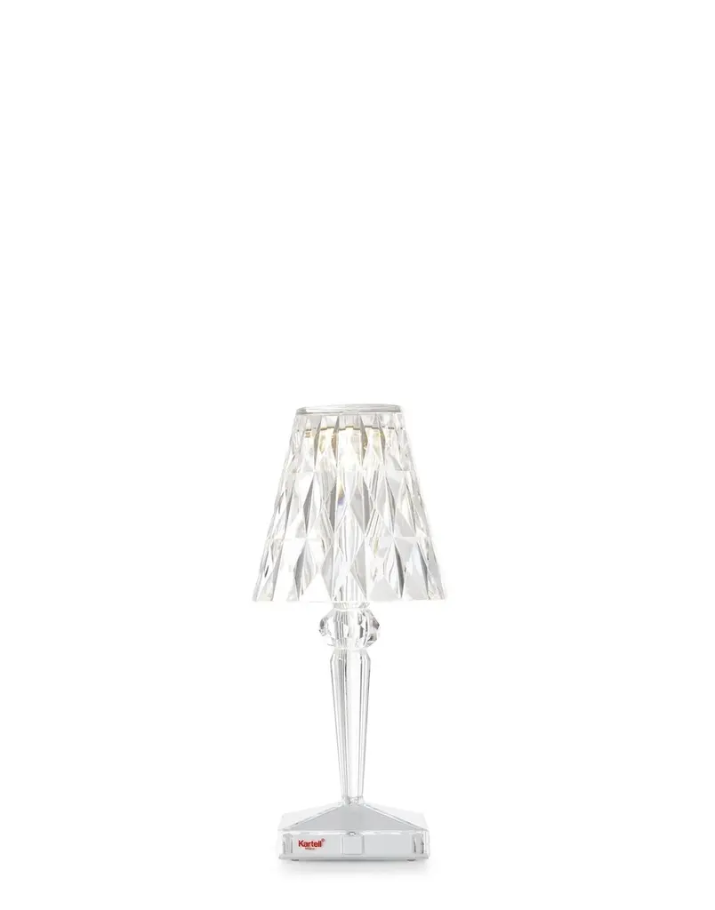 MISS K desk/table lamp providing diffused light. Fully transparent, injectionmolded PMMA (polymethylmethacrylate, UL-94 HB) frame; opal, injectionmolded polycarbonate (UL-94 V0) internal diffuser; transparent polycarbonate outer diffuser internally finished with high vacuum aluminization process. Dimmer for 0-100% luminosity adjustment, transparent polarized cord.Created by innovative design master Philippe Starck, the Miss K modern table lamp brings a delightful duality to its work. When unlit, its transparent outer diffuser rests with a sleek metallic tint. When the table lamp is lit, the transparency of the diffuser is evident and it appears as if you’re looking at an x-ray of a lamp. The Miss K features a fully transparent, PMMA frame and an opal internal diffuser. The Miss K glows with a diffused light. Available in black, fumée, transparent, red, silver and soft which offers a hint of feminine softness, the result of its soft fabric outer diffuser. There is a dimmer for 0-100% luminosity and a transparent, polarized cord.Inspiration behind the design: There is always more than meets the eye with a Philippe Starck creation, known for his inventive use of materials to evolve our collective perception of the status quo. Here, he blends a traditional outer diffuser with a transparent PMMA structure to surprise us with a lamp that is innovative as well as timeless. With Miss K, the designer invites us to explore the inner workings of the lamp, seeming to suggest that the items we rely on every day have more power within than we seem to realize.Addition Information:Finish: TransparentMounting: Table topLamp (Bulb): 1 x 72W BT-15 ECO Halogen (Included)Environment: Indoor - Dry LocationIP Rating: IP20Construction material: PlasticSwitching: 0-100% dimmer installed on the cordWeight: 2.6 lbsVoltage: 120Dimension: Ø 9.29 x H 17 in.Available in other colors options: Aluminized Silver, Black, Fumee, Red, Soft