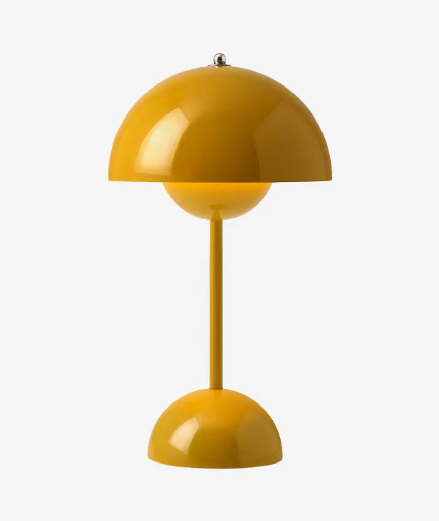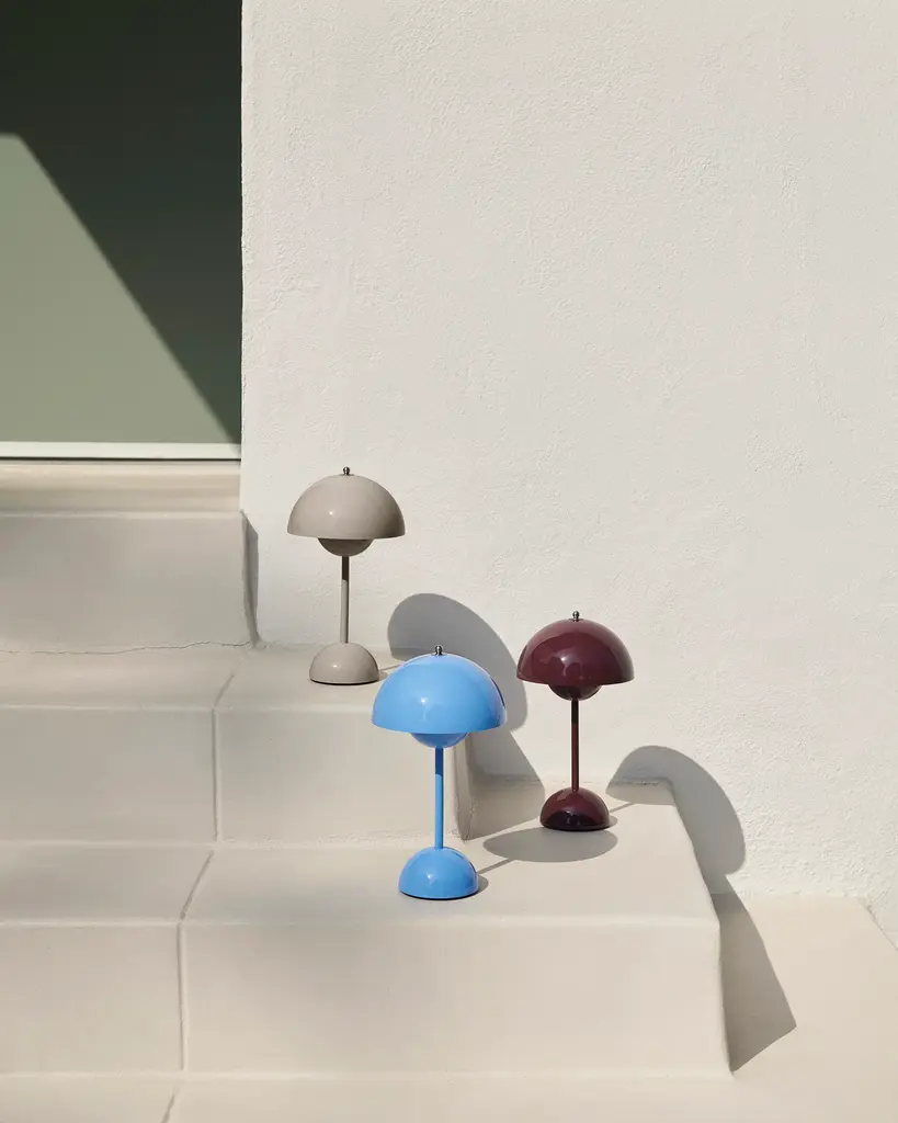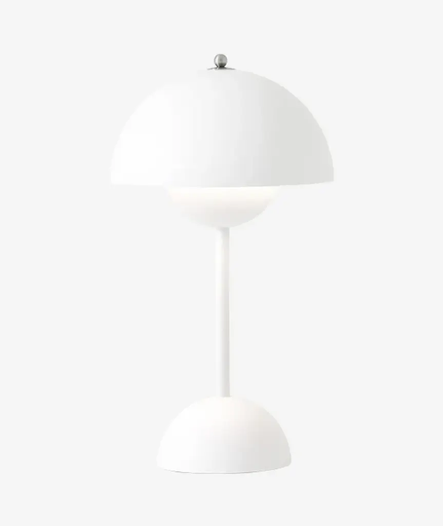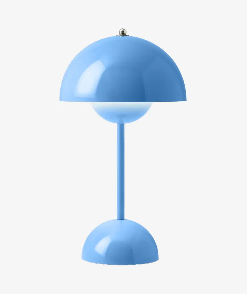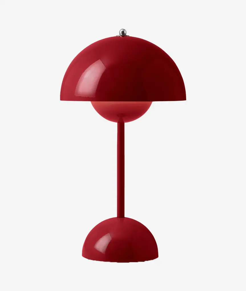 The Flowerpot, a vividly colored lamp with a rounded pendant that hangs from the semi-domed upper shade, embodies the experimental attitude of Verner Panton. Slightly smaller in size than the table lamp version, and deliberately lightweight, the portable VP9 comes equipped with a USB charging cable. It is available in a wide range of contemporary colors and will bring a cozy atmosphere to indoor and outdoor settings.