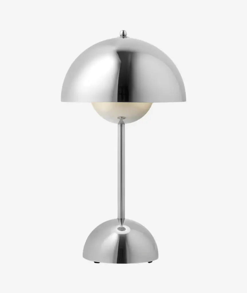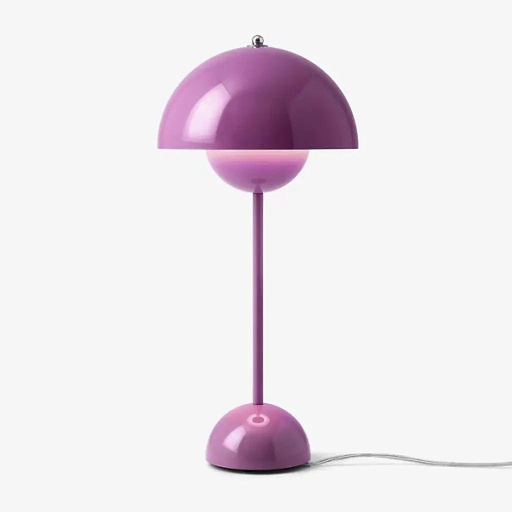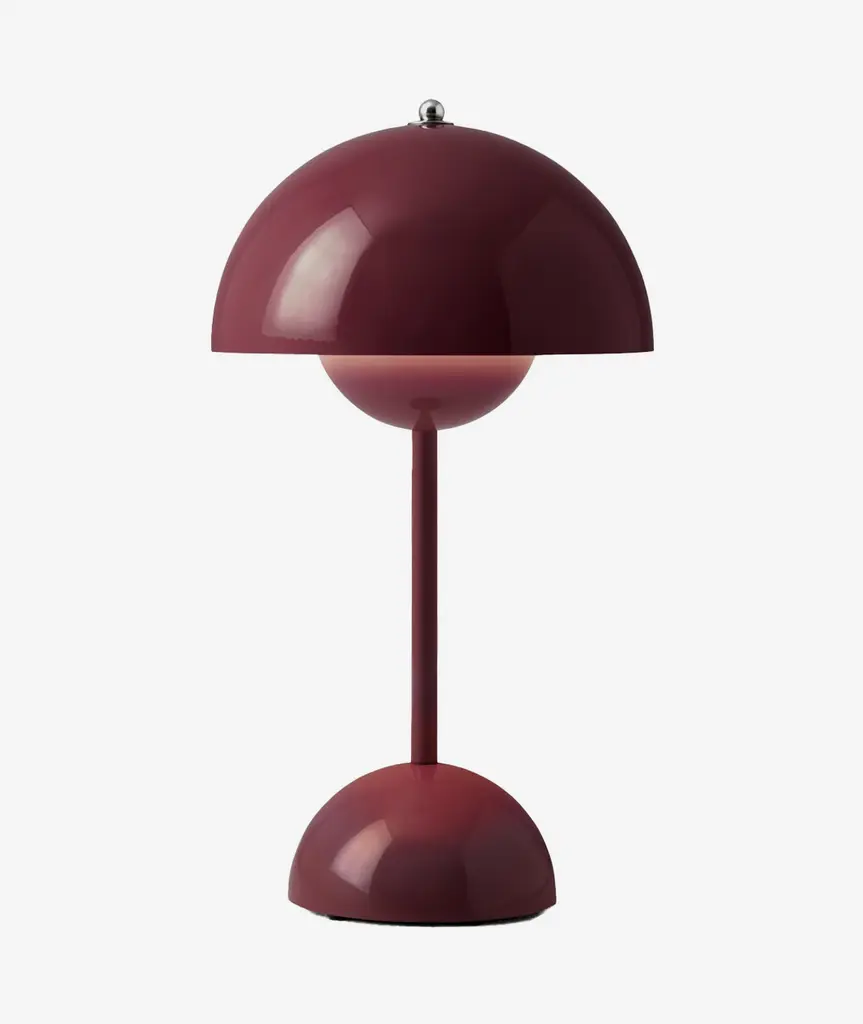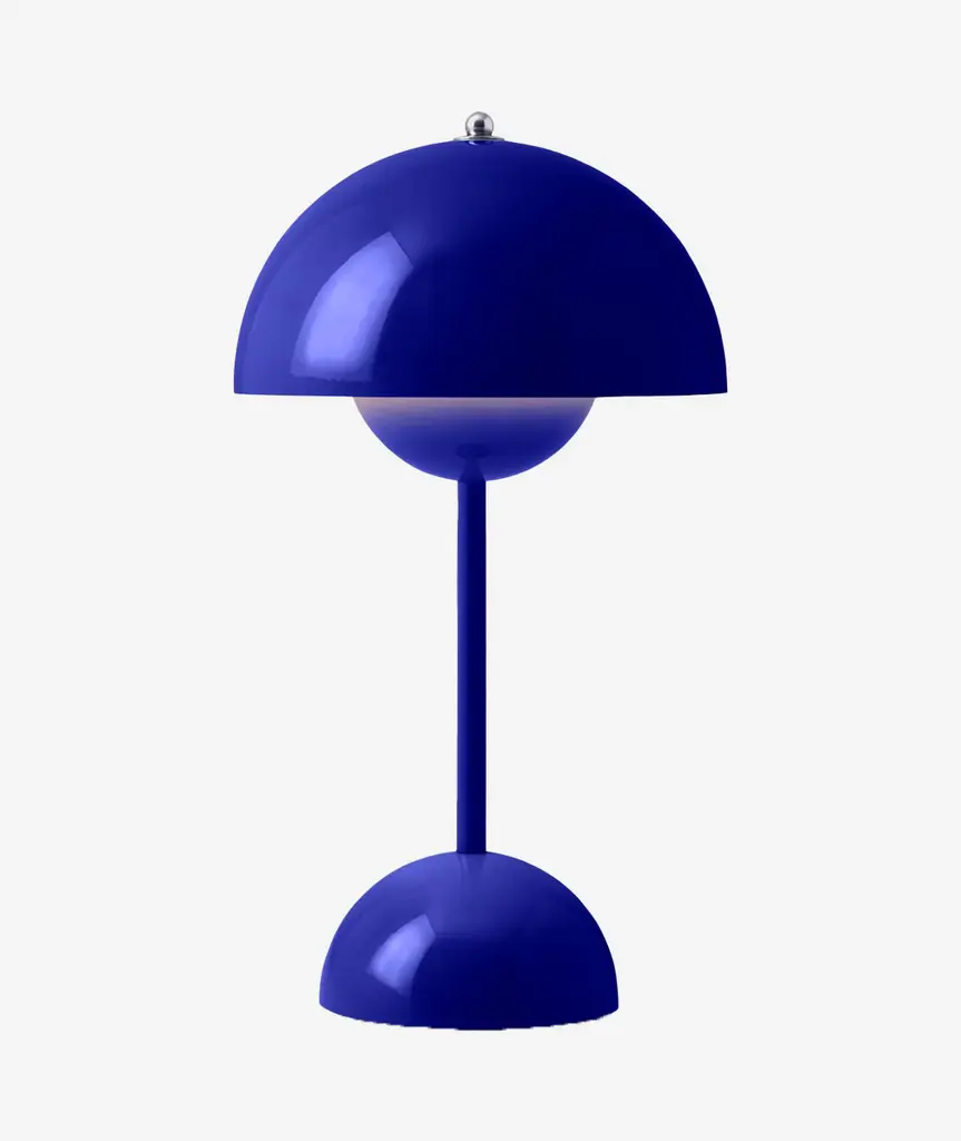 The Flowerpot, a vividly colored lamp with a rounded pendant that hangs from the semi-domed upper shade, embodies the experimental attitude of Verner Panton. Slightly smaller in size than the table lamp version, and deliberately lightweight, the portable VP9 comes equipped with a USB charging cable. It is available in a wide range of contemporary colors and will bring a cozy atmosphere to indoor and outdoor settings.
