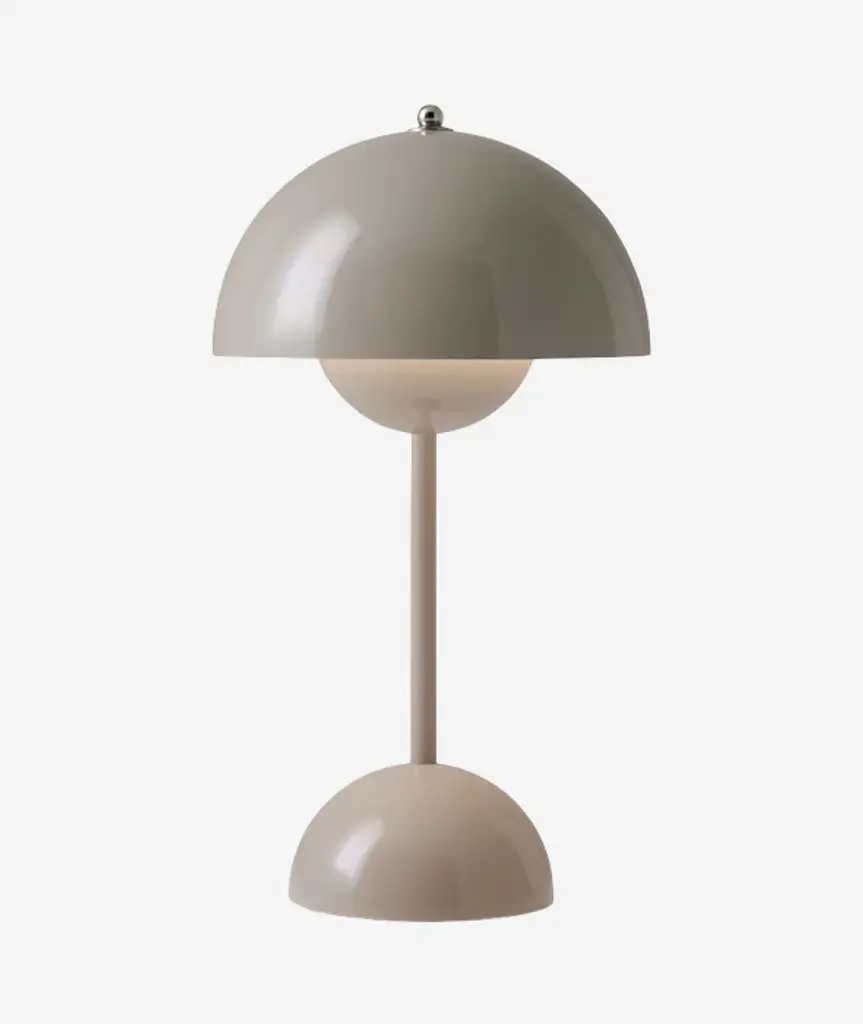 The Flowerpot, a vividly colored lamp with a rounded pendant that hangs from the semi-domed upper shade, embodies the experimental attitude of Verner Panton. Slightly smaller in size than the table lamp version, and deliberately lightweight, the portable VP9 comes equipped with a USB charging cable. It is available in a wide range of contemporary colors and will bring a cozy atmosphere to indoor and outdoor settings.
