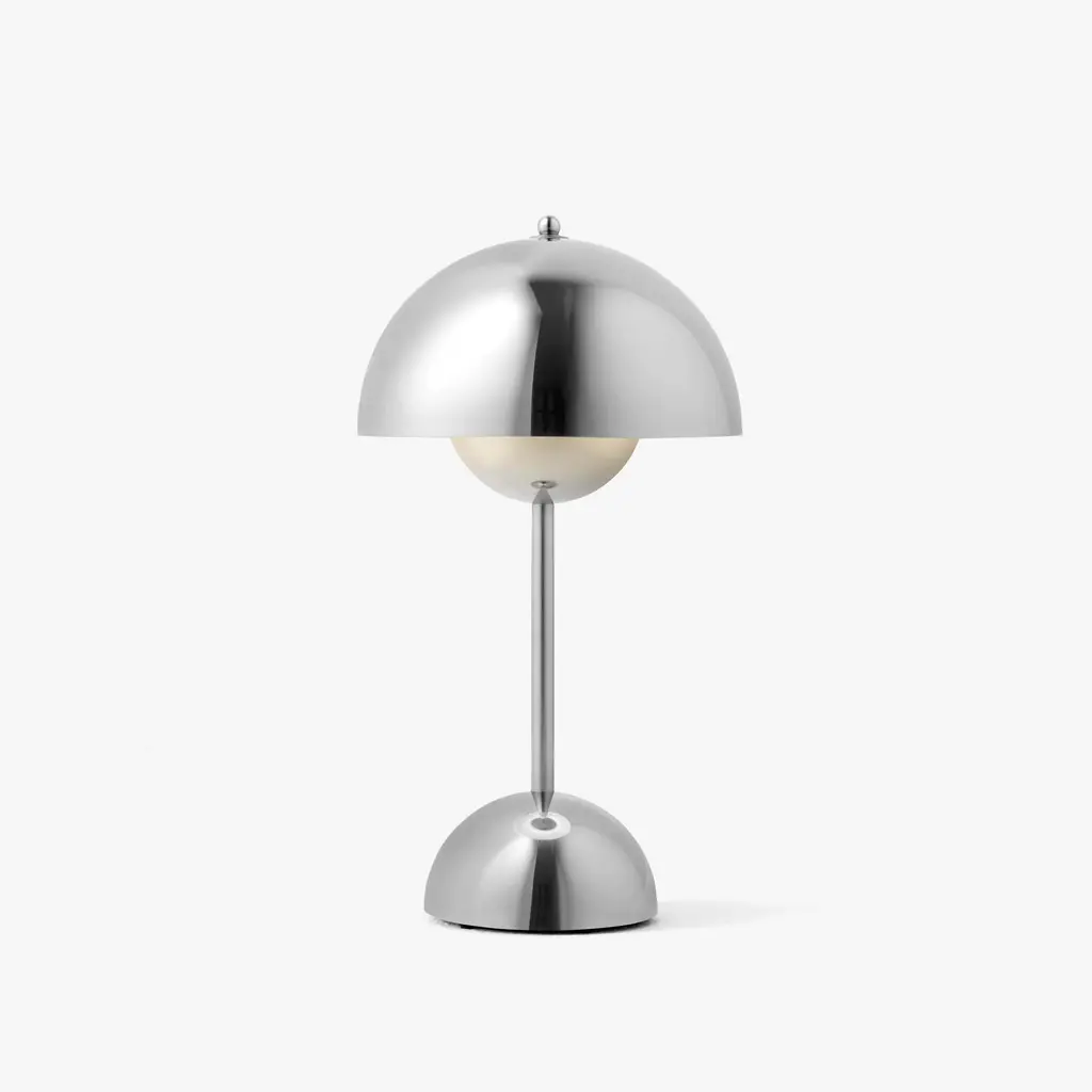 njecting a vibrant splash of color and embracing an elegant, curvaceous design, the Flowerpot VP9 Portable Table Lamp from &tradition revitalizes your desk area or preferred reading corner, embodying a chic vintage modern aesthetic. This work of art was envisioned and brought to life in 1968 by the virtuoso of Danish design, Verner Panton, a name synonymous with innovative and timeless creations. The compact yet impactful design of this lamp makes it an object of admiration, effortlessly blending functionality with visual appeal. Its lightweight structure, combined with a technologically advanced magnetic USB charging cable, empowers you to effortlessly transport it throughout your living or work space. This feature becomes invaluable in our dynamic world where adaptability and mobility are prized. Read more Despite its modest dimensions, the Flowerpot VP9 lamp radiates an immense style quotient. It has the power to illuminate your favorite reading nook, turning the simplest moments into a cozy, personalized experience. Imagine an intimate dinner for two, where the soft, warm glow from this lamp sets the mood, casting subtle shadows that dance across the table. Alternatively, position it on a work desk as a stylish task lamp; its eye-catching design and practical lighting solution will serve as a chic counterpoint, harmonizing with the rest of your room’s decor. A tribute to the timeless appeal of classic modern style, the Flowerpot VP9 Portable Table Lamp is more than just a lighting solution; it’s a statement piece that enhances your space with its bold aesthetics and innovative design. From the home to the office, this lamp is a testament to the enduring legacy of Verner Panton and his commitment to style, function, and flexibility.