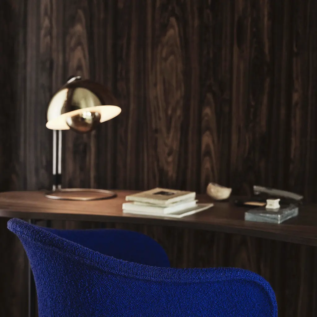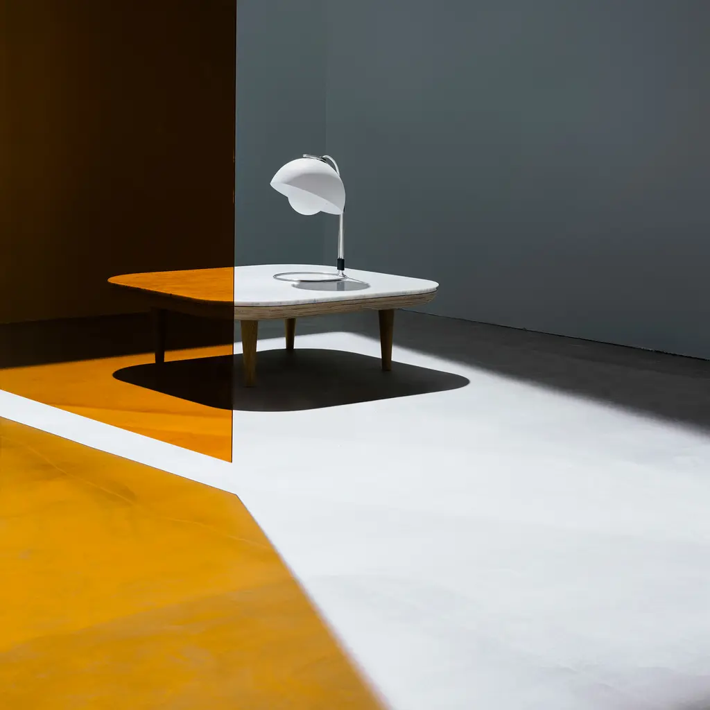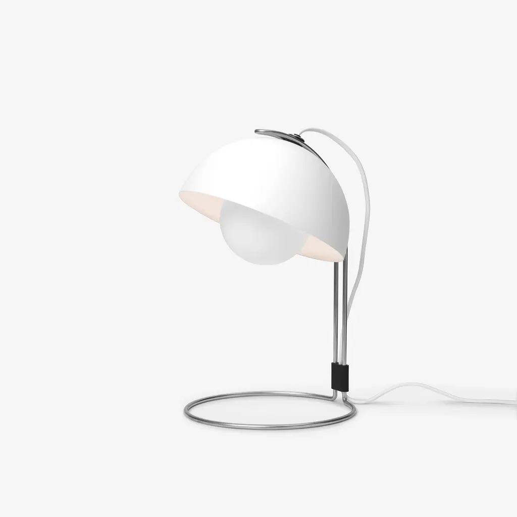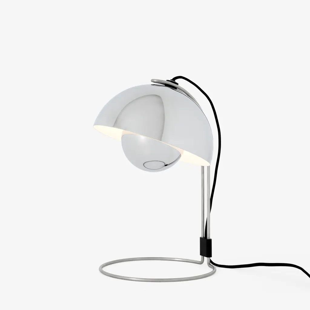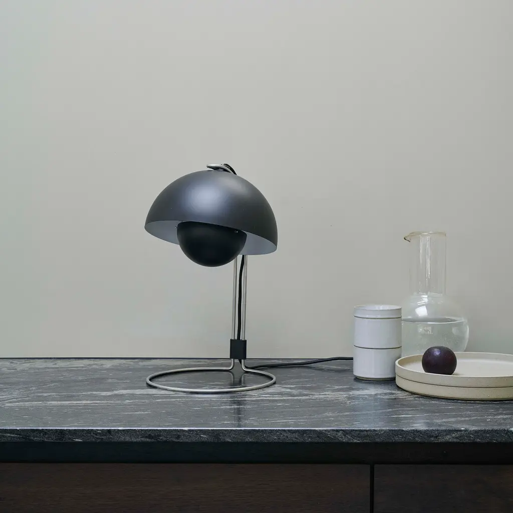 The Flowerpot VP4 table lamp takes the playful yet sophisticated aesthetic of the Flowerpot collection and refines it for a more focused light source. Its modern and sleek design is characterized by two half-spheres facing each other – a visual homage to the peace and love movements of the era in which it was born. The lamp’s top sphere, acting as a diffuser, is slightly smaller than the bottom one, creating a distinct and balanced contrast. Crafted from lacquered steel, this robust lamp maintains a delicate appearance with its curved silhouette and bold color options. Read more The VP4 model provides soft and diffused illumination, making it a perfect addition to any table or desk setup. The lamp measures approximately 36 cm in height and 23 cm in diameter, standing tall yet unobtrusive in a range of interior settings, from minimalistic to mid-century and beyond. Despite its throwback aesthetics, the Flowerpot VP4 is very much a lamp for the modern world. The incorporation of an inline on/off switch on the cable makes it user-friendly, while its compatibility with LED bulbs makes it energy efficient.
