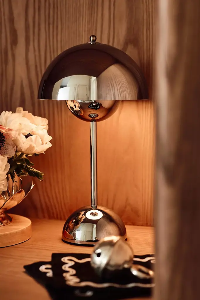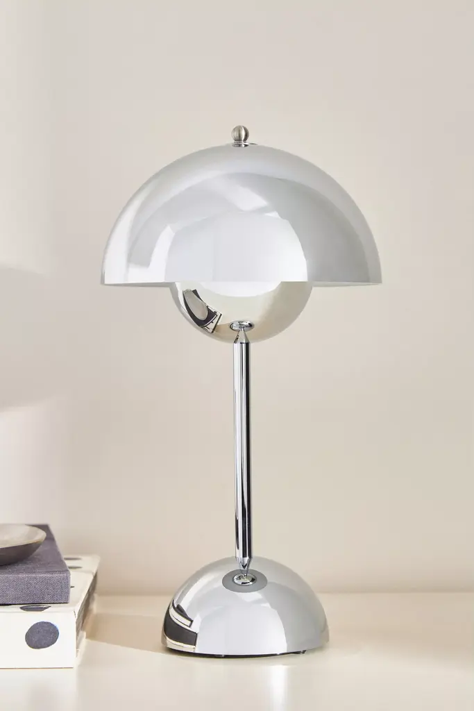 Verner Panton, one of Denmark's most influential 20th-century interior designers, designed this innovative table lamp - featuring a metallic domed design, it is rechargeable and has three dim levels. *This item is UL listed, meaning it has been tested and approved to meet the government-regulated safety standards for the USA. Use with electrical outlets 110-120v or lower, as anything higher can cause fire or injury. If you're purchasing this item for use outside of the United States, employ the adapter and voltage converter suited for your country.*