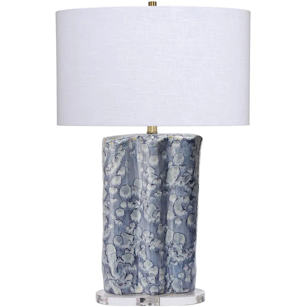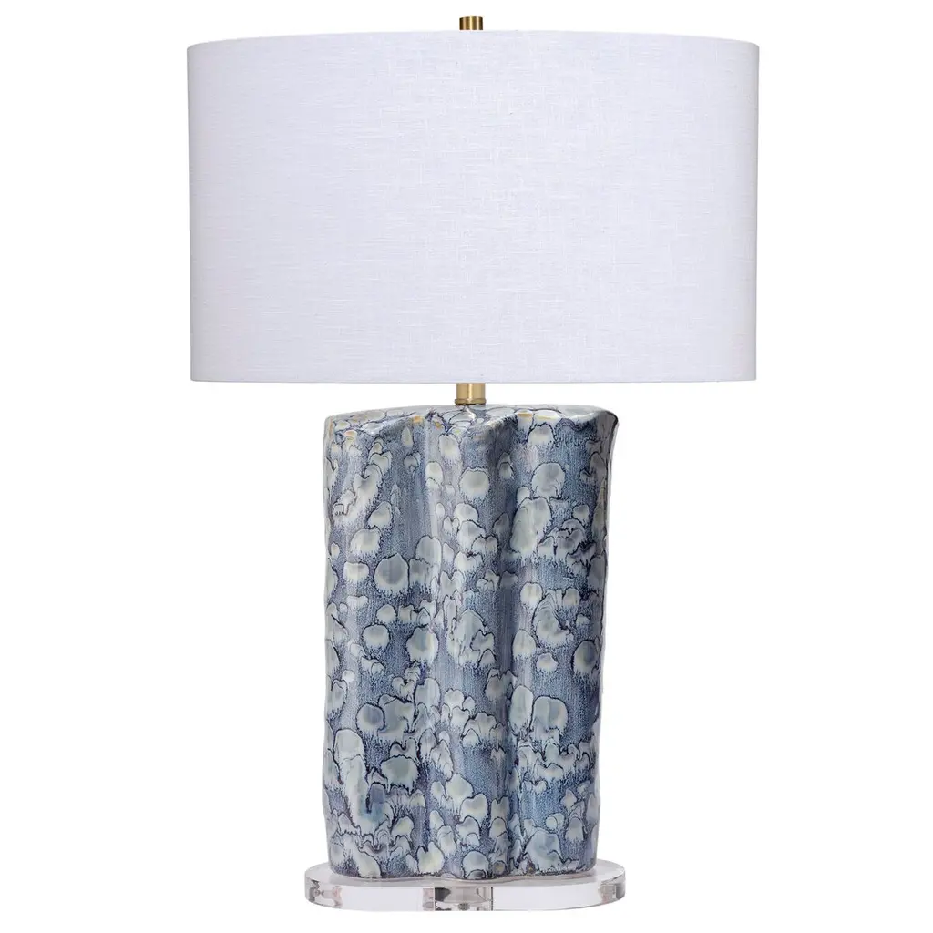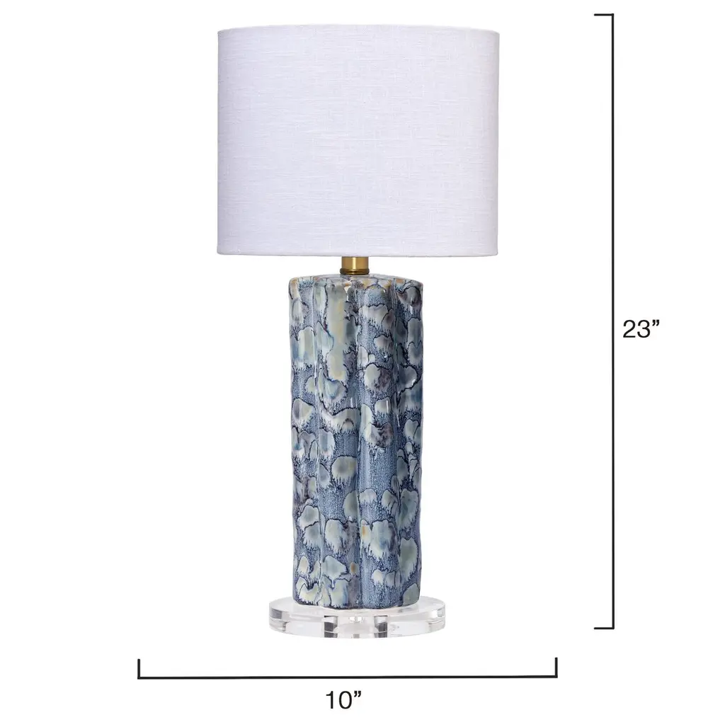 The scalloped body of this ceramic lamp is finished with reactive glazes that have been expertly fired to create vibrant patterns, masterfully updating the traditional color scheme. A thick slice of crystal-clear resin grounds the design, which is topped with an oval shade in linen. We love this displayed as a pair on a mantle.