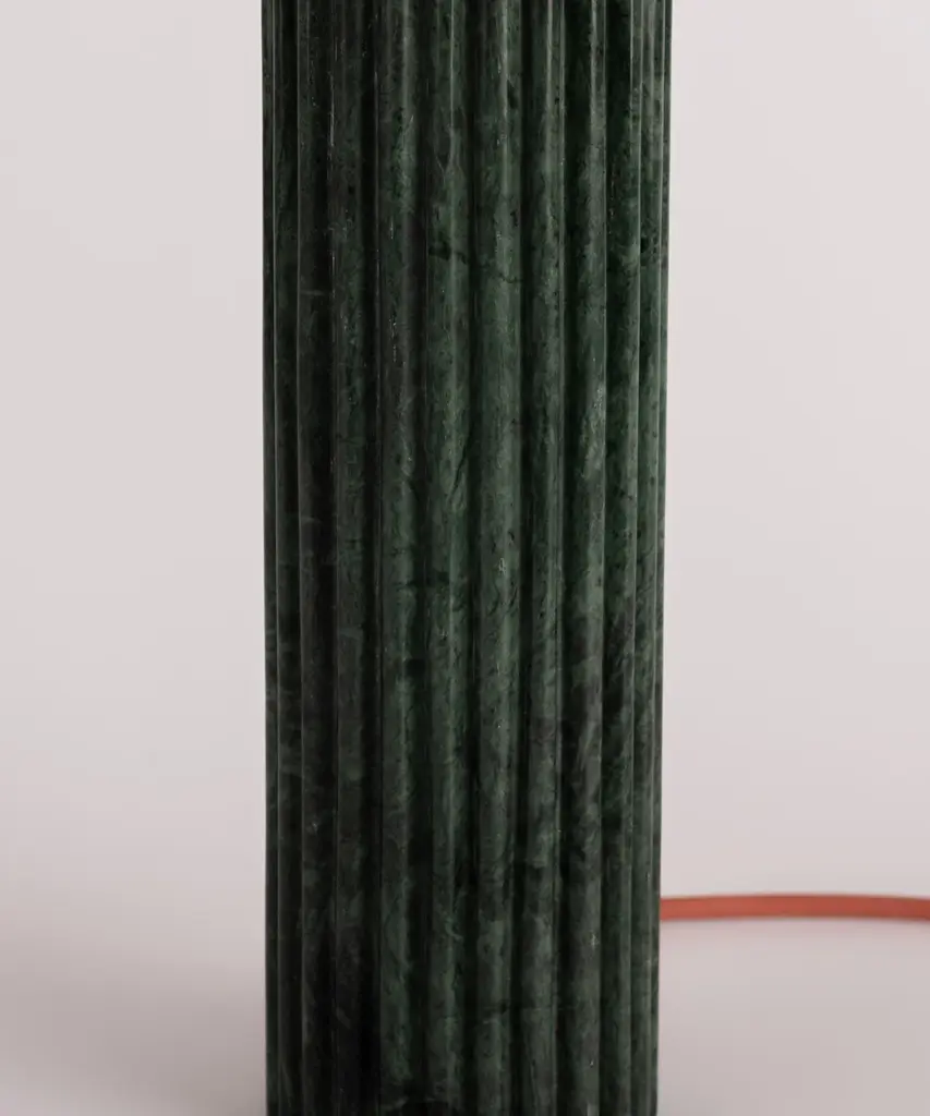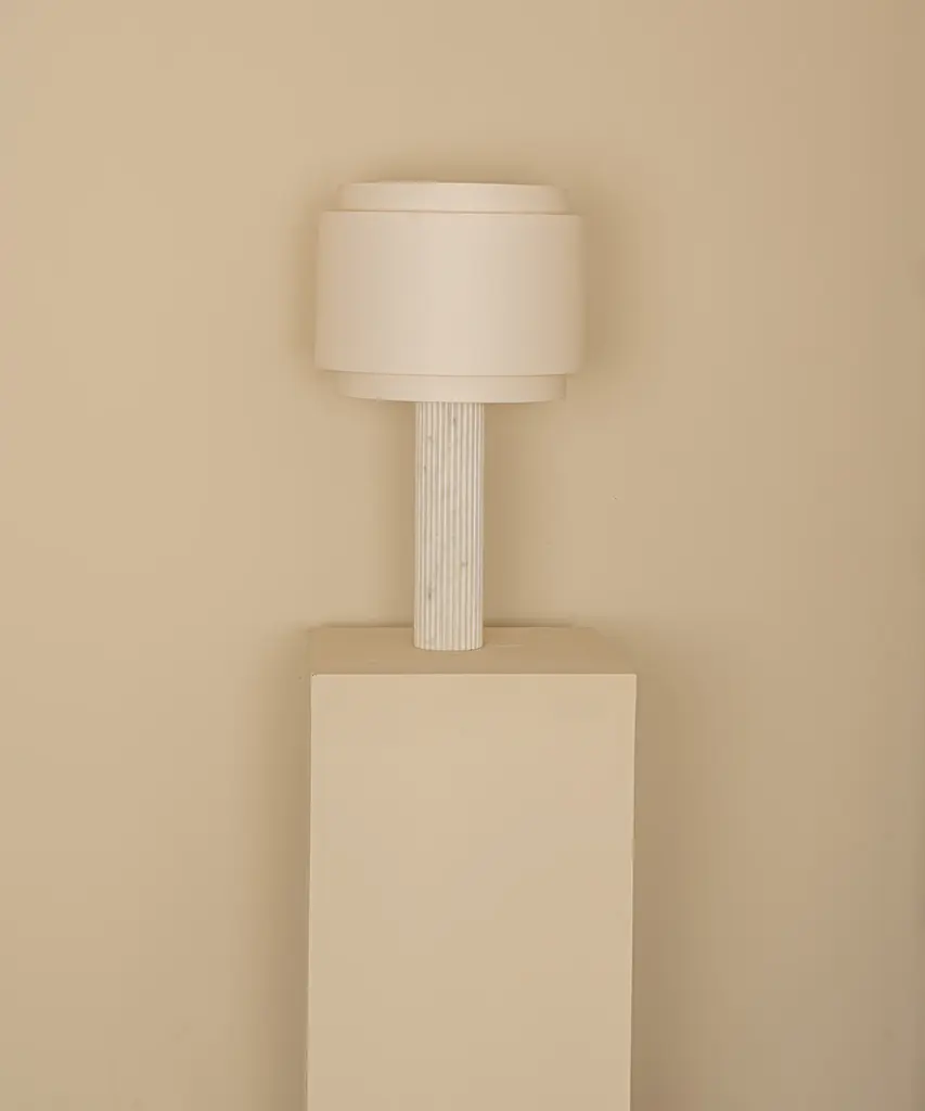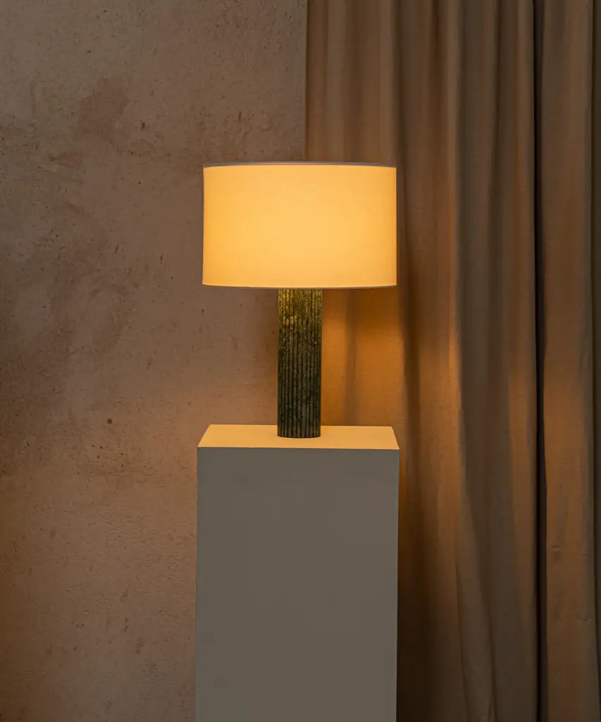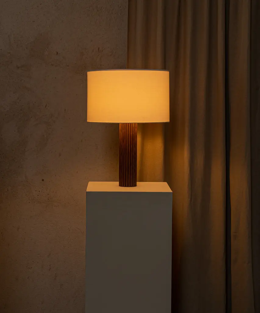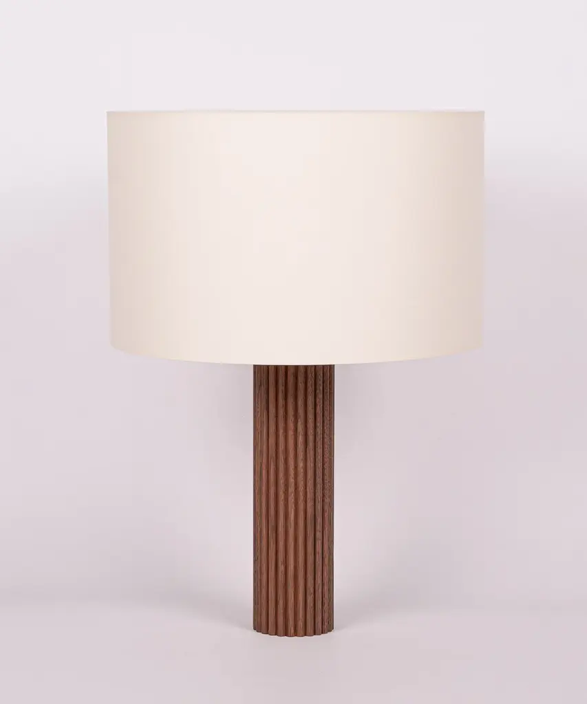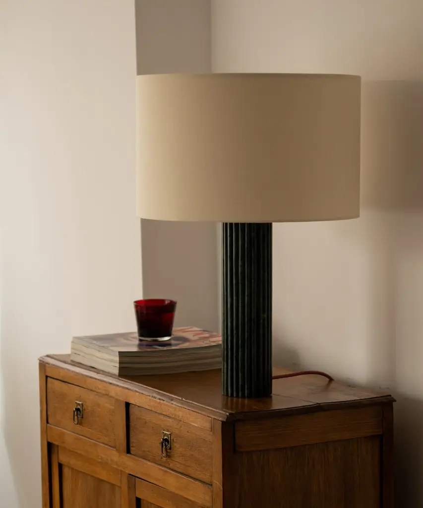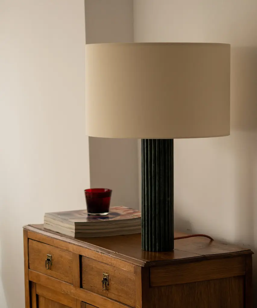 A finely ribbed column and Simone & Marcel's signature cotton drum lampshade make the Fluta table lamp an exceptional and timeless piece. A selection of natural marble and solid wood to choose from for your interior. Each Simone & Marcel lighting fixture is hand-made to order in the designers' studio located in rural Spain. Every product uses only materials and components sourced from local suppliers, all within a short drive of their workshop - an abandoned agricultural warehouse that the couple renovated themselves.