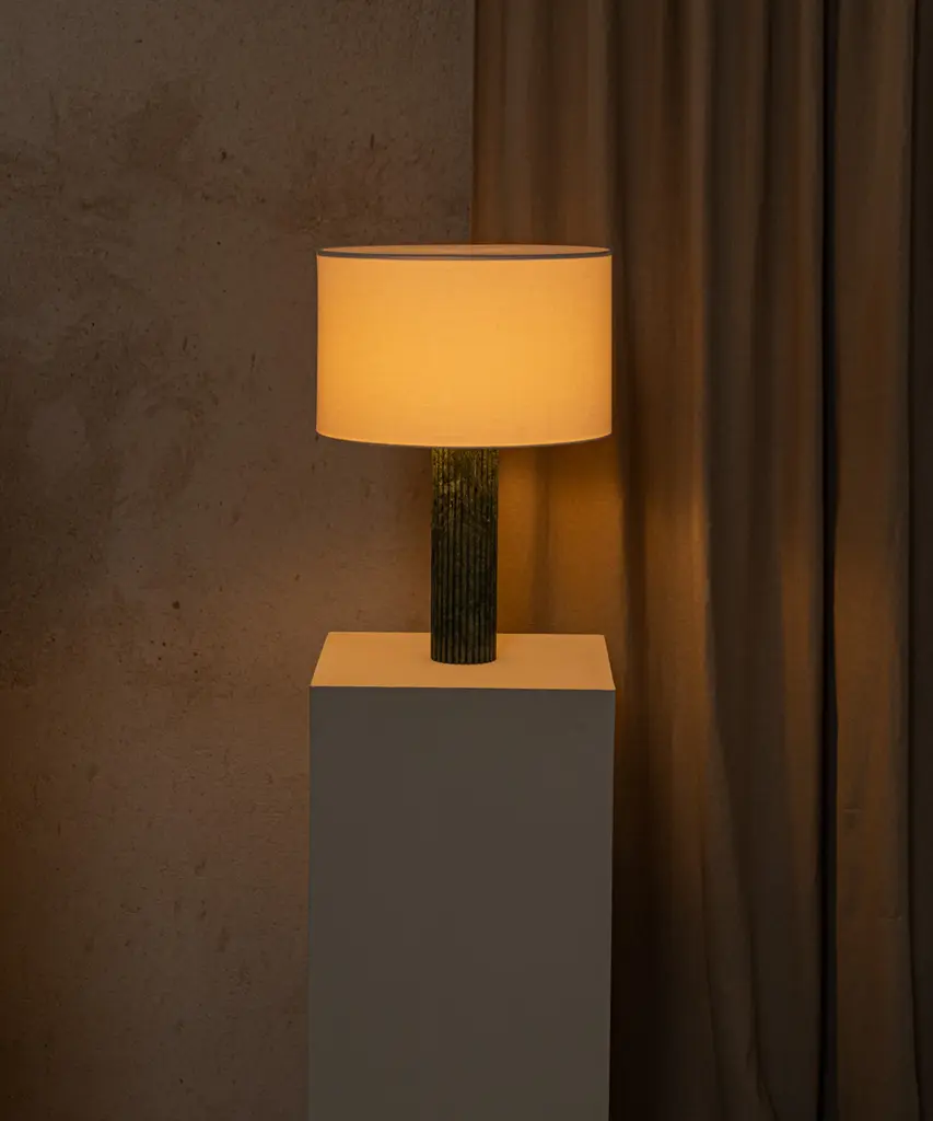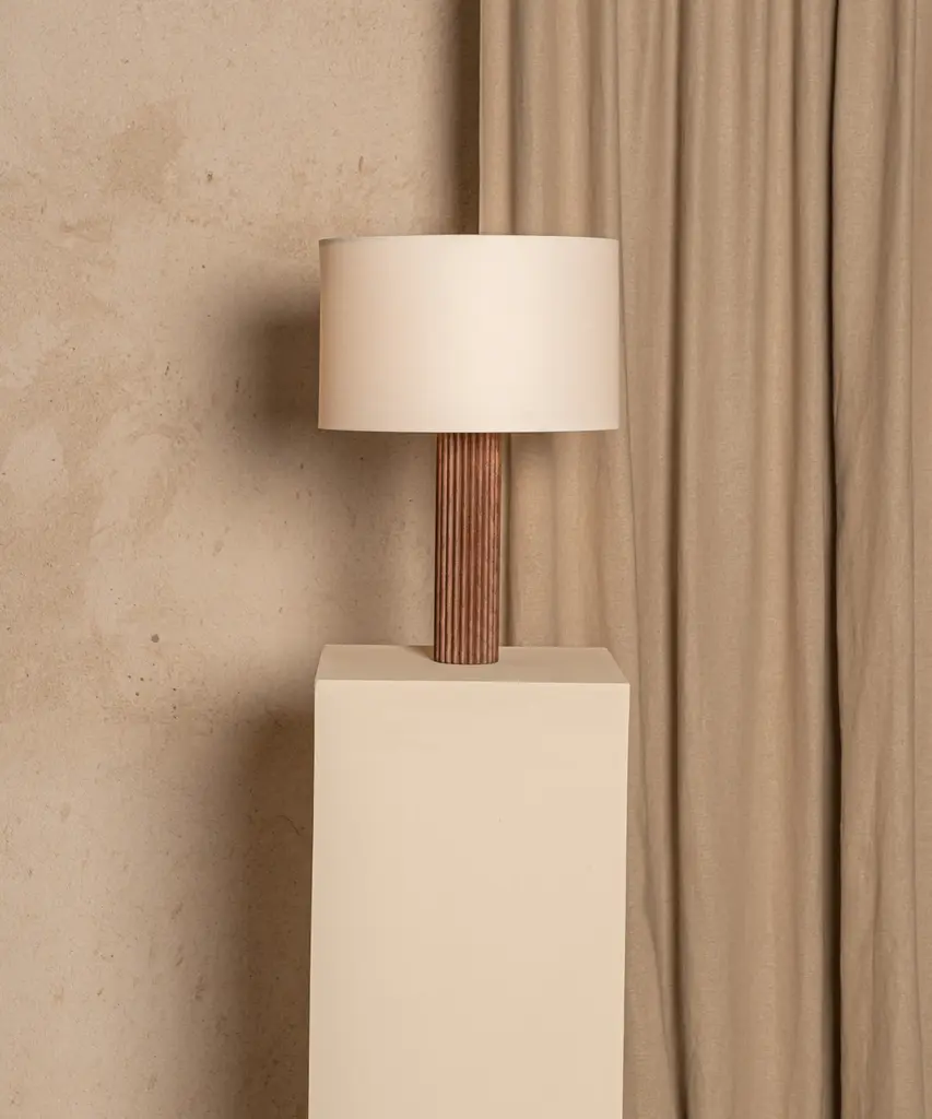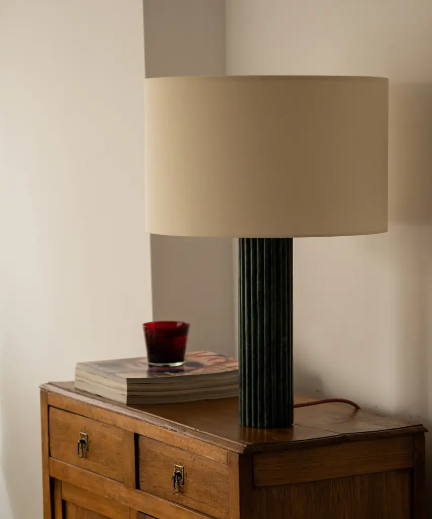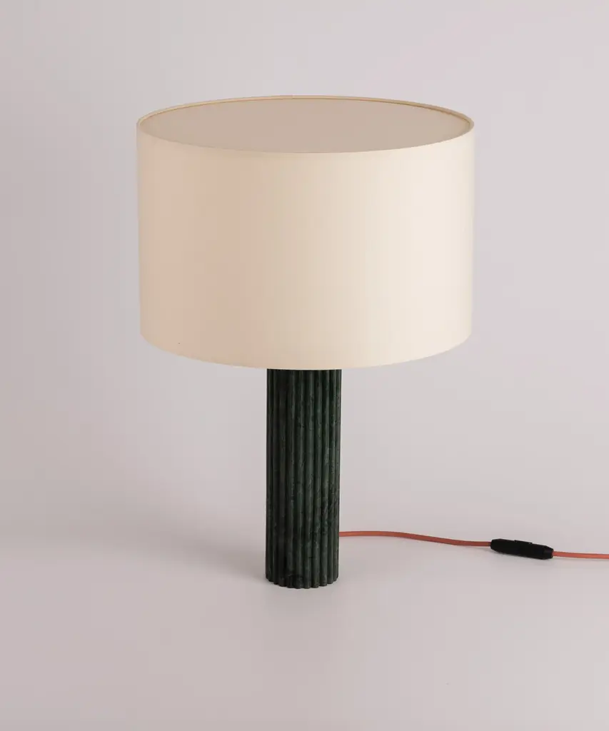 A finely ribbed column and Simone & Marcel's signature cotton drum lampshade make the Fluta table lamp an exceptional and timeless piece. A selection of natural marble and solid wood to choose from for your interior. Each Simone & Marcel lighting fixture is hand-made to order in the designers' studio located in rural Spain. Every product uses only materials and components sourced from local suppliers, all within a short drive of their workshop - an abandoned agricultural warehouse that the couple renovated themselves.