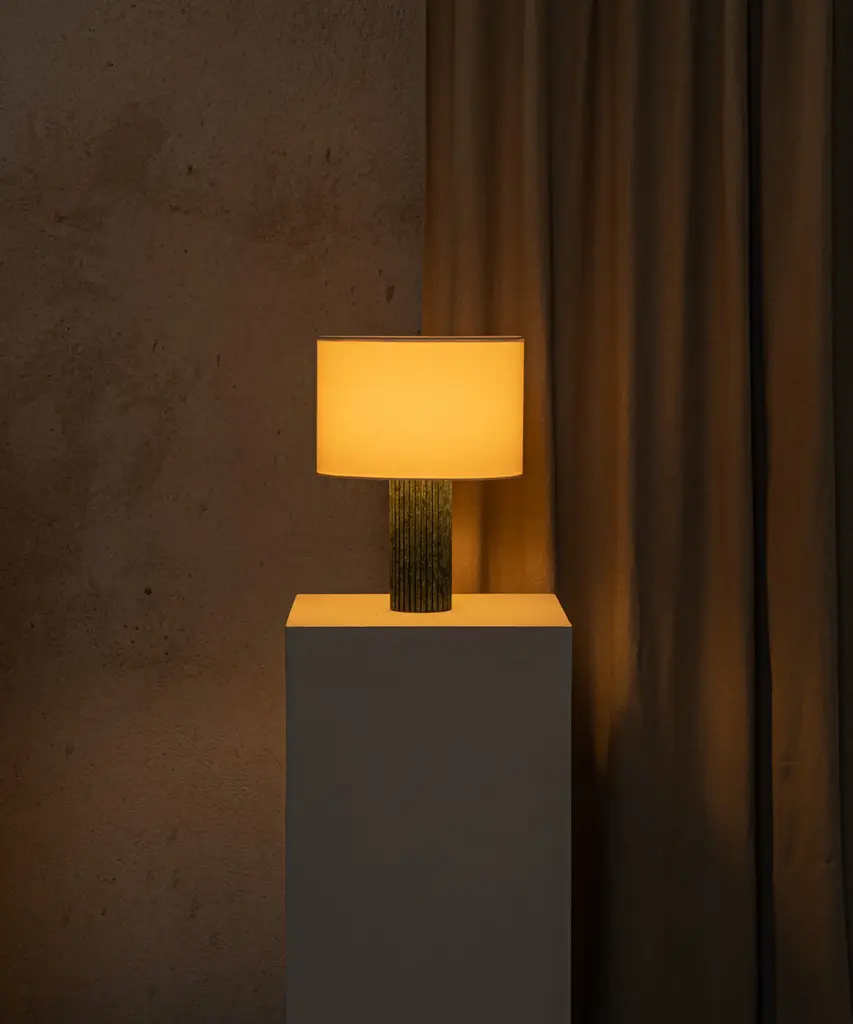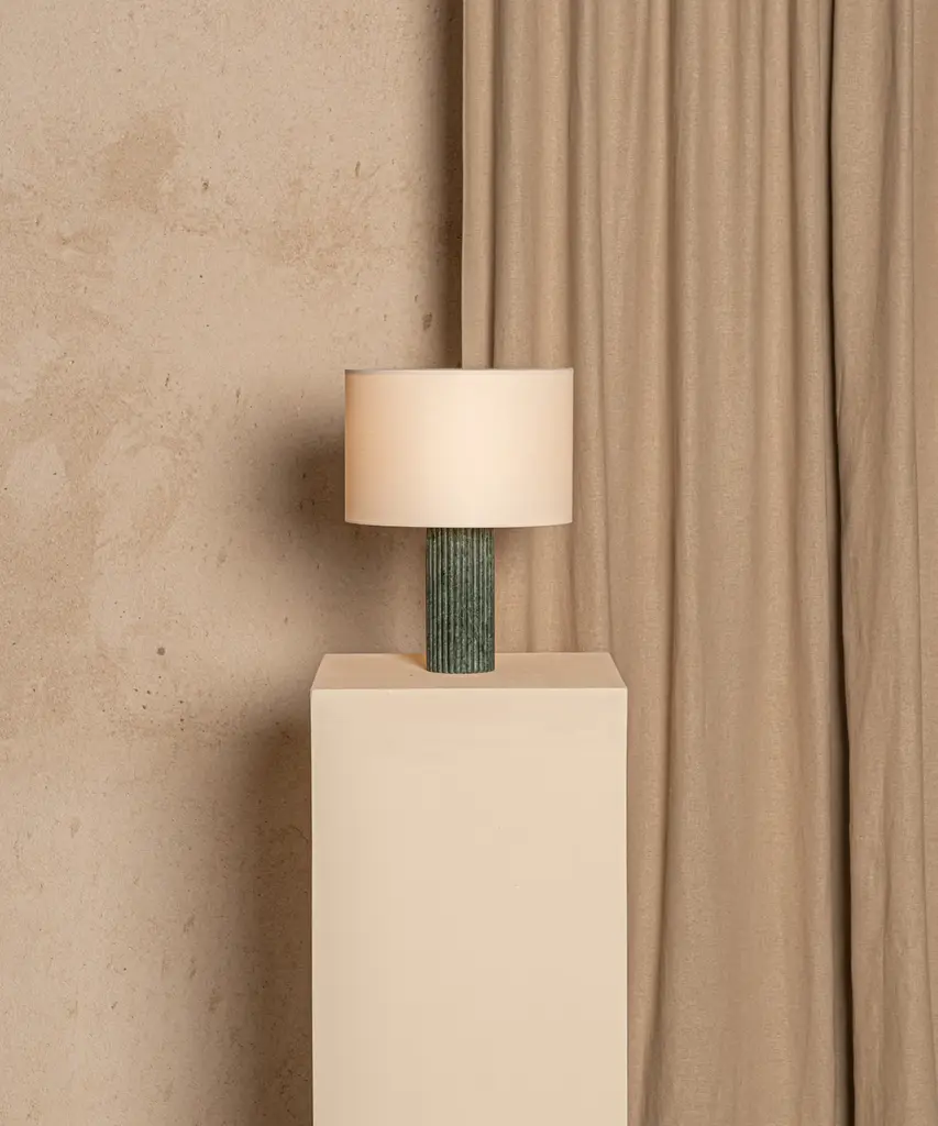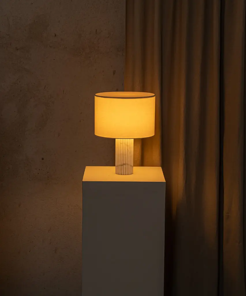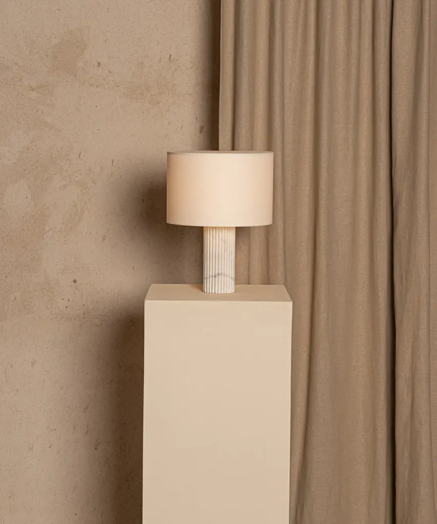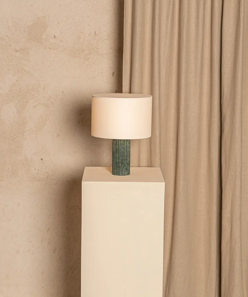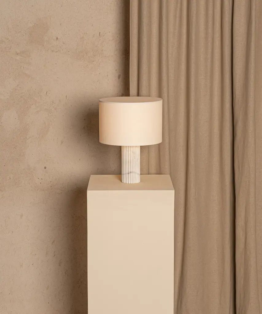 A finely ribbed column and Simone & Marcel's signature cotton drum lampshade make the Flutita table lamp an exceptional and timeless piece. A selection of natural marble and solid wood to choose from for your interior. Each Simone & Marcel lighting fixture is hand-made to order in the designers' studio located in rural Spain. Every product uses only materials and components sourced from local suppliers, all within a short drive of their workshop - an abandoned agricultural warehouse that the couple renovated themselves.