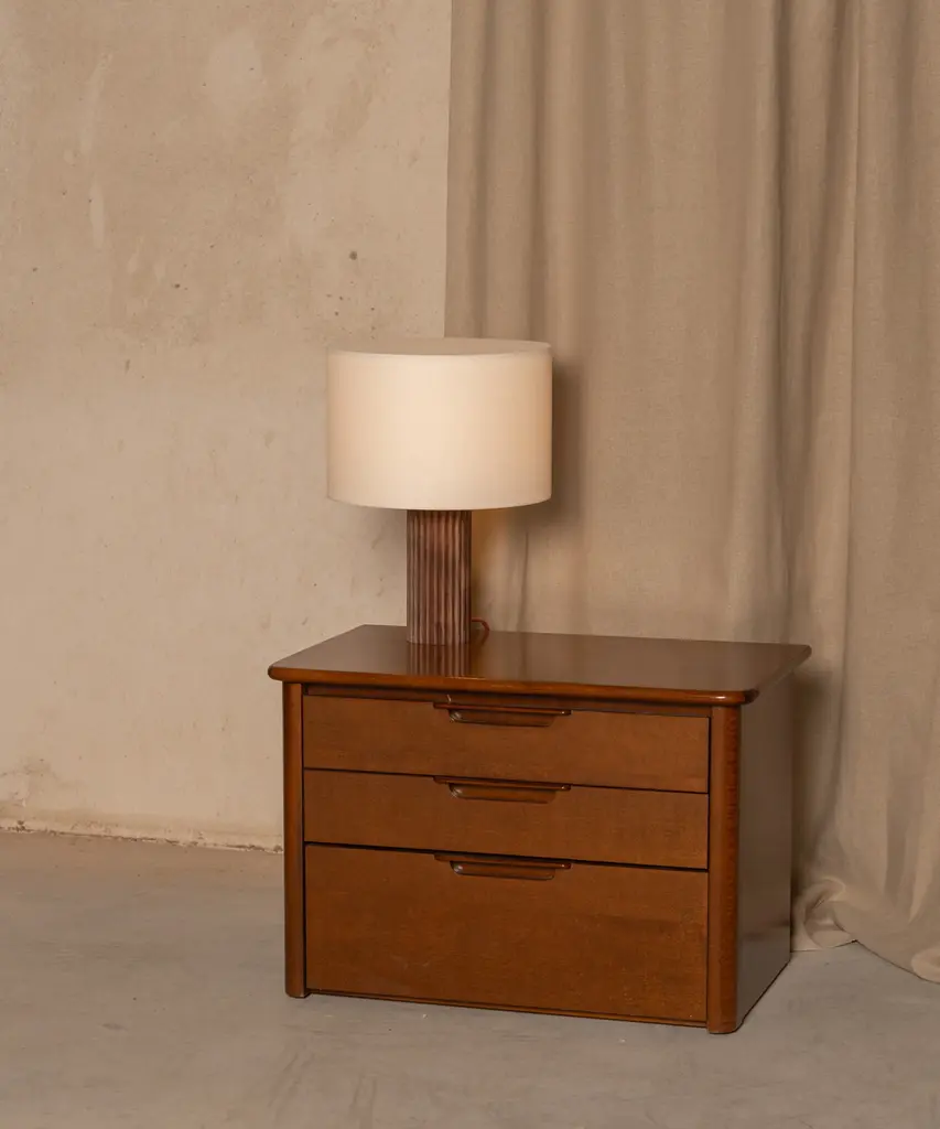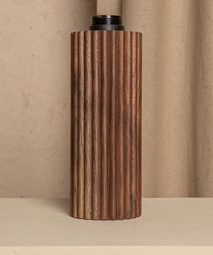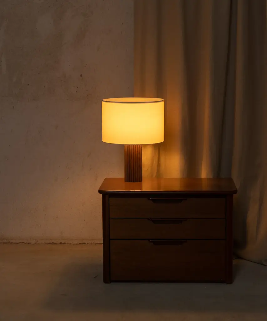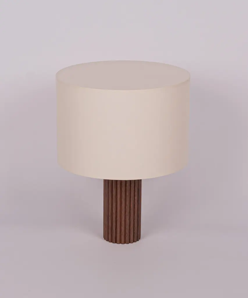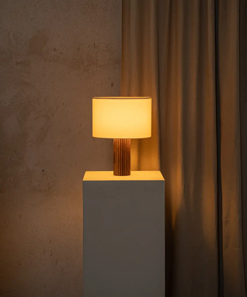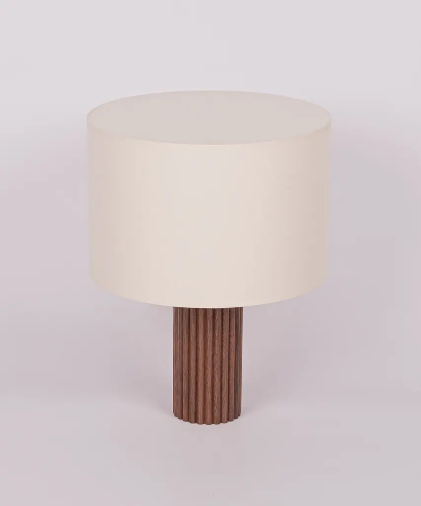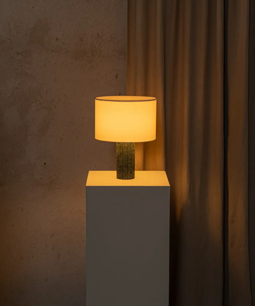 A finely ribbed column and Simone & Marcel's signature cotton drum lampshade make the Flutita table lamp an exceptional and timeless piece. A selection of natural marble and solid wood to choose from for your interior. Each Simone & Marcel lighting fixture is hand-made to order in the designers' studio located in rural Spain. Every product uses only materials and components sourced from local suppliers, all within a short drive of their workshop - an abandoned agricultural warehouse that the couple renovated themselves.
