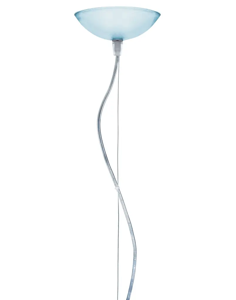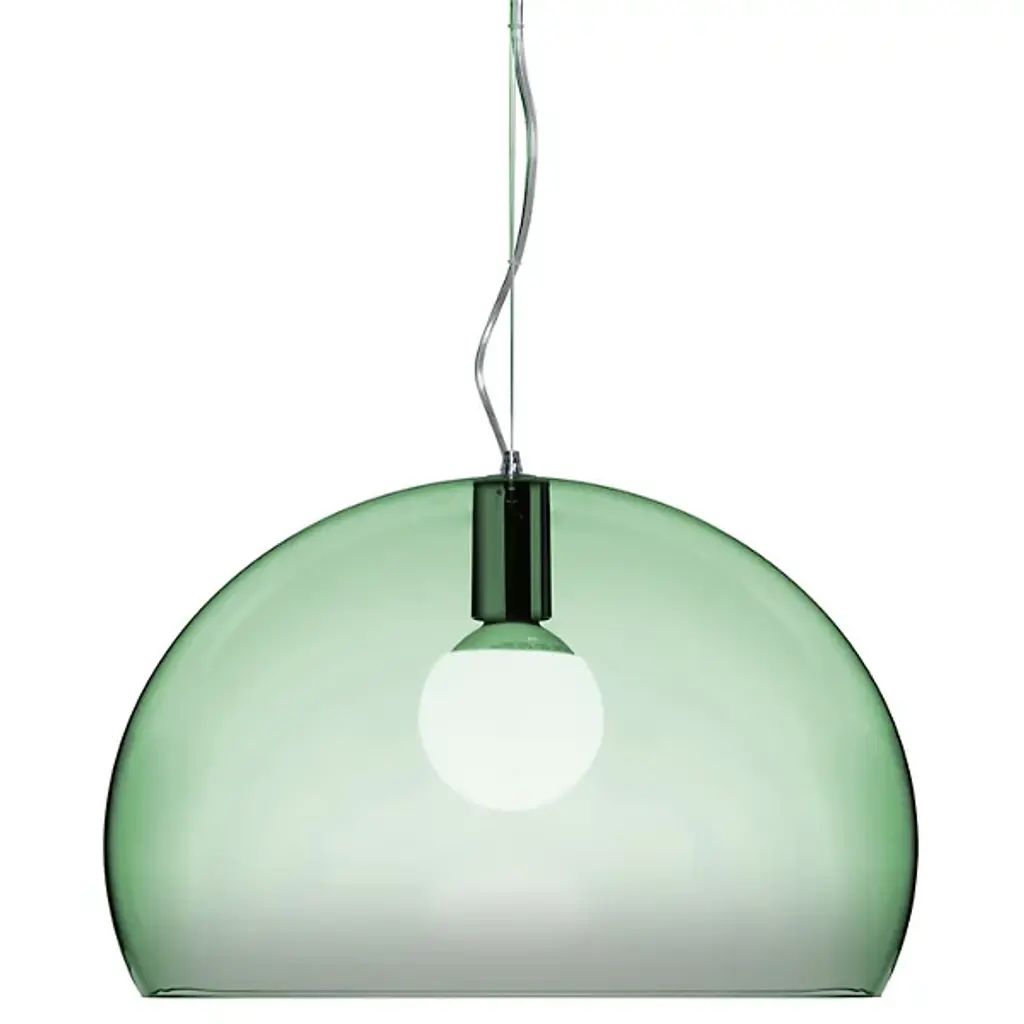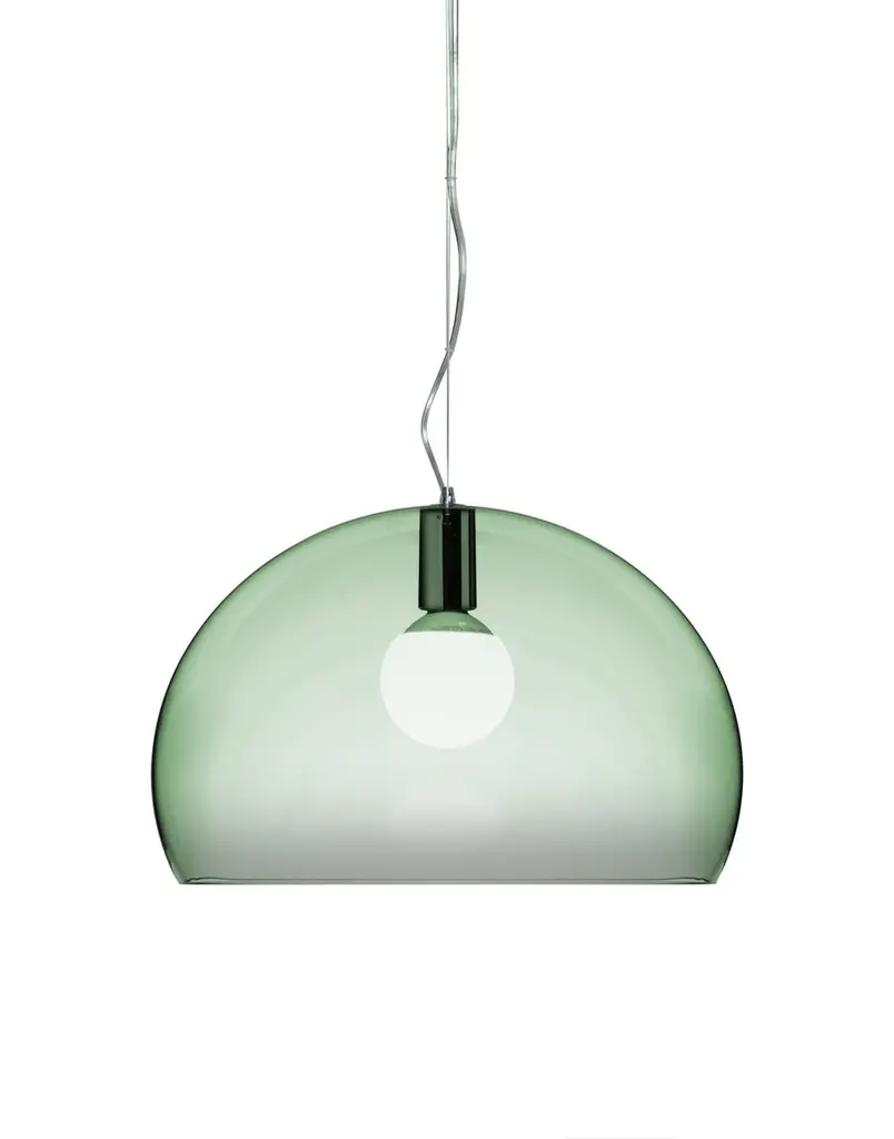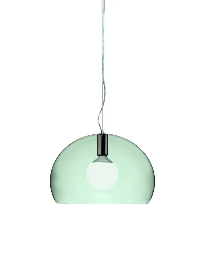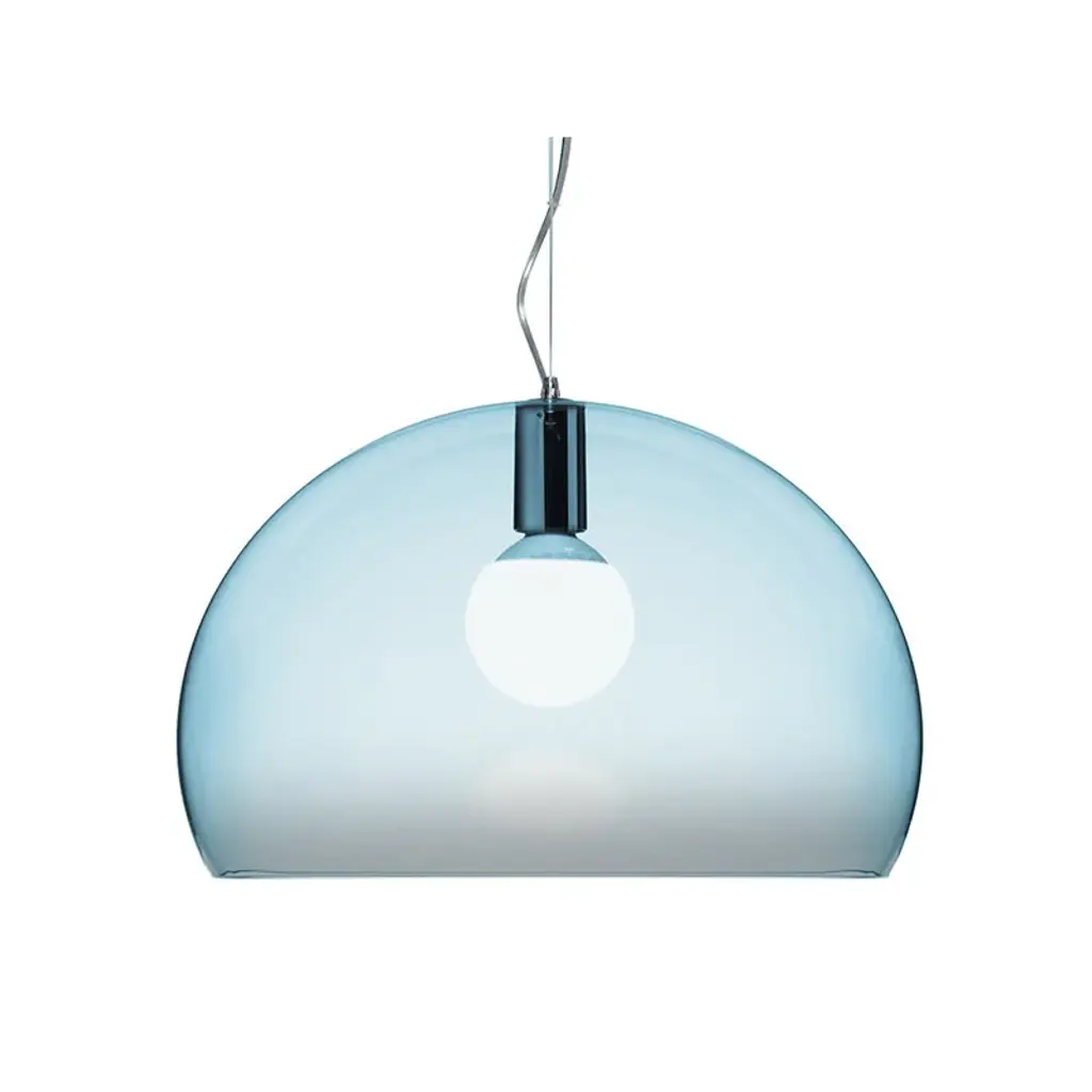 FL/Y is an essentially-styled suspension lamp. The particular transparency of the material and the sheen of the colours recreate the idea of a soap bubble, shimmering iridiscently in the light. The shade is not perfectly hemispherical, with the cut-off falling just below the level of the diameter, offering greater concentration of the light. The lamp is available in three different sizes: Fl/Y (diameter 52cm, shade depth 33cm), Small Fl/Y (diameter 38cm, shade depth 28cm) and Big Fl/Y (diameter 83cm, shade depth 55cm).