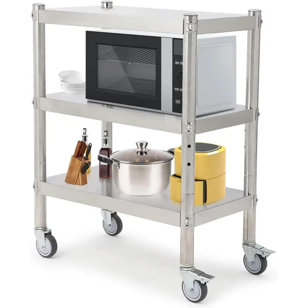 Stainless Steel Utility Cart Heavy Duty - 3-Tier Collapsible Cart with Locking Wheels, 400lb CapacityWhether you’re hauling bulk ingredients in a commercial kitchen, organizing tools in a garage, transporting auto parts in a workshop, or tidying supplies at home, this 3-tier stainless steel utility cart delivers industrial-grade strength, space-saving convenience, and smooth mobility. It’s engineered to transition seamlessly across environments—eliminating the hassle of multiple storage tools while standing up to rigorous daily use.1. Instant Setup Foldable Design: Ready to Use in 10 SecondsNo assembly, no tools, no waiting—this cart is ready to use straight out of the box. Its patented horizontal folding mechanism lets you unfold it in under 10 seconds: simply pull the sides apart, and the frame locks into place automatically. The integrated clamp-lock system adds an extra layer of security, ensuring the cart stays stable and doesn’t collapse during use—critical when hauling heavy loads like full pots of food or bulky tools. When not needed, it collapses to just 5 inches thick, sliding easily into closets, under beds, or in car trunks for compact storage. This "use now, store later" design makes it perfect for small spaces (like apartment kitchens) or on-the-go tasks (like catering or mobile repairs).2. Commercial-Grade 304 Stainless Steel Construction: Rust & Impact ResistantBuilt for durability, the cart features 18-gauge 304 stainless steel—the gold standard for commercial use. This material resists rust, corrosion, and chemical damage, so it holds up to spills (like oil in garages or sauce in kitchens) and frequent cleaning (even with harsh commercial cleaners). The frame is reinforced with cross-bracing and dual-side support pillars to prevent wobbling, even when loaded to its 400lb capacity. Each shelf has 1.2mm thickened panels that withstand heavy impacts—no dents from dropping tools or stacking heavy containers. Unlike plastic carts that crack or warp, this stainless steel cart maintains its shape and performance for years, making it a reliable investment for commercial and home use alike.3. Premium 360° Mobility System: Smooth, Quiet, and SecureManeuvering heavy loads is effortless thanks to the cart’s 4-inch dual-wheel casters (two with locking brakes). The casters rotate 360 degrees, letting you navigate tight spaces—like between kitchen islands or around workshop equipment—with precision. Each wheel has high-load bearings that support up to 100lbs (400lbs total), so the cart glides smoothly even when fully loaded. The non-marking rubber treads protect floors (no scratches on hardwood or tile) and operate quietly—critical for busy commercial kitchens or home environments where noise is a concern. When you need to stop, the locking brakes secure the cart in place, preventing accidental rolling while you load, unload, or work.4. Optimized 3-Tier Storage: Fits Bulk & Large ItemsWith three 36" x 16" shelves (25 inches deep), this cart offers ample space for bulk storage—think 5-gallon buckets of cleaning supplies, stacks of auto parts, or full sheet pans of food. The 16-inch clearance between tiers is designed to fit large items: stand mixers, power tools, or tall containers of flour or oil. An integrated ergonomic handle on the side provides a comfortable grip for pushing or pulling, reducing strain on your back and arms. The open-shelf design lets you see and access items quickly—no digging through closed cabinets—and makes cleaning easy (just wipe down the stainless steel surfaces). Whether you’re organizing a garage, stocking a kitchen, or transporting workshop supplies, this storage layout maximizes efficiency.5. Multi-Environment Versatility: NSF-Certified for All TasksThis cart isn’t limited to one use—it’s engineered for versatility across environments, with NSF certification(meeting strict food safety standards) for commercial kitchens. Here’s how it shines in different spaces:• Commercial kitchens: Haul ingredients, serve food, or store cookware—resists food spills and easy to sanitize.• Garages/workshops: Organize tools, auto parts, or paint—oil and gasoline resistant, stands up to heavy tools.• Homes: Tidy cleaning supplies, baby gear, or pantry items—collapsible for small storage spaces.• Catering/mobile services: Transport food or equipment to events—lightweight enough to carry, sturdy enough for outdoor use.Its ability to adapt to almost any task eliminates the need for multiple carts, saving you money and storage space.