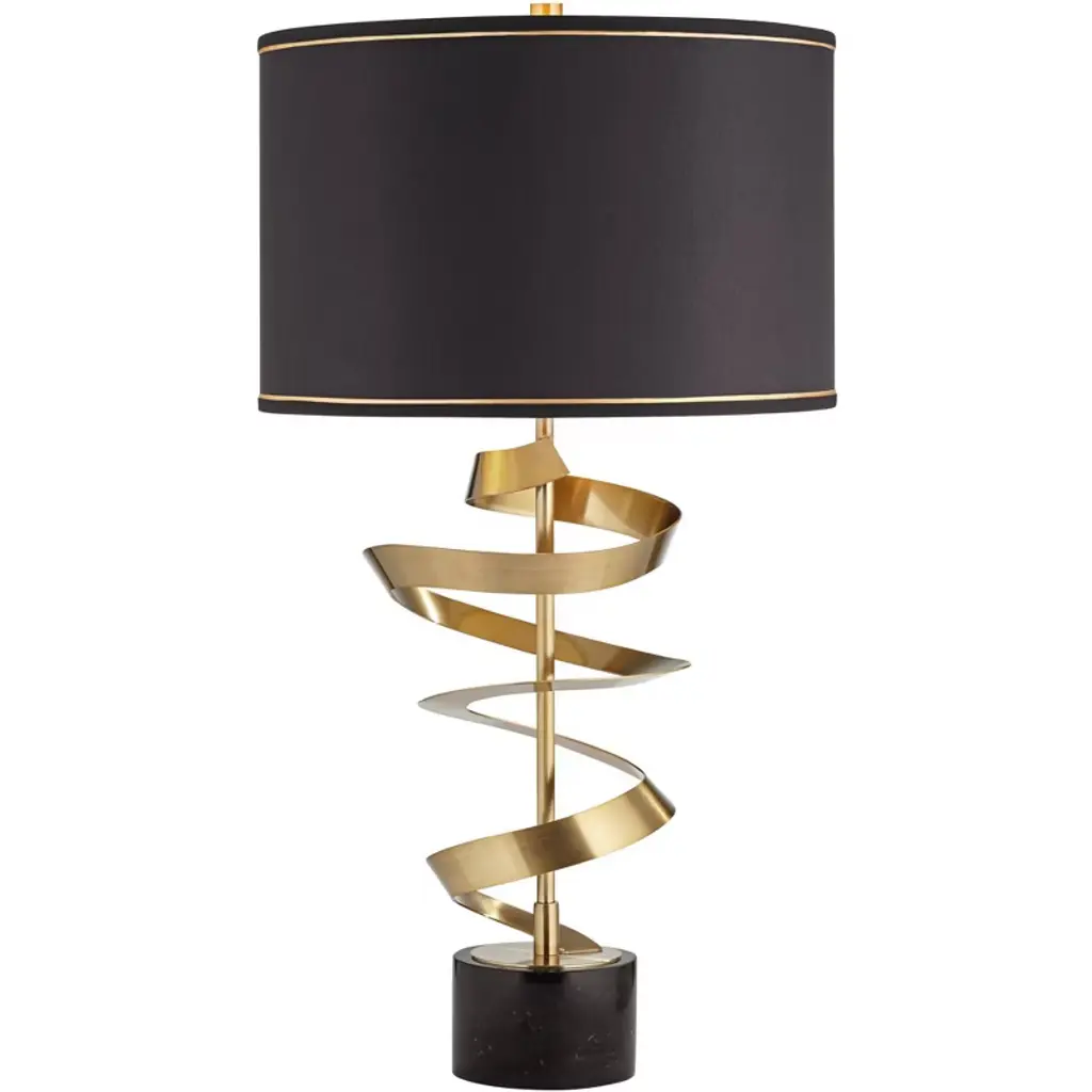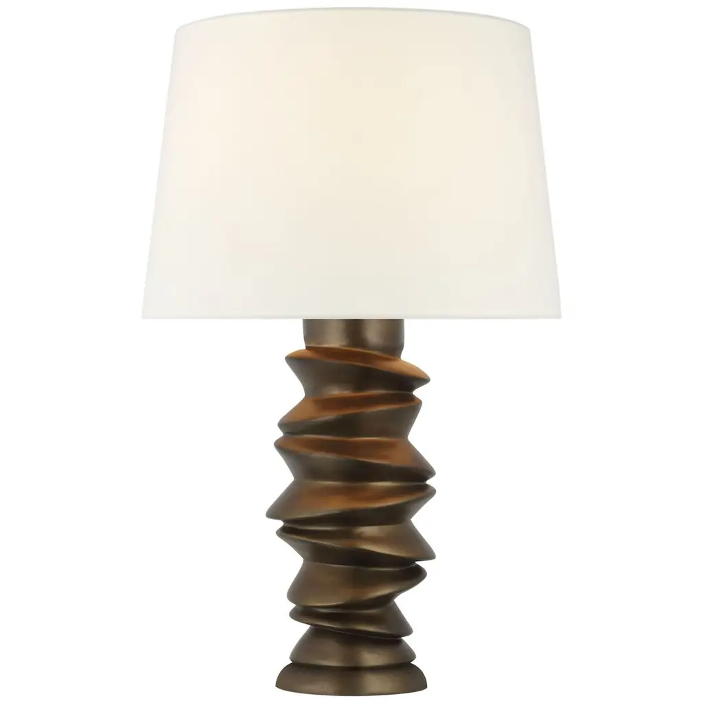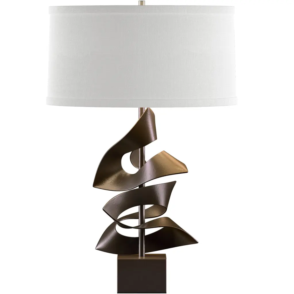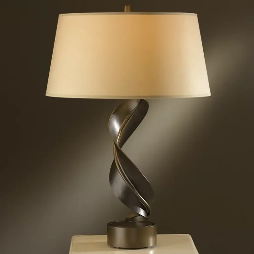 A simple swirling silhouette lends effortless elegance to the Hubbardton Forge Folio Table Lamp. Hand-forged wrought iron is fashioned into a loose spiral with a central rod and round base providing textural contrast. Topping the delicately curved body is a slightly flared empire shade whose smooth fabric creates a neatly tailored effect.
