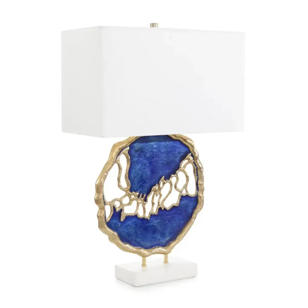 The Fondere Table Lamp is a stunning work of abstract art that introduces vivid hues and ethereal shapes to an interior space. Crafted from metal with an enamel coating, the piece takes on a circular shape with gorgeous shades of blue intermingling with opulent strands in a champagne gold finish, additionally showcasing a masterful use of negative space that greatly enhances any décor. The piece gently rests atop a rectangular base of white marble, accented with brass hardware and matching puck finial.