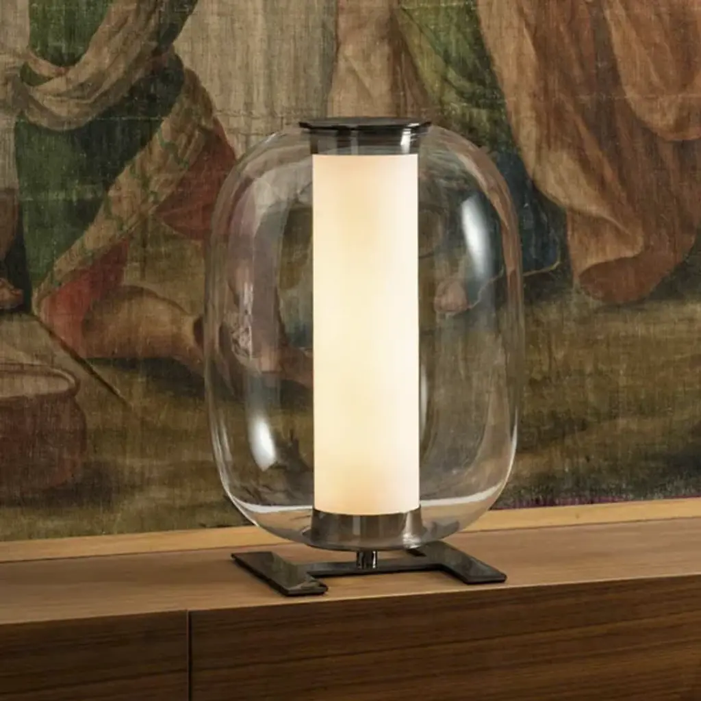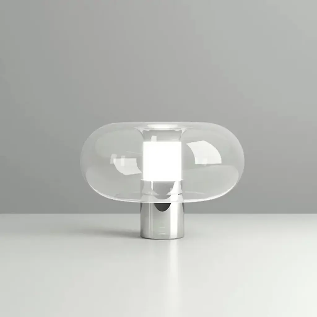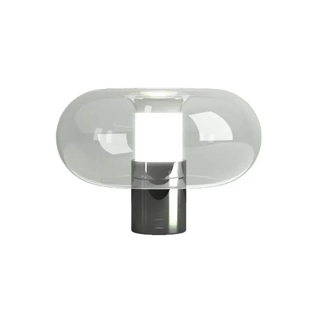 The Fontanella Table Lamp from FontanaArte presents personalized Italian craftsmanship, showing off luminous artistry. Designed by Federico Peri, this contemporary masterpiece marries a rounded shade of crystalline glass with a simple central structure of galvanized metal. Skilled artisans meticulously unite a sandblasted inner tube set around the lamping with a bubble-shaped exterior of blown glass, creating an ethereal fusion of transparent and satin finishes. Each handcrafted piece shows the refinement of Italian glassworking expertise, transforming direct light into a sophisticated ambiance.