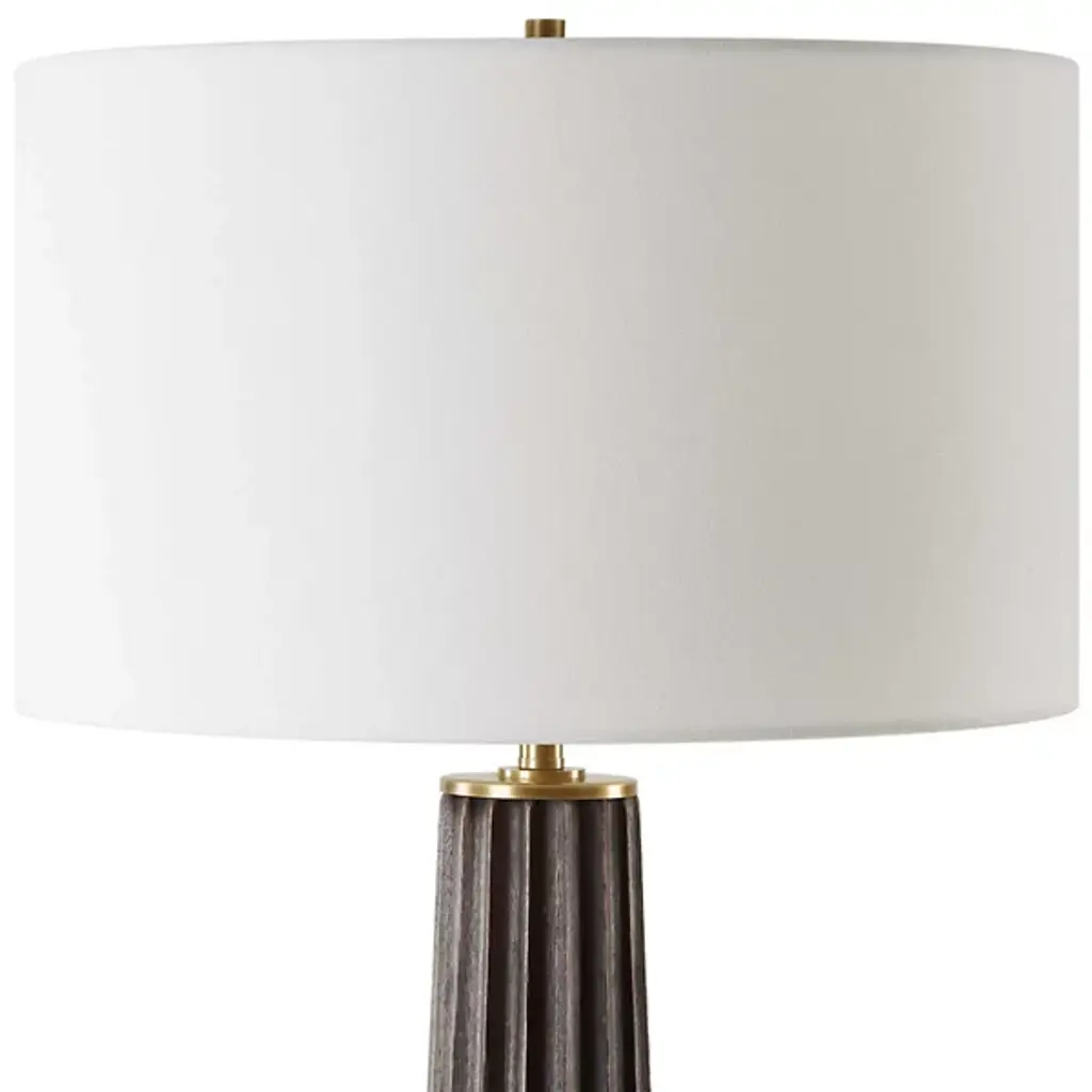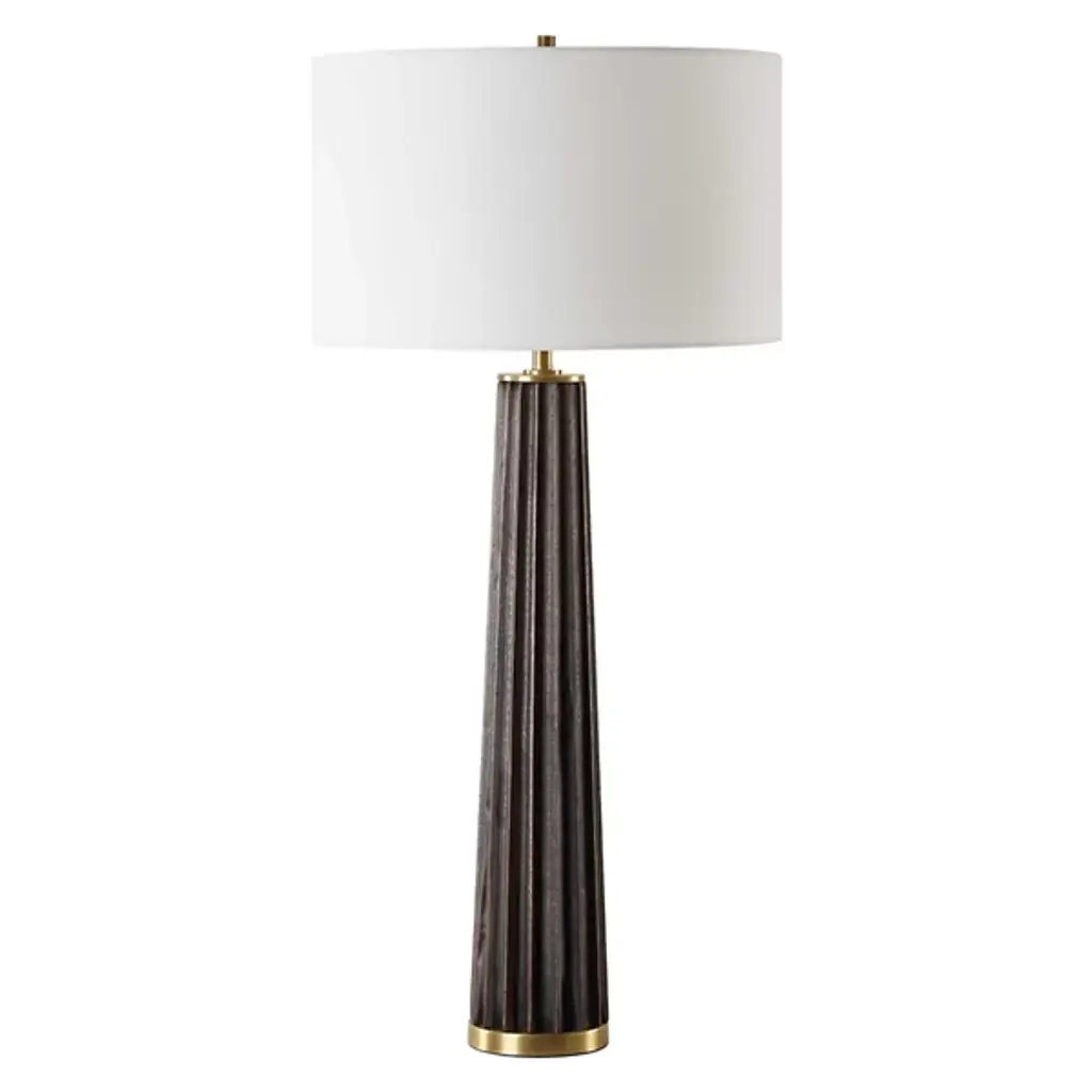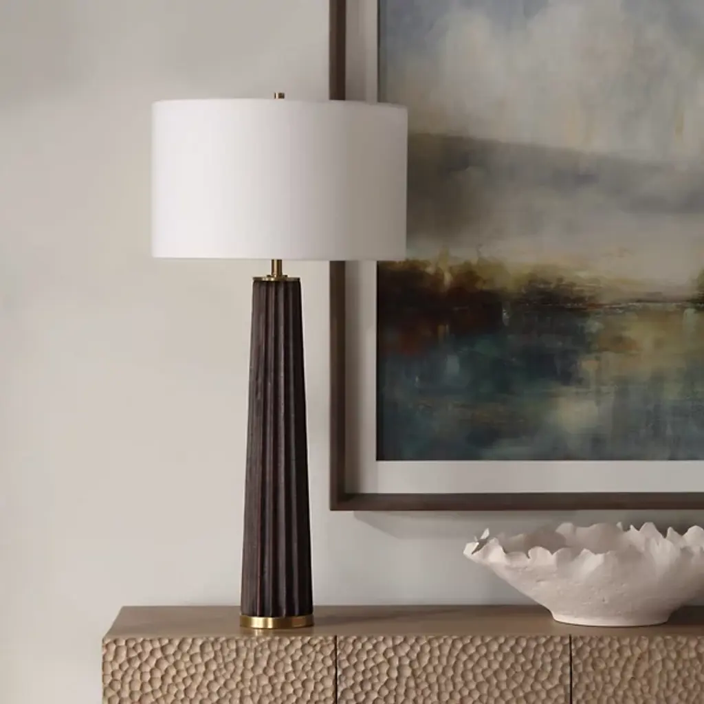 The Forage Table Lamp from Uttermost beautifully blends Mid-Century Modern style with Rustic Modern charm. The lamp is designed by Jim Parsons and features a dark-stained oak wood base with scalloped edges and antique brass accents that have notes of vintage intricacy. The lamp adds warmth and sophistication to any room, while the drum-shaped white linen shade completes the look, making it a perfect choice for those seeking a bit of elegant refinement.
