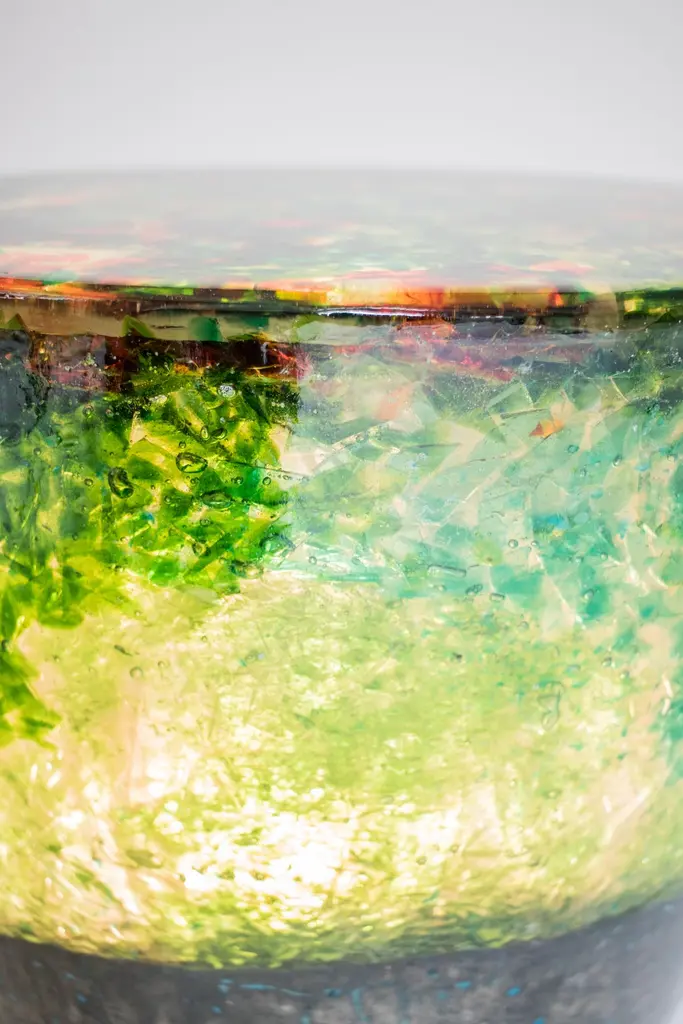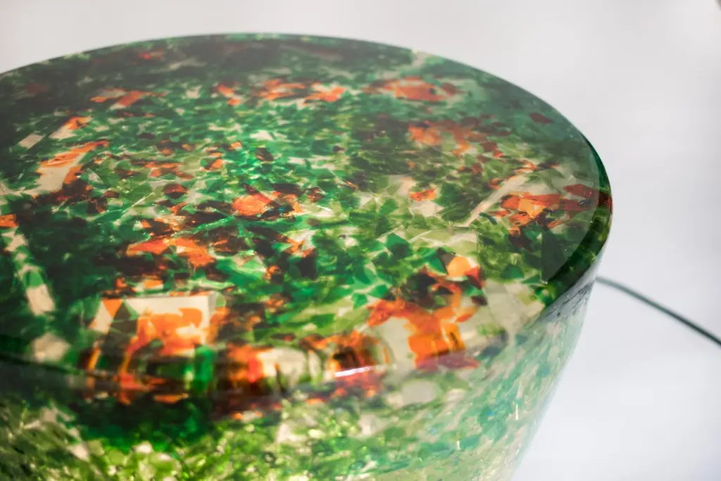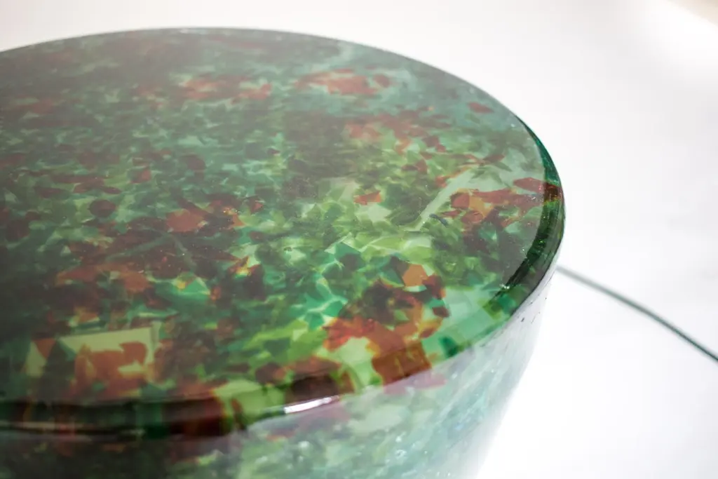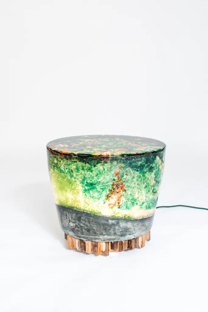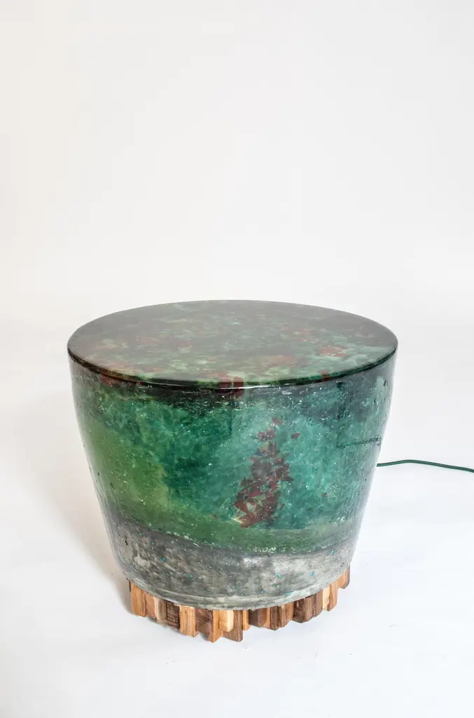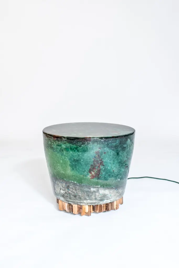 Forest & Sunset Murano Waste Side Table by HillsideoutDimensions: W 37 x D 37 x H 39 cm.Materials: Murano Glass, Woods, Epoxy resin, Acrylic. The side-table is as well lighting and stool in one. Furthermore, the object can be easily moved due to small wheels fixed under the structures. Their colours refer to main natural elements like forest, sea or sun.Hillsideout is an Italian-German collaboration which combines antique restoration techniques with contemporary mediums. Founded in 2009 by Andrea Zambelli and Nat Wilms, the brand name is a linguistic game related to their vision of furnishings that finds inspiration in an external element from the land by bringing it "out" into interiors.Andrea Zambelli (b. 1978 in Italy) is a professional restorer of furniture with more than 15 years working experience in Bologna dealing with wealthy family heritages dating from the early 17th to the mid 20th centuries. As a designer he believes in a possible re-interpretation of his former profession believing that ancient skills of application, which are slowly disappearing, should be preserved. The insertion of innovative materials using antique manufacturing skills is based on the historical furniture tradition but also renews it at the same time.Nat Wilms (b. 1976 in Germany) is a freelance artist with a degree in Sculpture at the Academy of Fine Arts in Bologna/Italy. She graduated with her thesis about Circular and Linear Time in cultural-visual Anthropology with the art critician Roberto Daolio in 2006. Both during and after her academic formation she took part in multimedia classes at the University of Art in Berlin and has participated in numerous workshops. She is a teacher of multimedia classes and as a conceptualist she developped the brand strategy.Post-Hillsideout: The project Hillsideout contains the production of unique editions made between 2009 and 2022. The creative collaboration ends after more than 12 successful years and the two founders divide for going on with their own projects. The left editions or designs which came out during that period are still for sale though and in production on request, brandmarked and with the usual certificate of authenticity signed by the designers.All our lamps can be wired according to each country. If sold to the USA it will be wired for the USA for instance.
