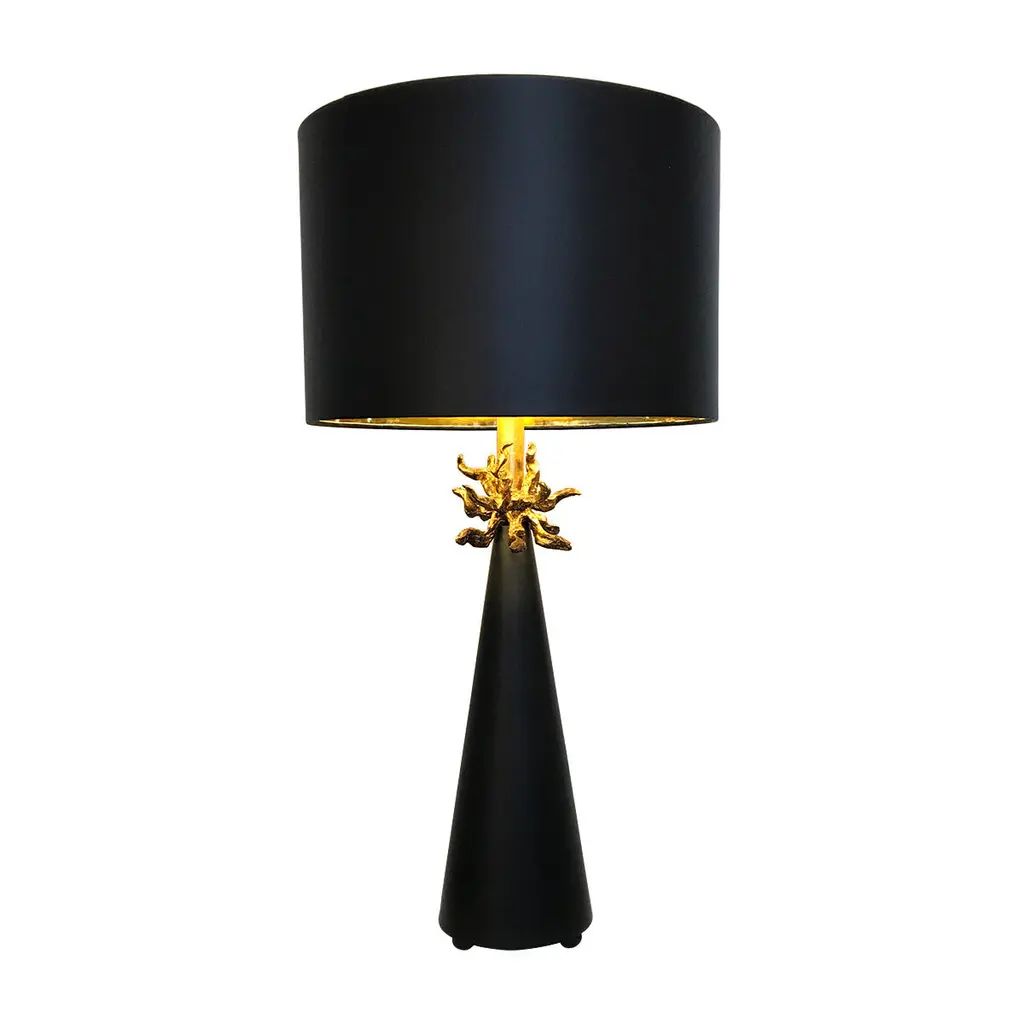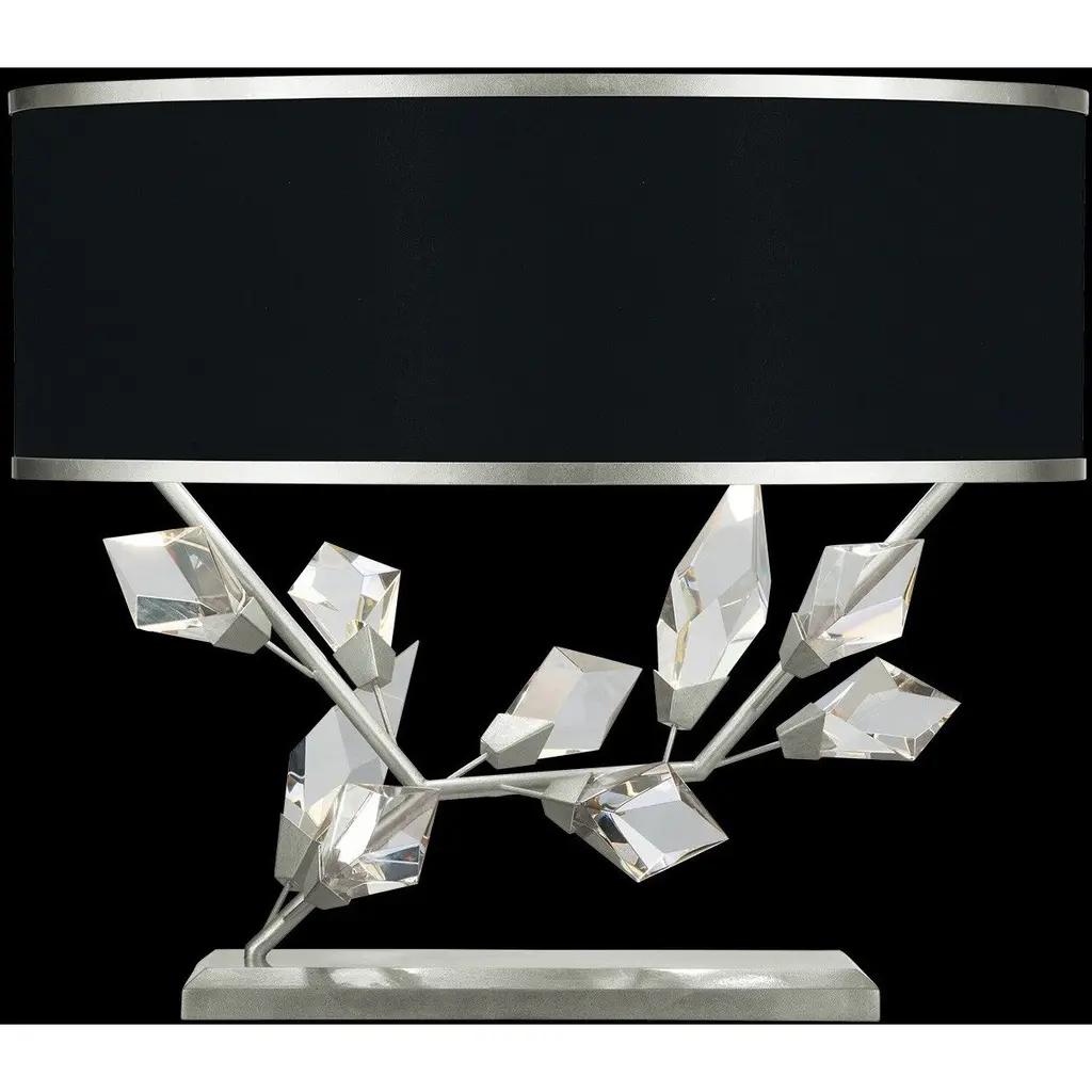 Inspired by nature and its majestic forests, this gold leaf Foret table lamp features modern branches adorned with bold, hand-cut faceted crystal leaves and a black fabric shade with gold interior and gold leaf metal trim. Also available in silver leaf wi