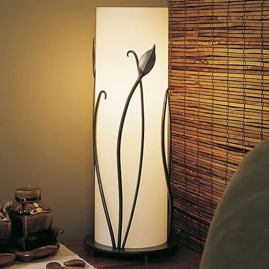 It's nice to have a touch of nature built into your everyday lighting and furnishings. The Forged Leaves Table Lamp from Hubbardton Forge makes its hand-forged wrought iron leaves the star of the show. Delicate leaves waft and curl around a cylindrical lampshade that acts as a luminous background for the piece. The light softened by the opaque shade produces a lovely ambient glow. Its unique design and bountiful light make it a nice pairing with side tables and desks.