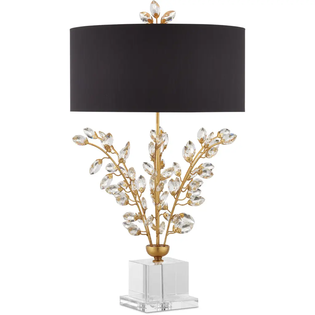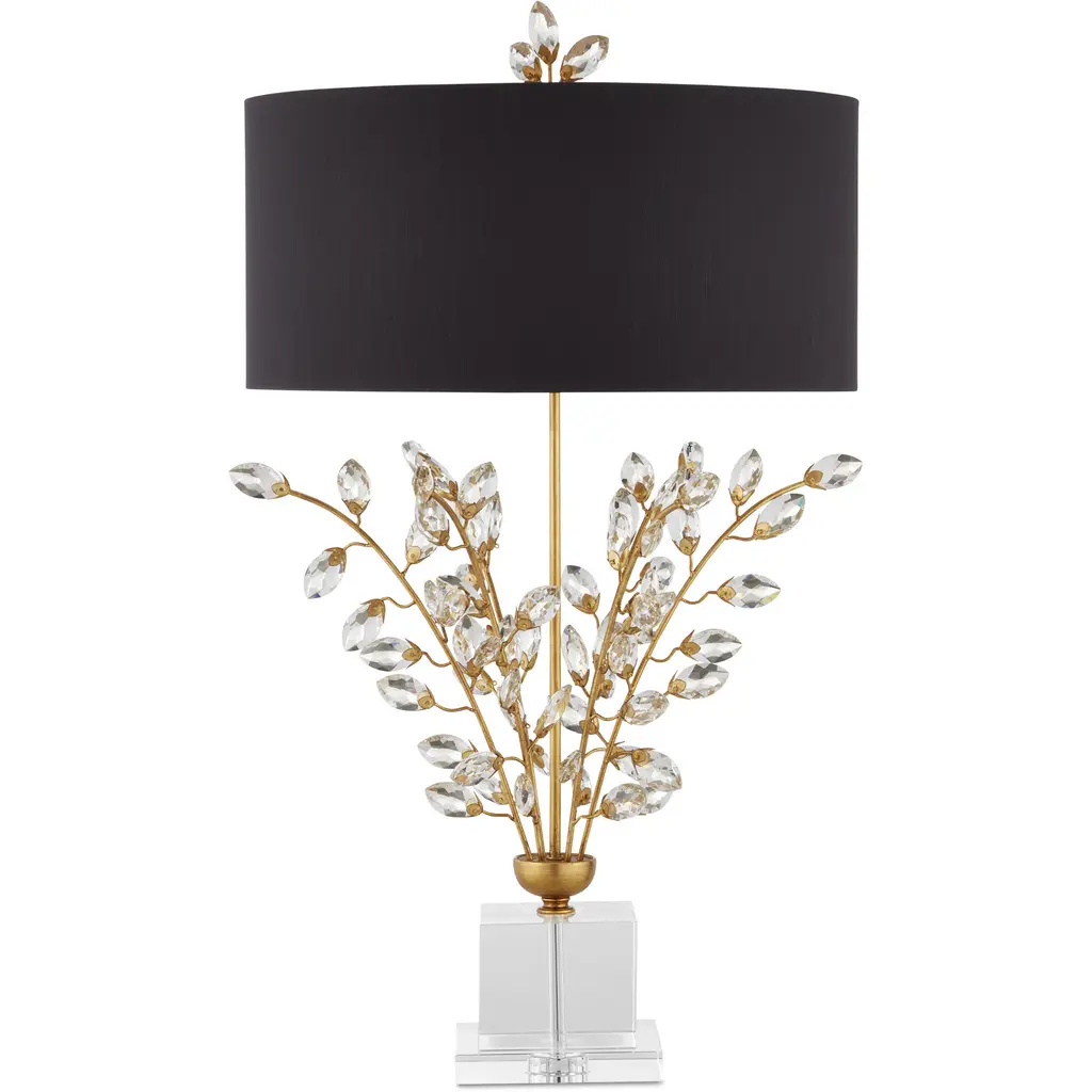 On stems of metal that have been treated to a rich Chinois gold leaf finish, a spray of luxuriant beveled optic crystal buds burst forth on the Forget-Me-Not Table Lamp. Besides the lamp’s bouquet, other romantic details include a simple black shantung drum shade and a clean-lined stacked crystal base. Topping off this nosegay of a lamp, which stands 32-inches tall, is a pert crystal finial.