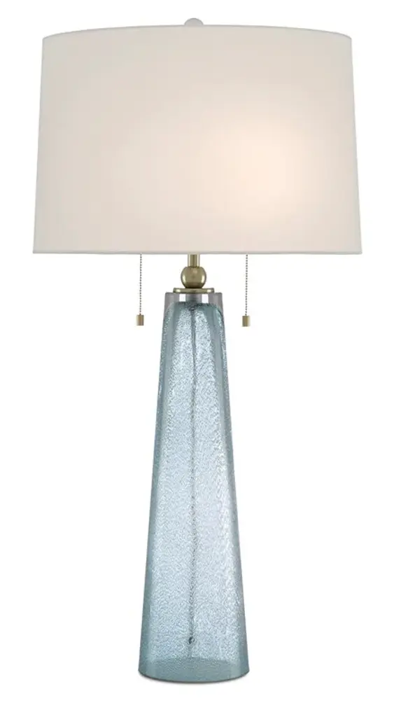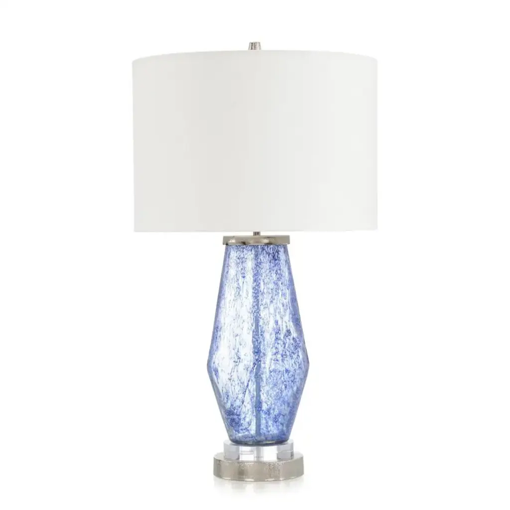 The tapered body of the Foschia Table Lamp features gorgeous splashes of blue over transparent glass. The rounded, two-tiered base features aluminum in a nickel finish underneath a smaller piece of clear acrylic, with a matching neck accent and finial, lending a variety of color and texture to the piece. The neck hardware, with a polished nickel finish, lends a subtle sheen to the piece that completes the look.