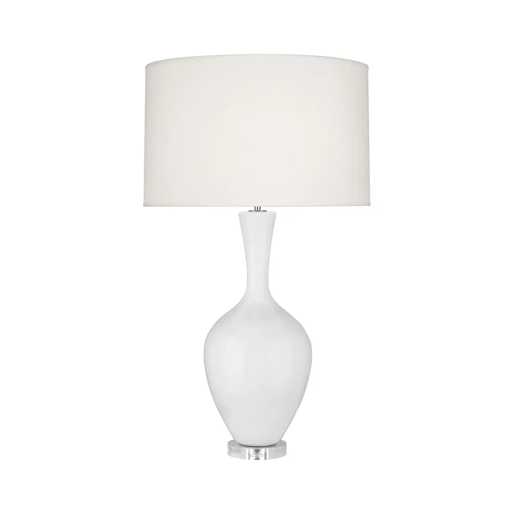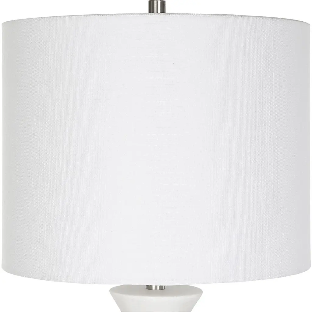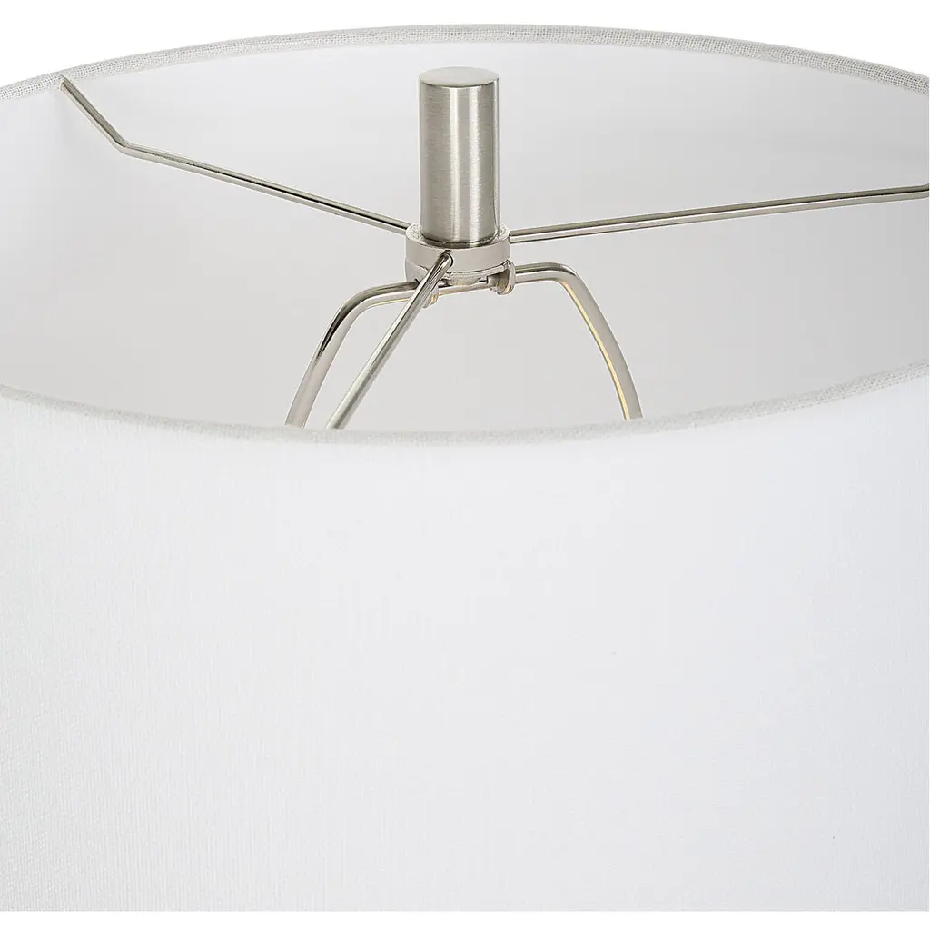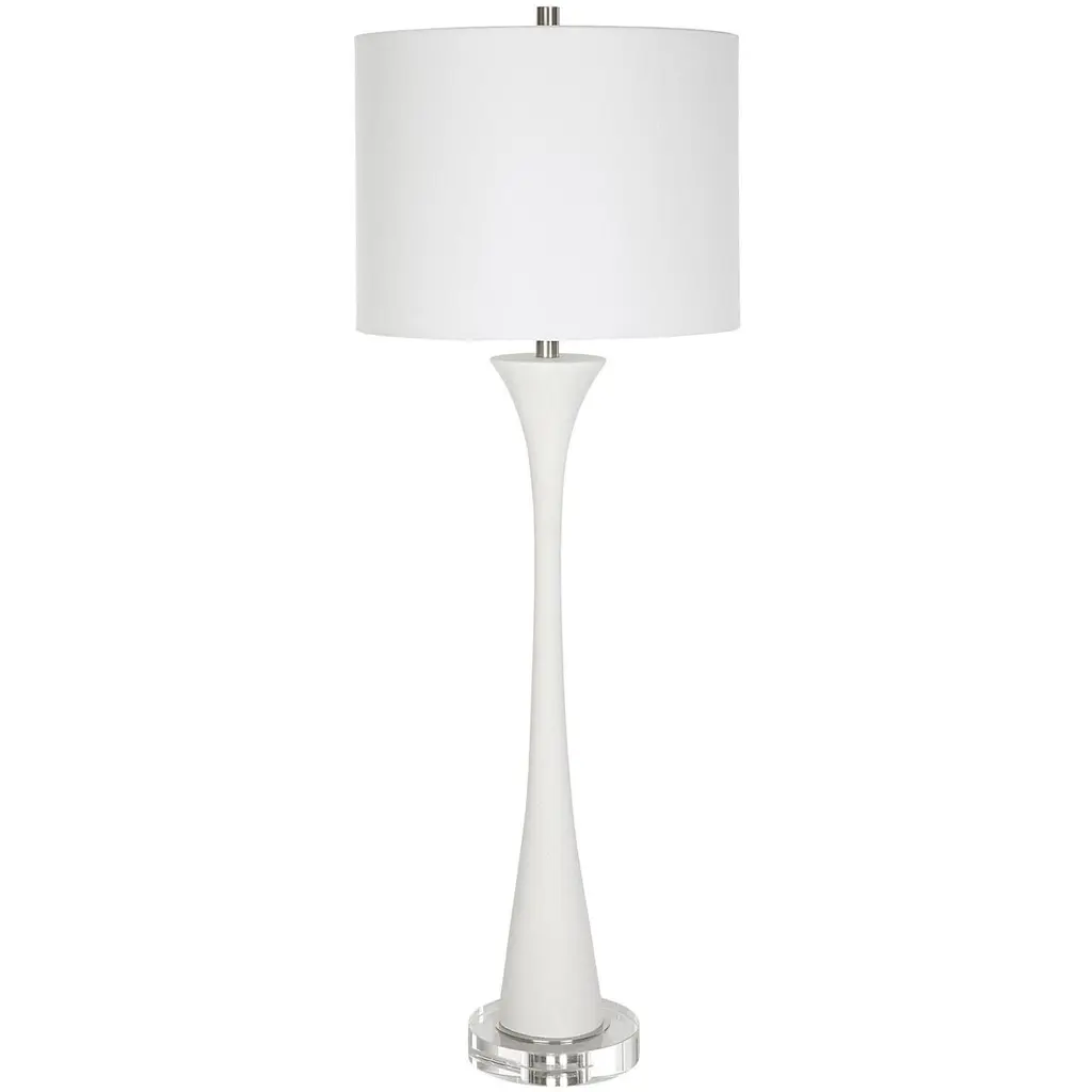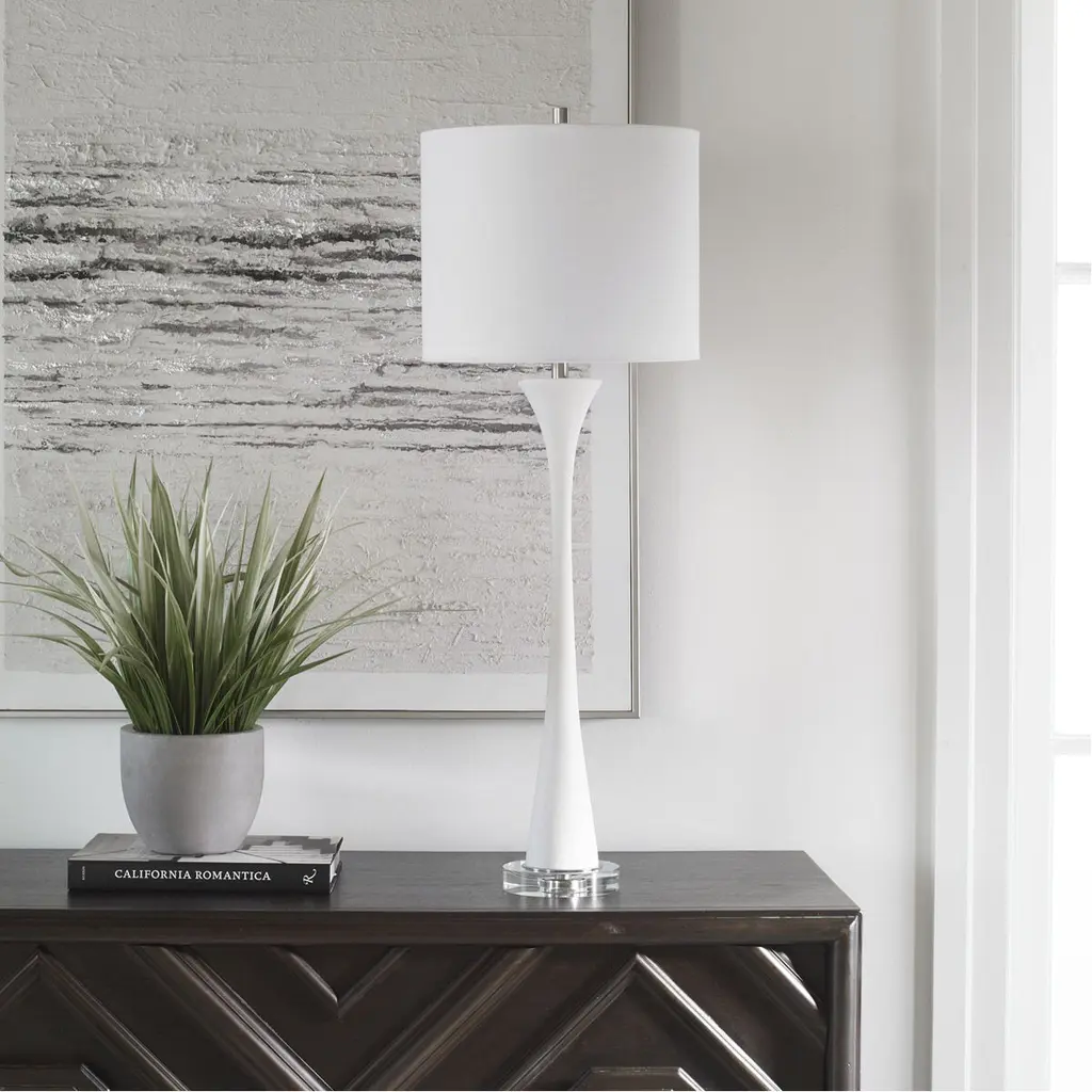 Showcasing A Classic Trumpet Shape, This Buffet Lamp Is Handcrafted From Granulated White Marble That Accurately Replicates The Look Of Thassos Marble, Displayed On A Thick Crystal Foot, Paired With Brushed Nickel Plated Accents. A White Fabric Shade Completes The Piece.