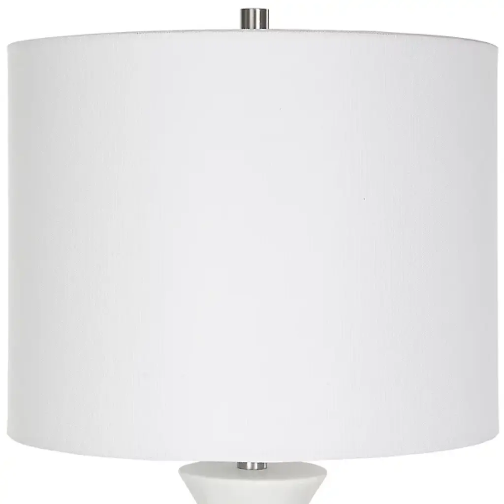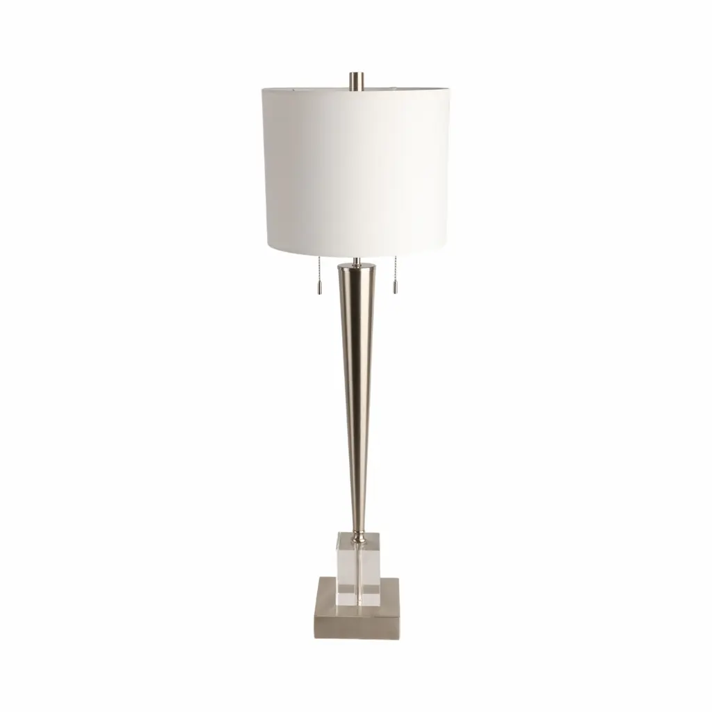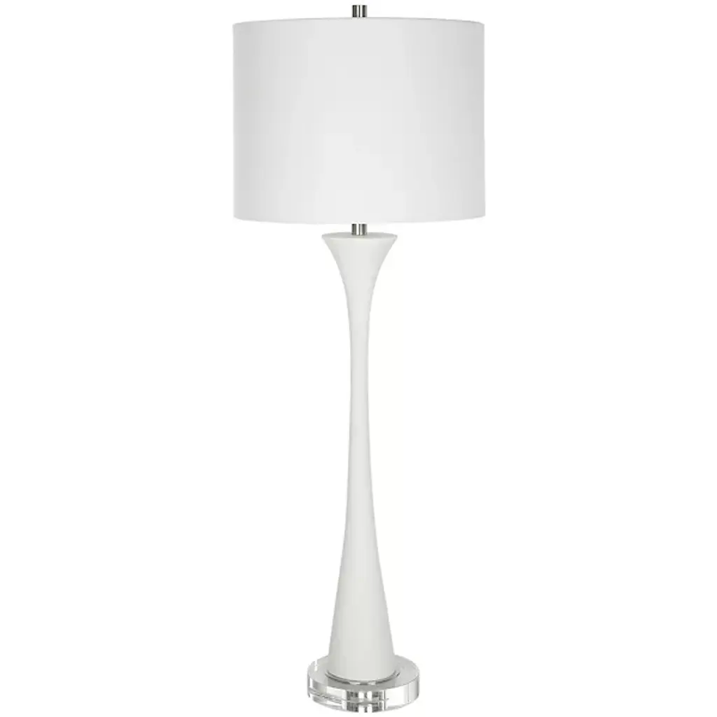 The Fountain Table Lamp from Uttermost brightens one’s room with a light-topped, classic trumpet shape. The table lamp features a handmade ivory stone construction whose fine texture evokes the look of thassos marble. A thick crystal body elevates the piece physically and aesthetically. The crowning fabric shade completes the throwback look and diffuses the light into a glare-free aura.
