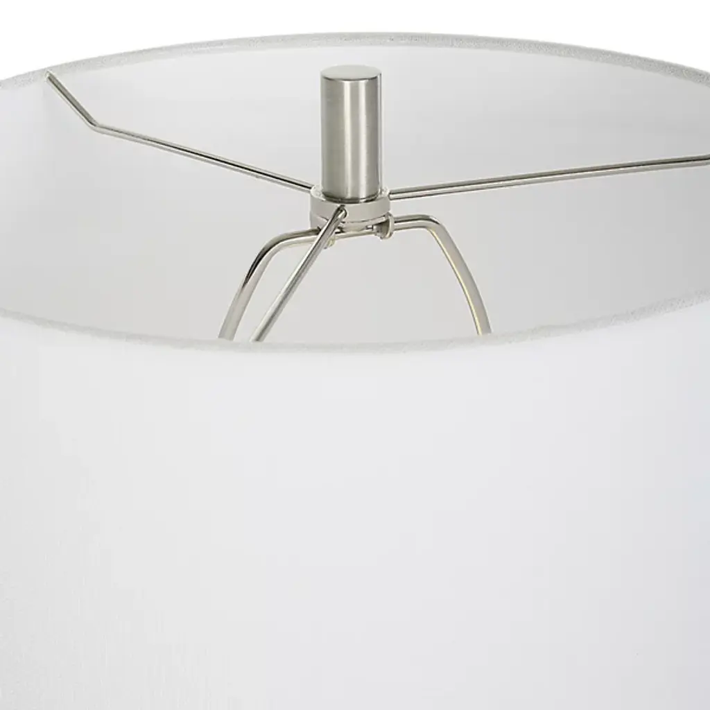 The Fountain Table Lamp from Uttermost brightens one’s room with a light-topped, classic trumpet shape. The table lamp features a handmade ivory stone construction whose fine texture evokes the look of thassos marble. A thick crystal body elevates the piece physically and aesthetically. The crowning fabric shade completes the throwback look and diffuses the light into a glare-free aura.