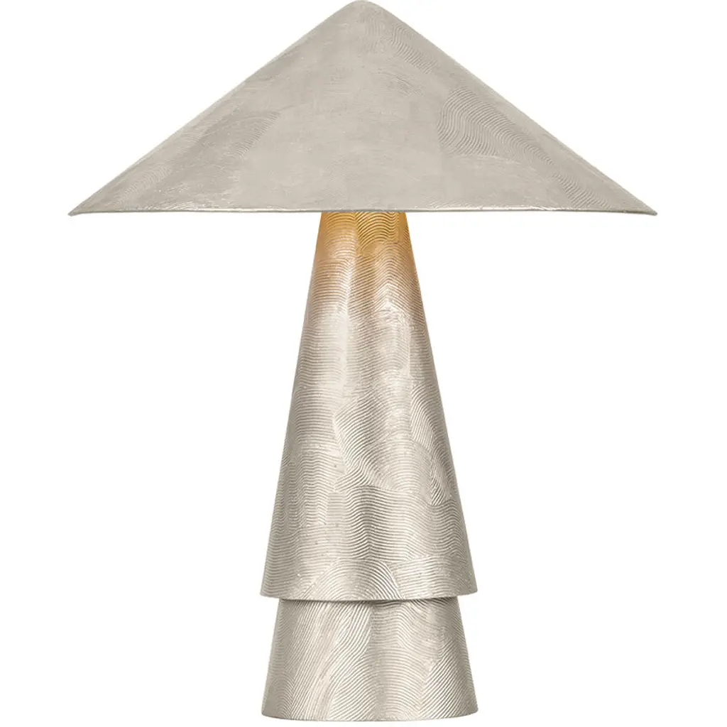 Inspired by antiquities, the Foxton table lamp cuts a bold figure with artistic geometry and textural finishes. The conical stacked base and pyramid-shaped shade provide a striking reimagination of a classic table lamp silhouette. Available in either troweled Vintage Gold Leaf or troweled Warm Silver Leaf finishes, Foxtons allover materiality amplifies its statuesque presence.