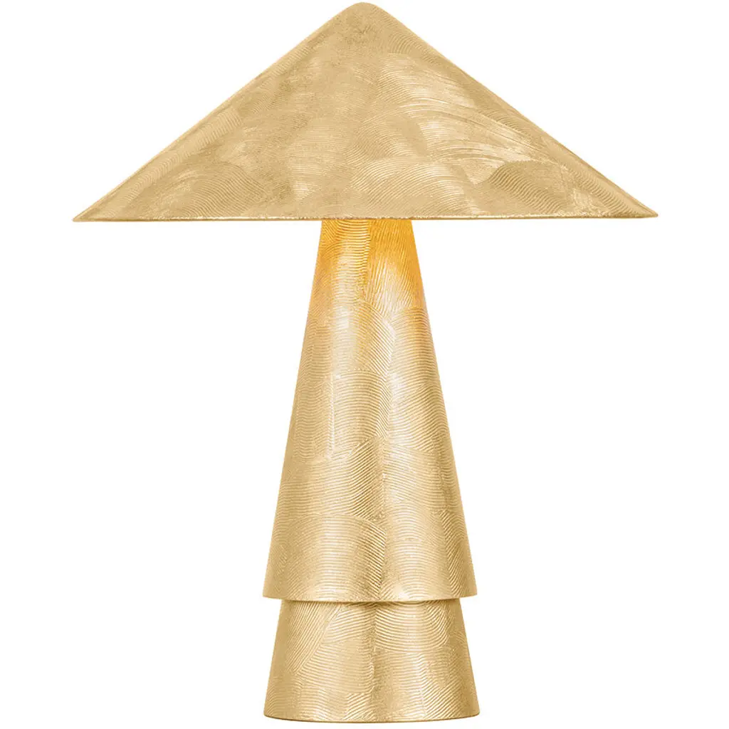 Inspired by antiquities, the Foxton table lamp cuts a bold figure with artistic geometry and textural finishes. The conical stacked base and pyramid-shaped shade provide a striking reimagination of a classic table lamp silhouette. Available in either troweled Vintage Gold Leaf or troweled Warm Silver Leaf finishes, Foxtons allover materiality amplifies its statuesque presence.