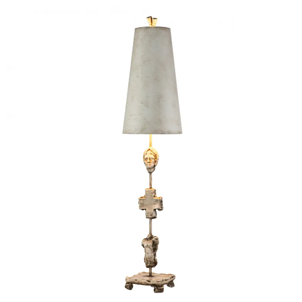 fragment 1 Table Lamp in Bone White. The sculpted body of the piece is accented with a subtle antiquing finish the accentuates the detail of the light.