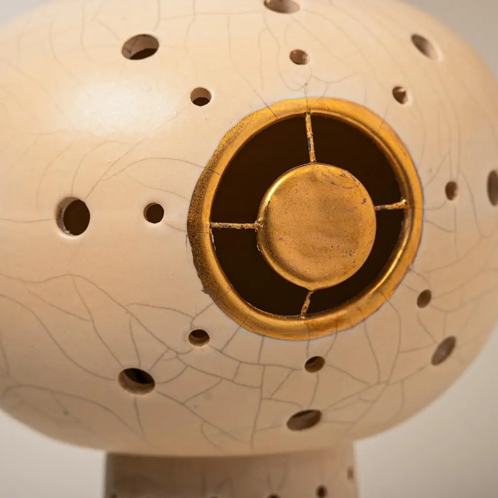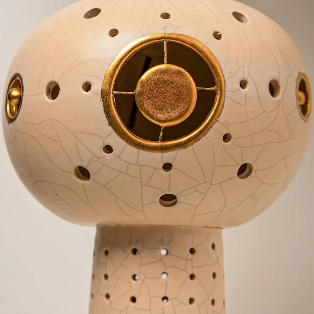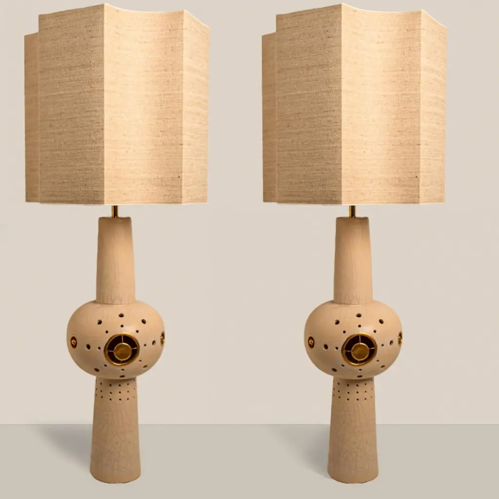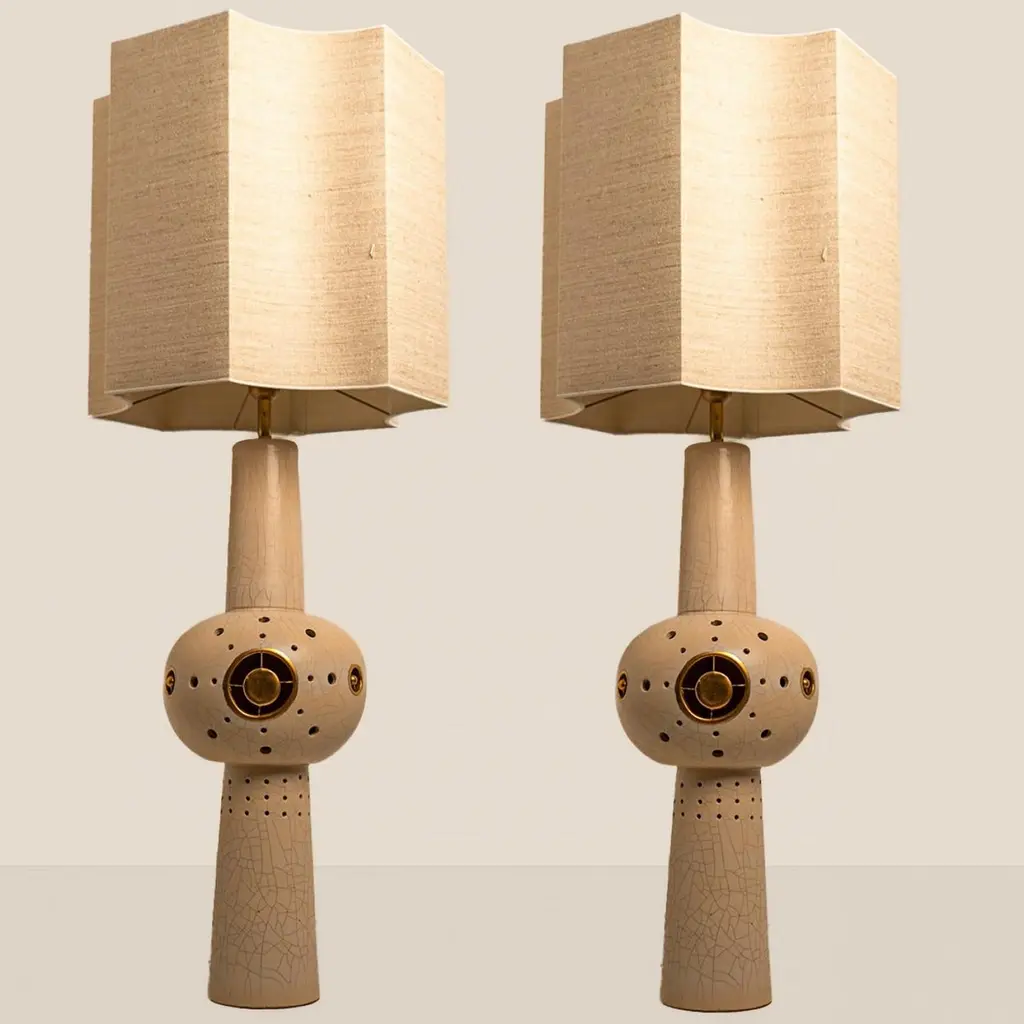 Beautiful ceramic floor lamp in the style of Georges Pelletier, 2022.The beige ceramics and gold colored details complement each other very well and illuminates beautifully.Ready to use. This floor lamp requires one E27 light bulb. Also LED compatible.Please notice the price is for one piece.Pelletier began his career in the 1950s as a window display designer for department stores in Paris. He later worked with several design houses, including the renowned Cristalleries de Saint-Louis and Baccarat. In 1954, he established his own company, Georges Pelletier Verrerie d'Art, where he created unique hand-blown glass pieces.