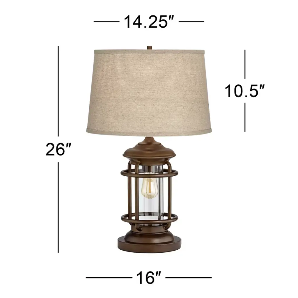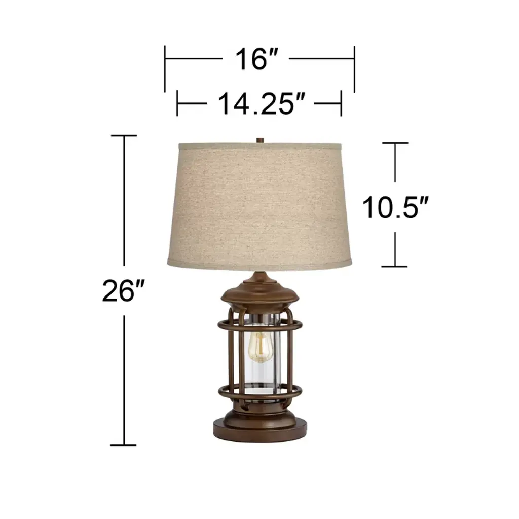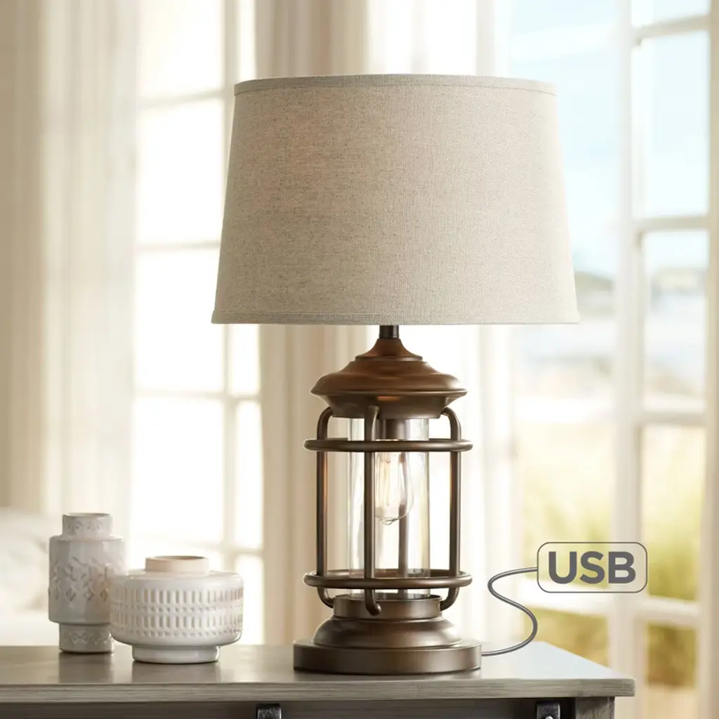 Franklin Iron Works Andreas Industrial Table Lamp 26" High Brown Metal With Nightlight Led And Usb Charging Port Oatmeal Shade For Living Room Desk