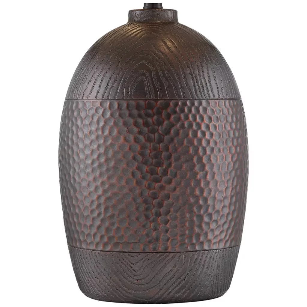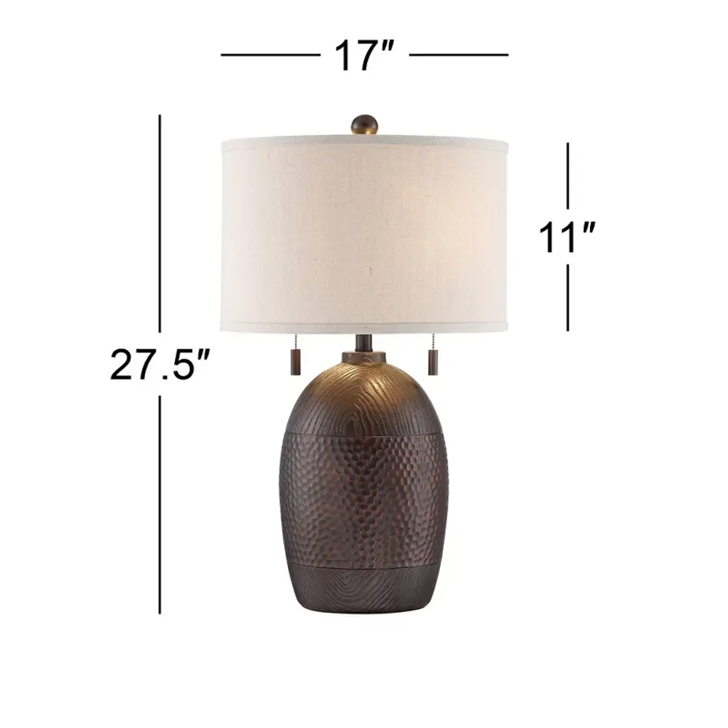 Brighten a living room or seating area with the classic look of this cask-shaped table lamp. The design features a base with a hammered look. The twin light pulls give you lighting flexibility. Turn only one on for TV viewing, or have both on for reading or general room illumination.