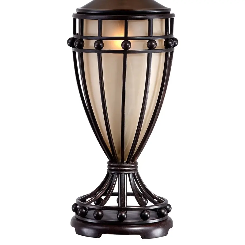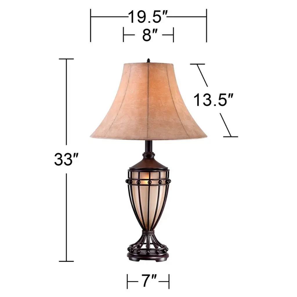 Ideal for traditional style homes, this table lamp has a classical silhouette made of a base of brushed Cardiff iron and beautiful champagne glass designed to resemble a classical urn. A night light is located behind the translucent glass and emits a warm glow when turned on. The color of the beige bell shade complements the champagne glass in the base nicely. This lamp set comes with a tabletop dimmer, one for each lamp, which allows you to control the level of lighting. Simply insert the lamp plug into the dimmer outlet, and then slide the switch on the control to dim or brighten the lighting.