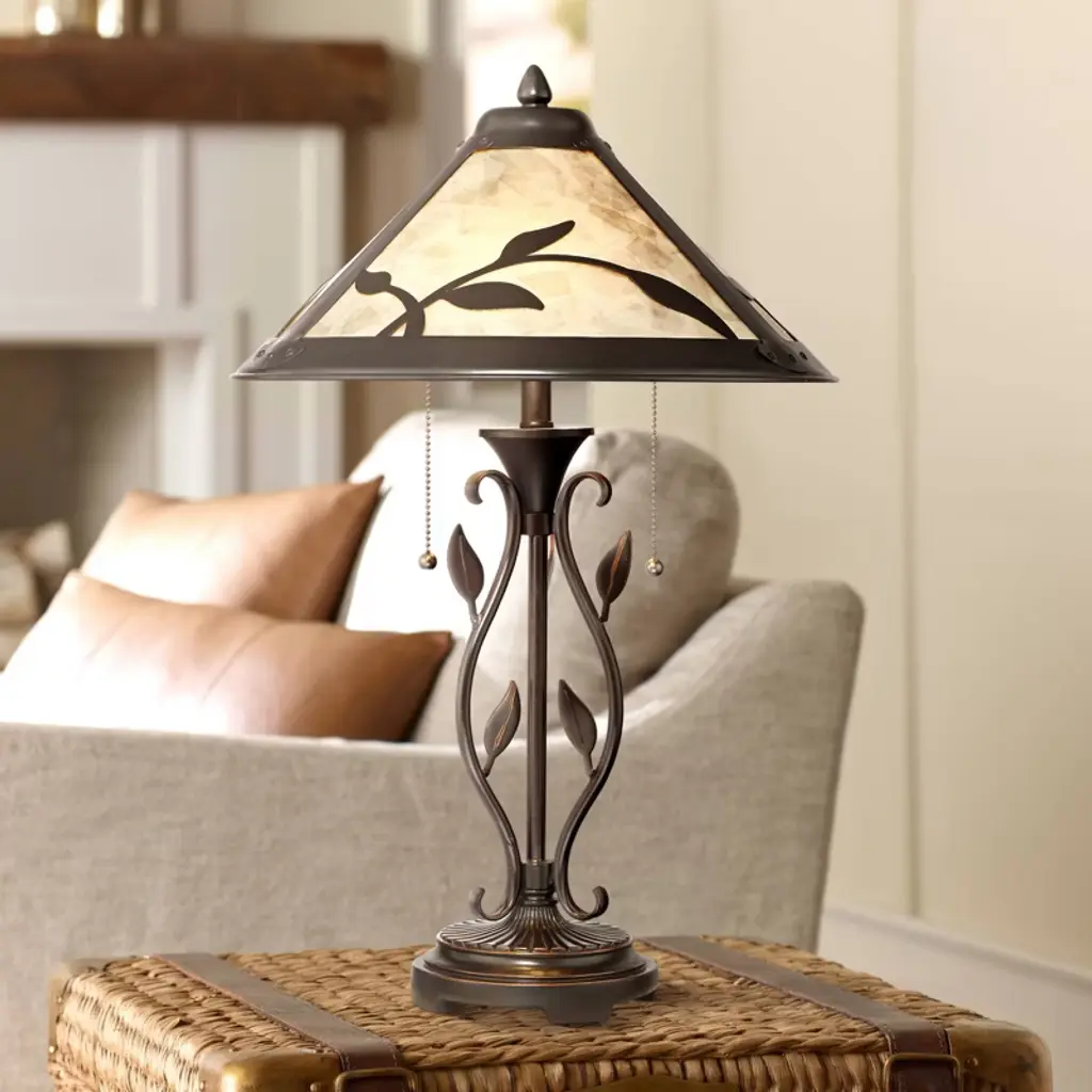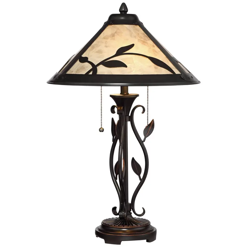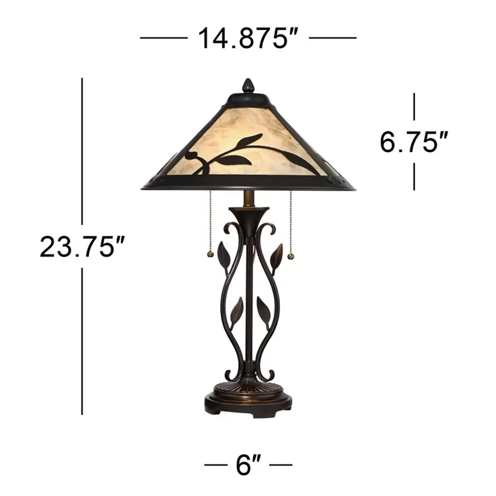 Introduce elegance to your home with this attractive set of table lamps from the Franklin Iron Works brand. The scrollwork-inspired body and mica shade showcase a silhouette of leafed vines. Mica is a naturally occurring mineral that is used for lamp shades and decorative diffusers. The material is cut very thin so that it is translucent and allows light to shine through, then it is applied to a thin poly backing to create the shade or diffuser shape. Dual pull-chains allow you to control your illumination by choosing from one light or two.