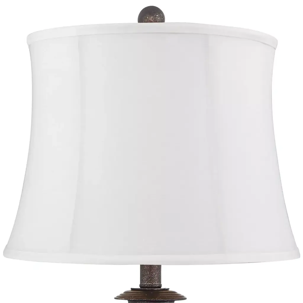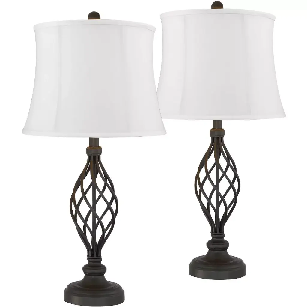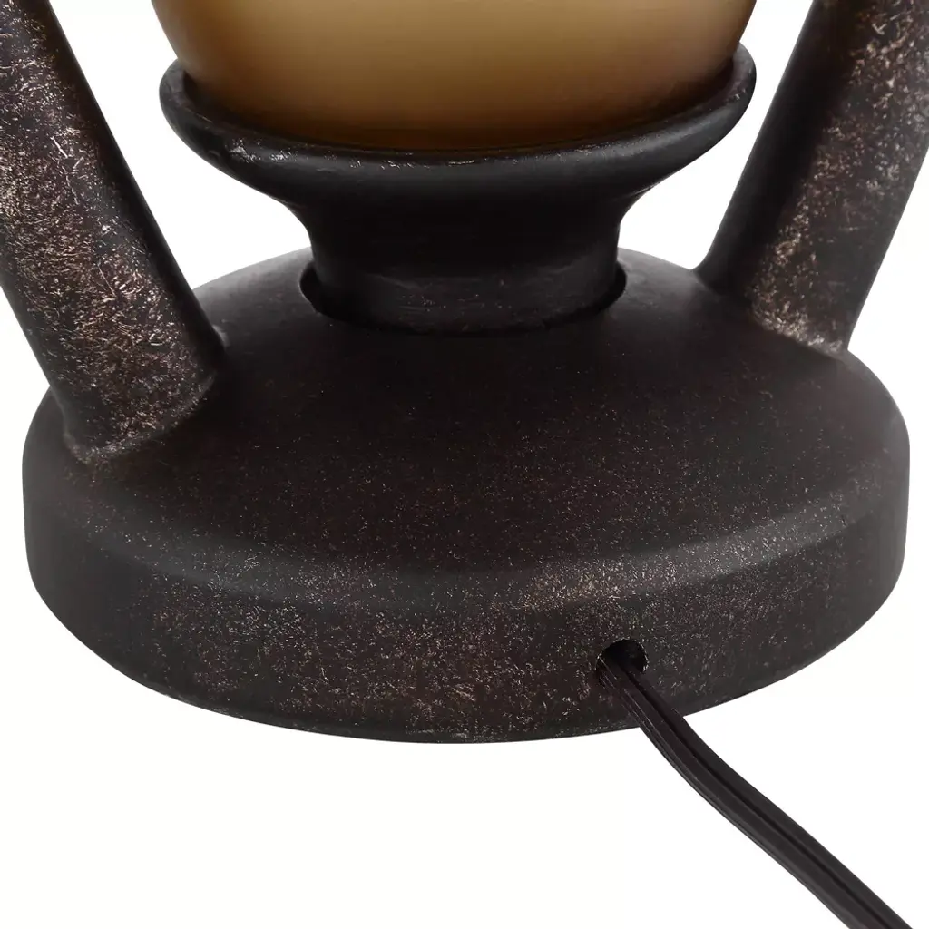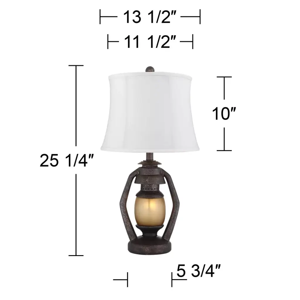This set of two lantern nightlight table lamps delivers a rustic aesthetic that plays well in casual settings and offers a bold embellishment to traditional decor. They showcase a dark finish shaped frame with sleek subtly colored glass nightlight differs and neutral white softback drum shades. Make the most of a cabin-inspired space with a tasteful pair of lamps.