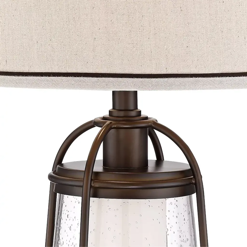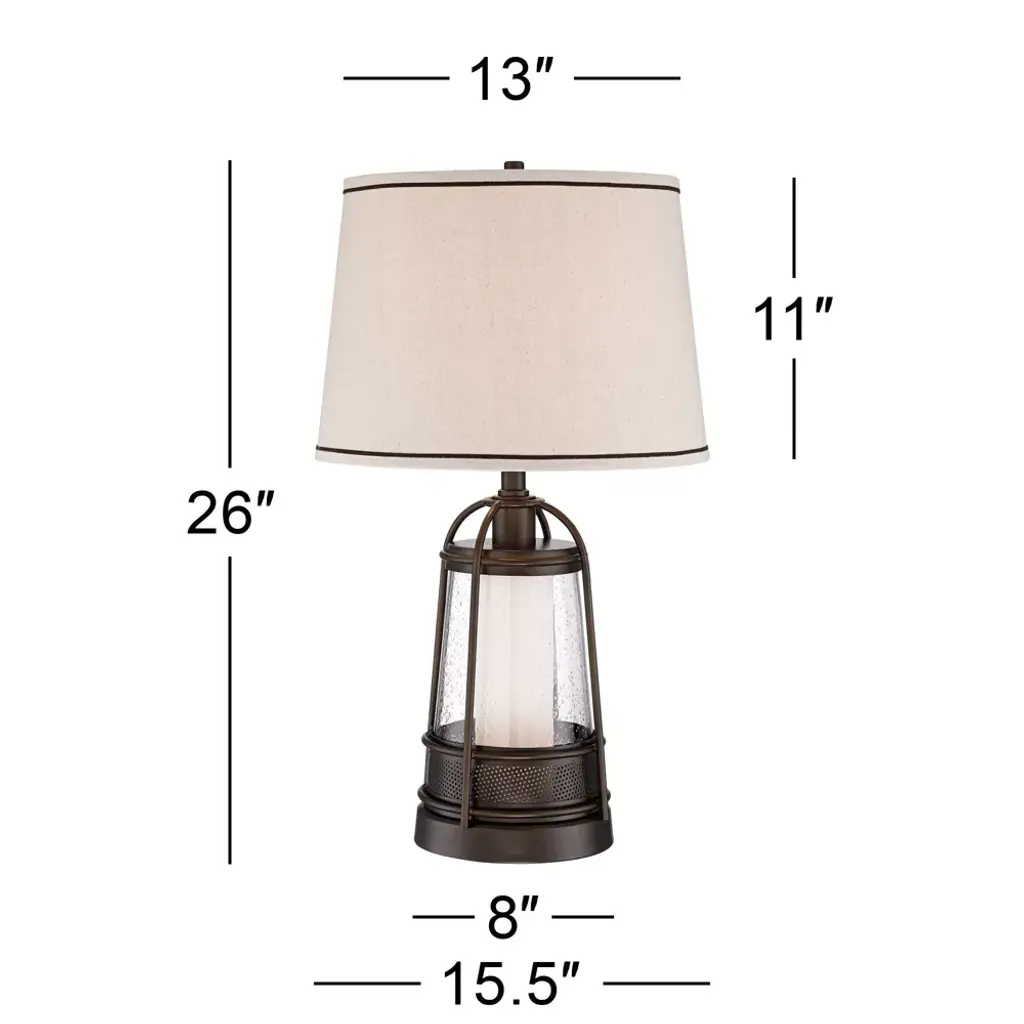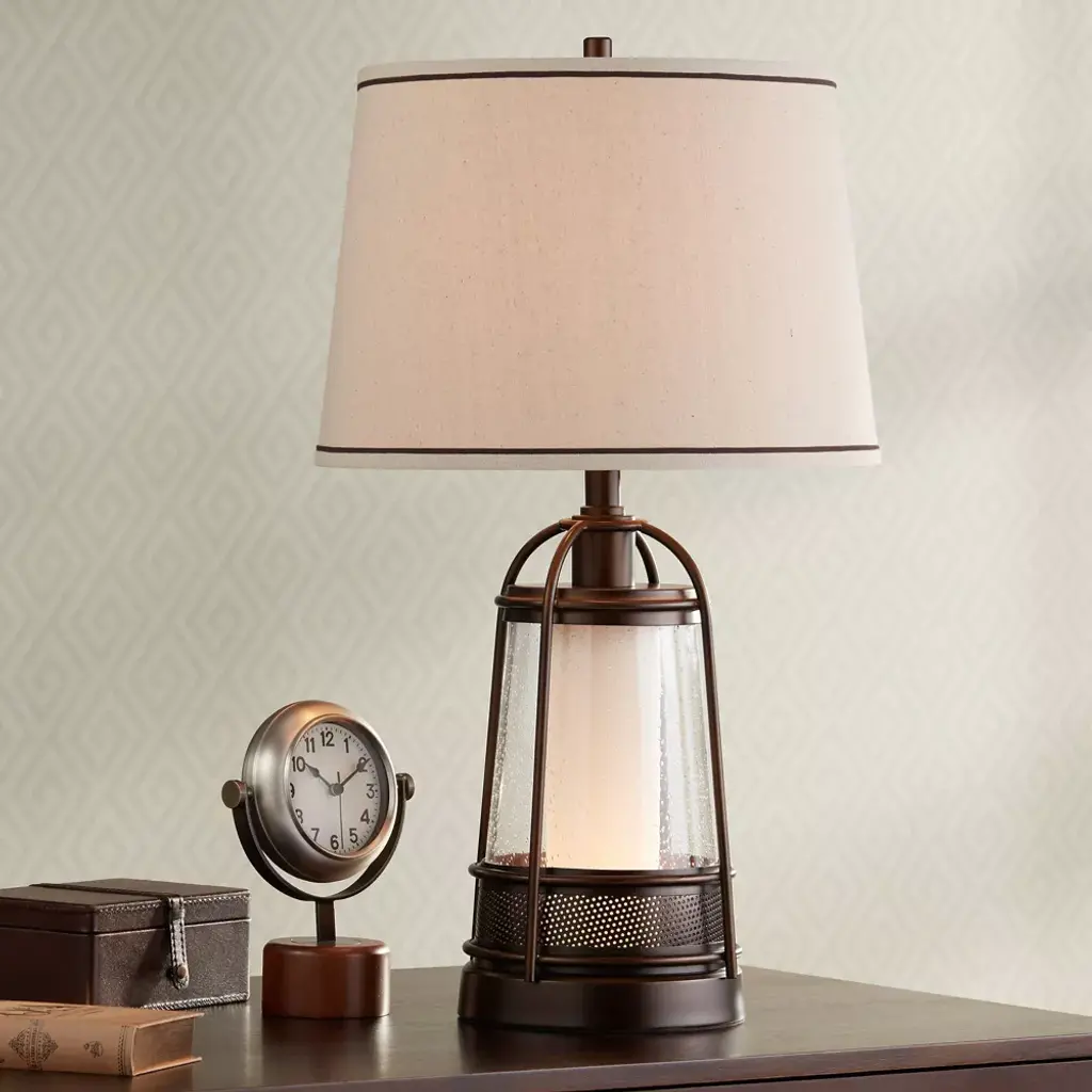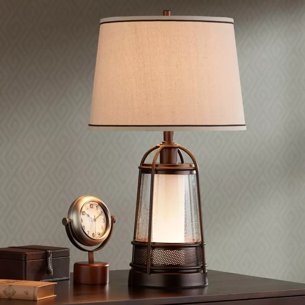 Franklin Iron Works Hugh Industrial Rustic Table Lamp 26" High Bronze Metal Seeded Glass With Led Nightlight Off White Shade For Bedroom Living Room