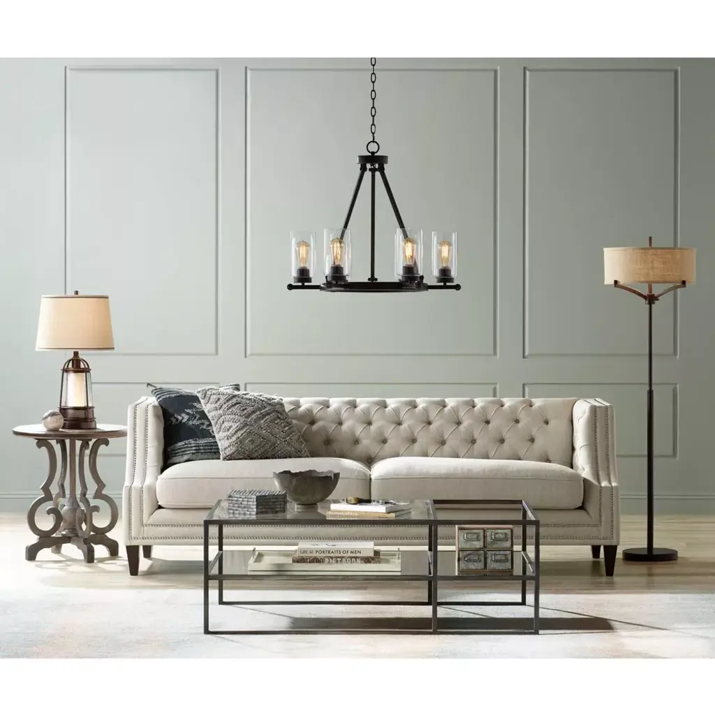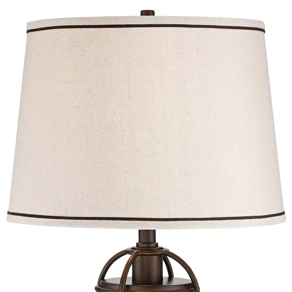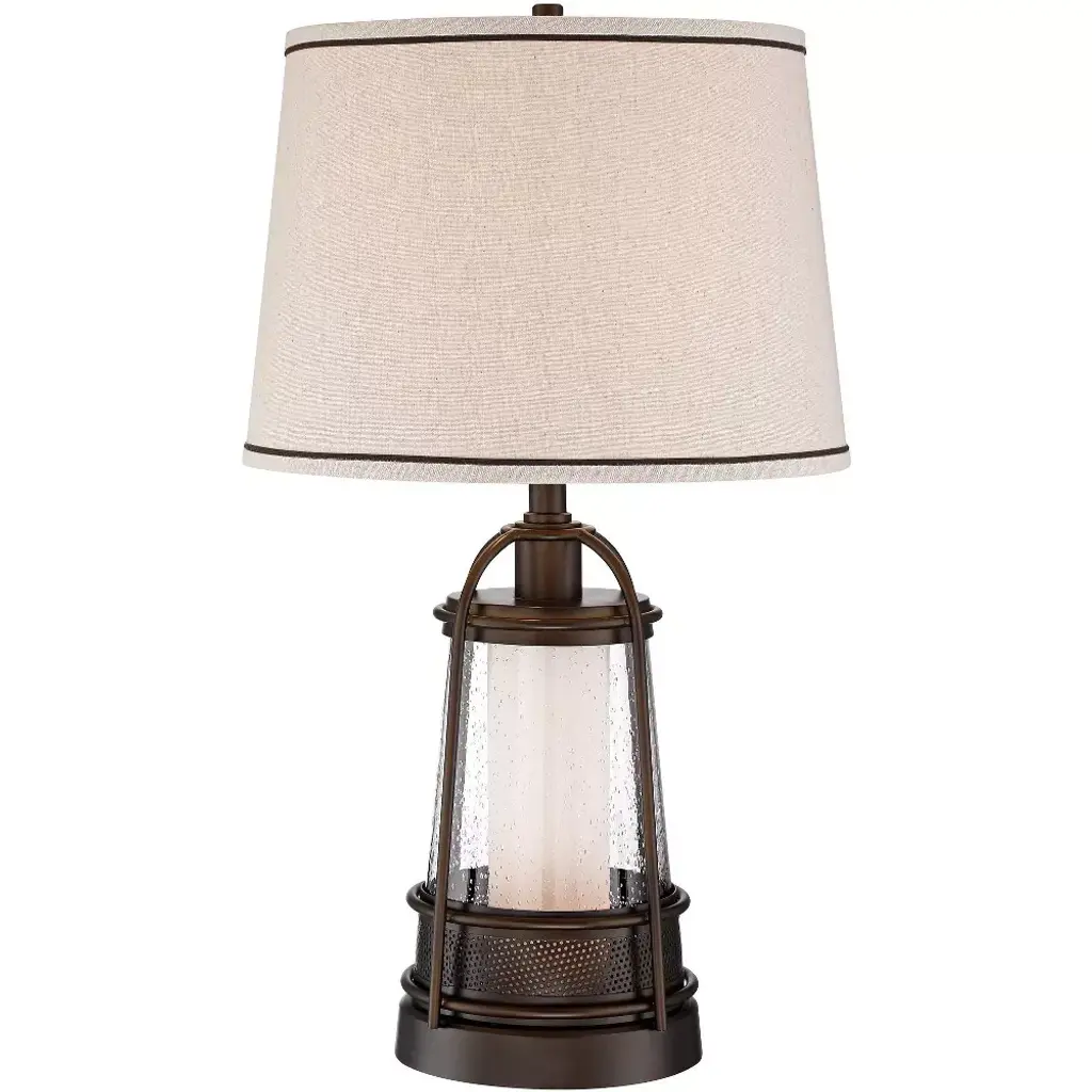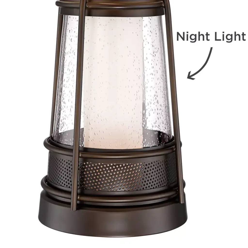 From Franklin Iron Works™ comes a handsome table lamp featuring industrial details like a mesh lantern form. Thoughtful detailing, like a seeded glass body and accent trim around the shade, adds an extra touch of appeal. An integrated nightlight makes evenings easier to navigate.