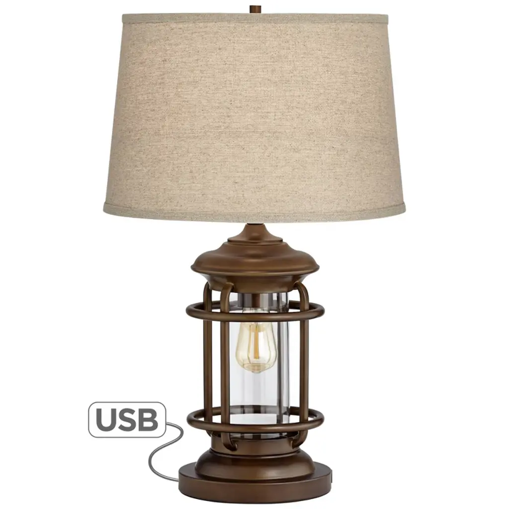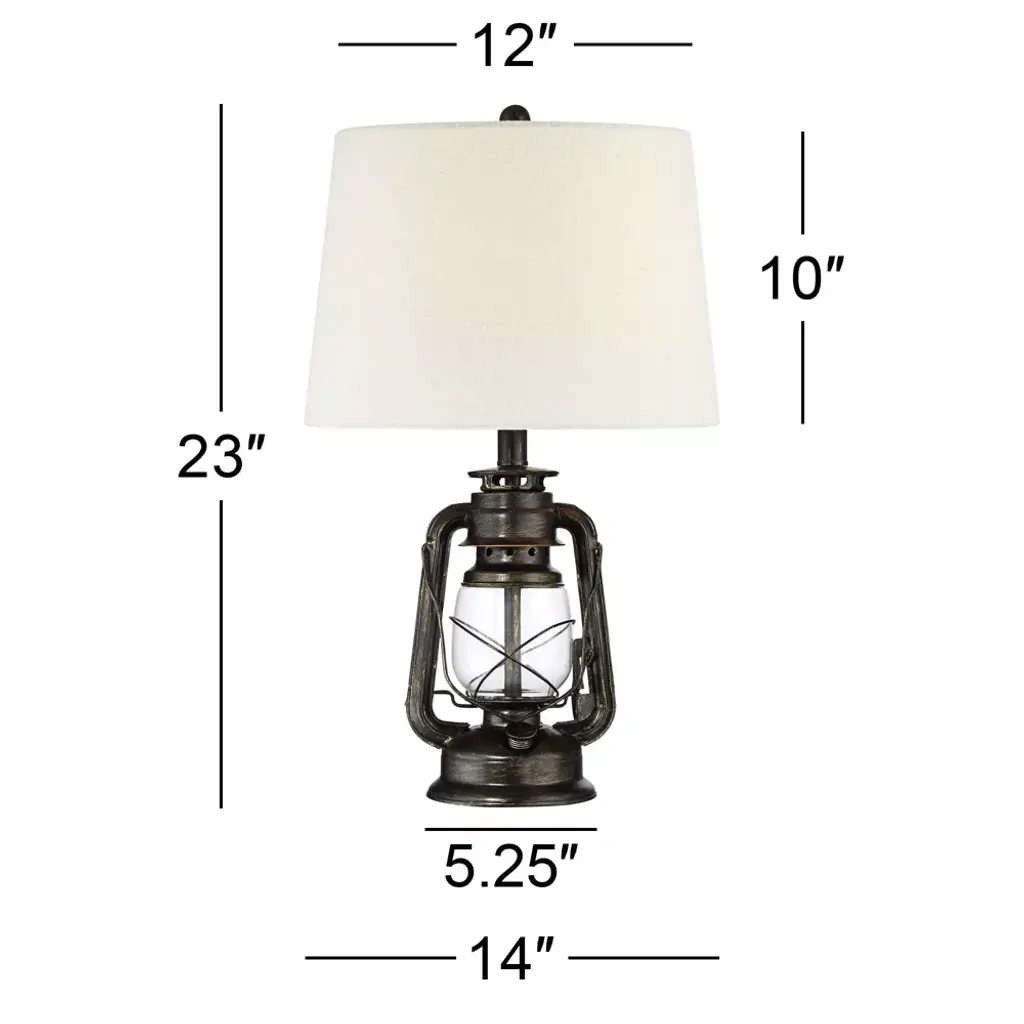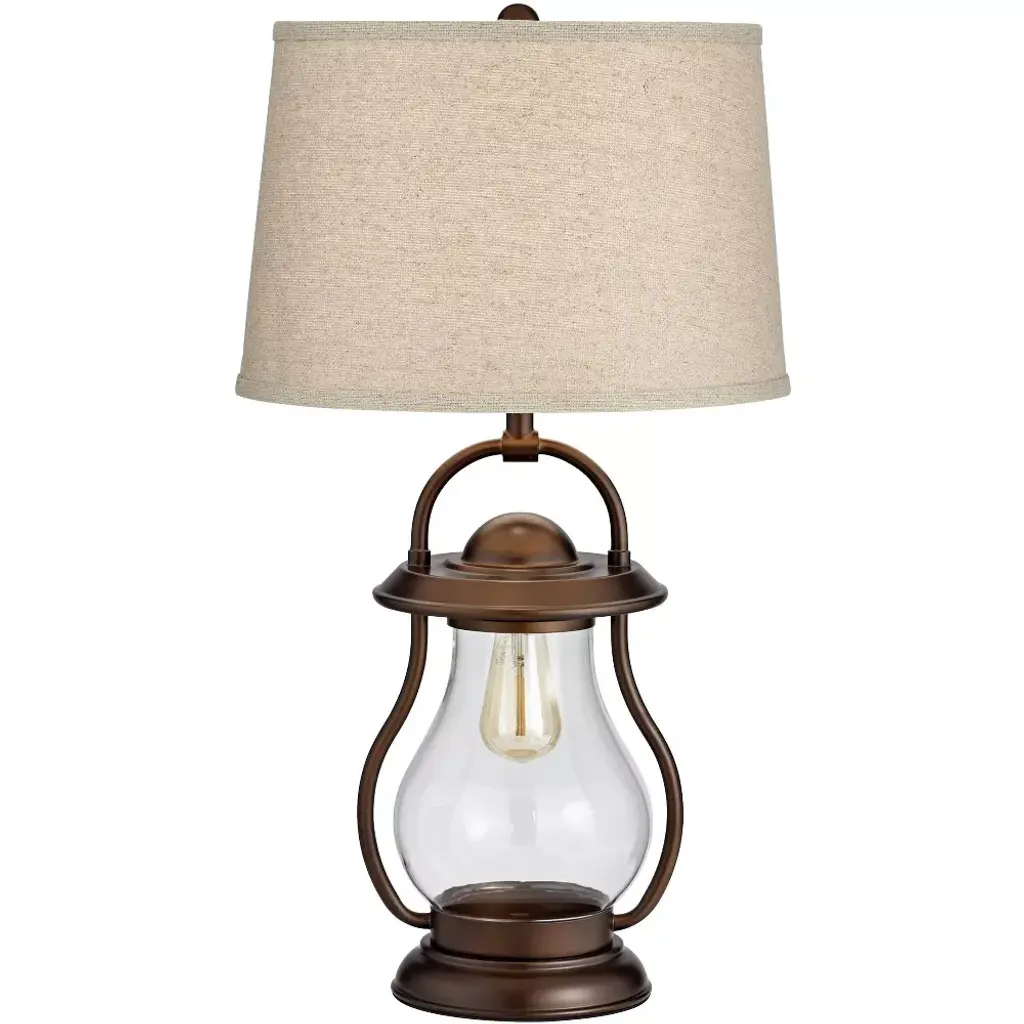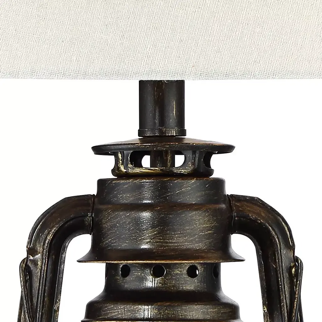 Add a hardy industrial look to your nightstand or side table with this rugged metal table lamp from Franklin Iron Works™ lighting. The weathered bronze finish base is cleverly designed to resemble a traditional coal miner's lantern, with a clear glass accent in the middle. An oatmeal fabric shade on top is the perfect finishing touch to this handsome design.