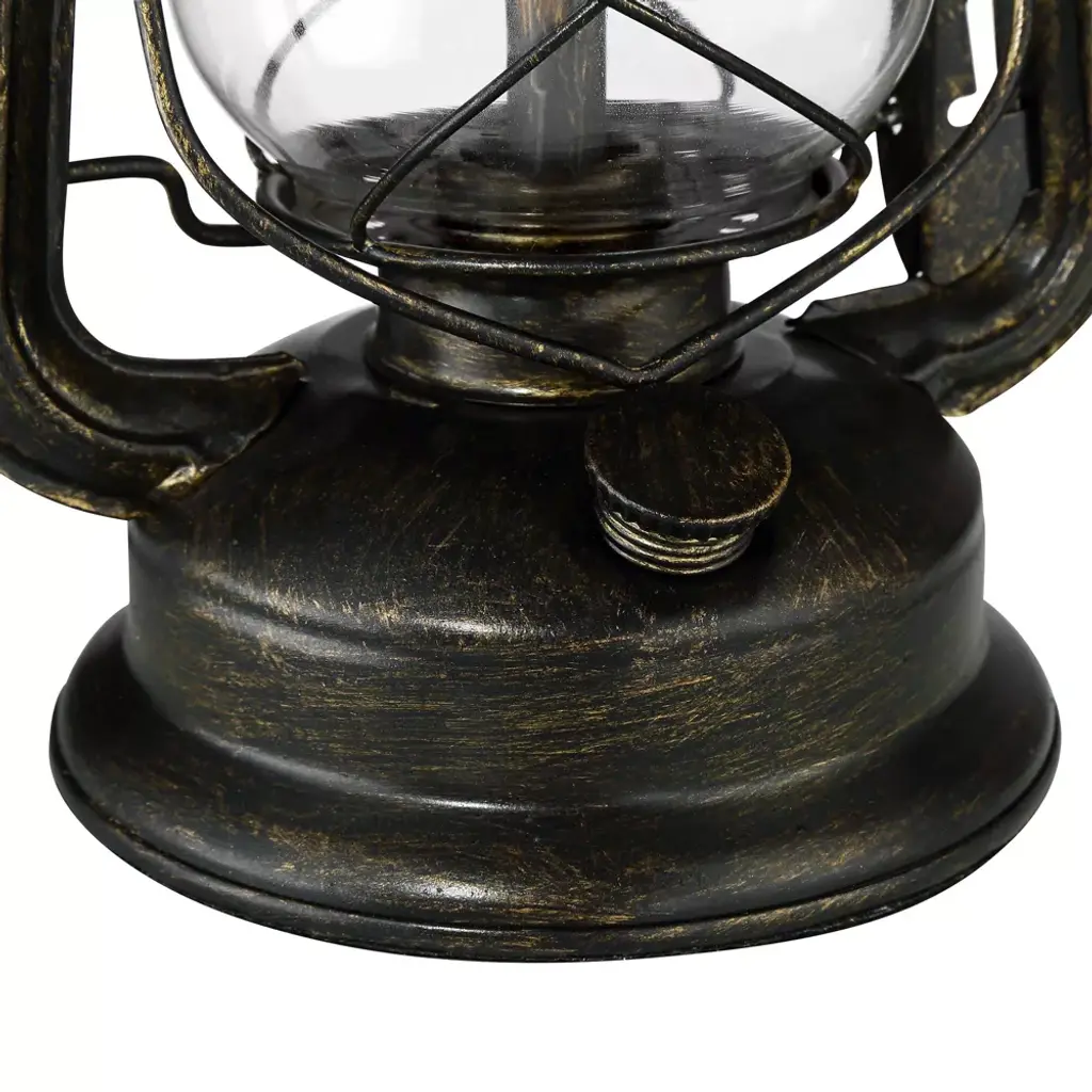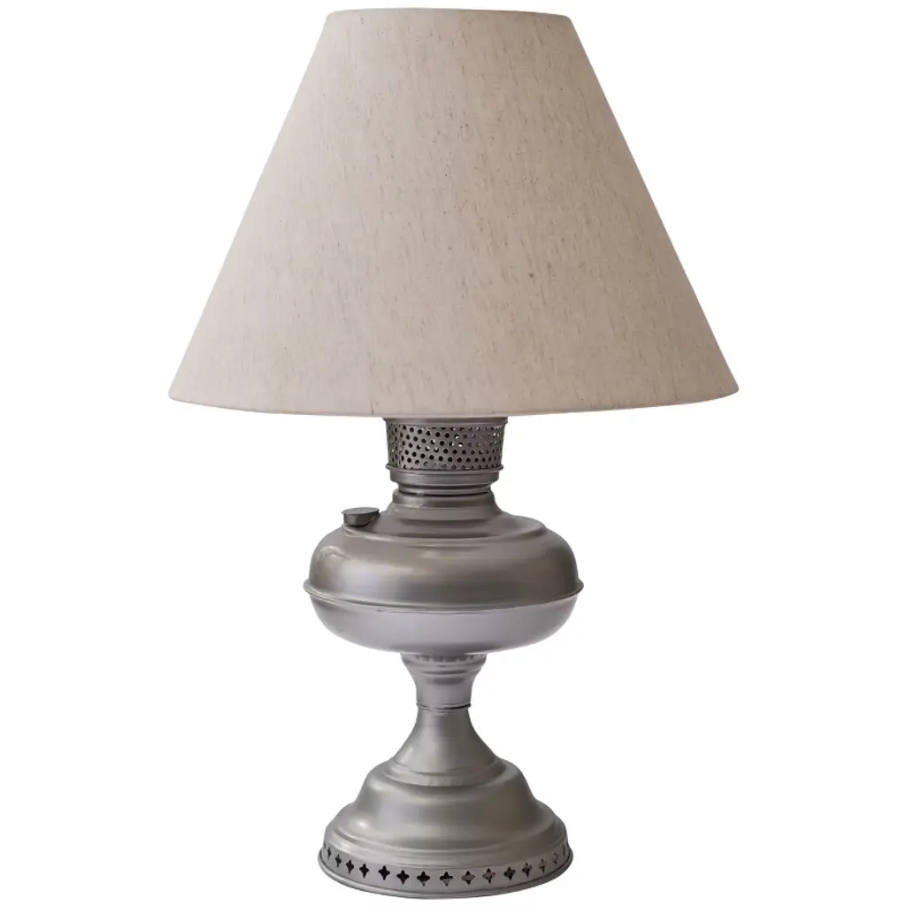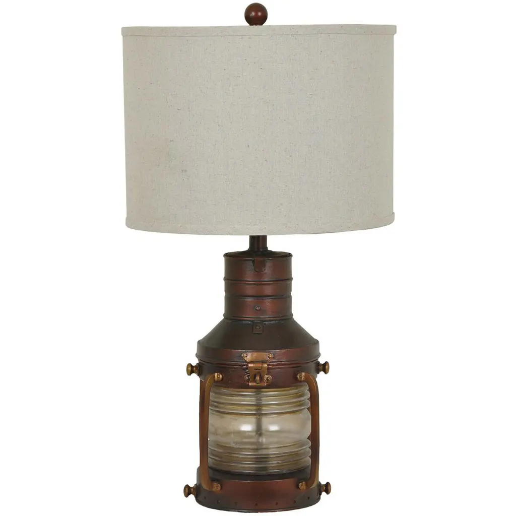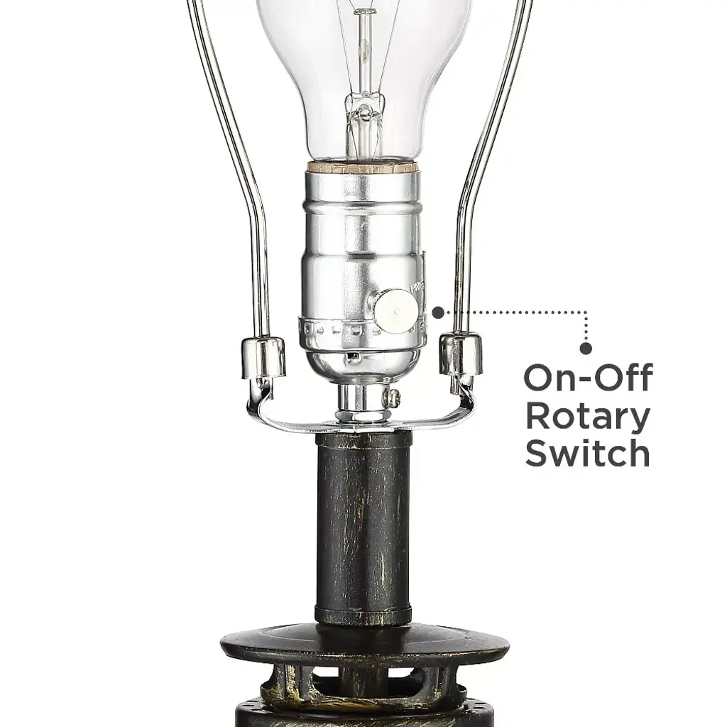 Add a hardy industrial look to your nightstand or side table with this rugged metal table lamp from Franklin Iron Works™ lighting. The weathered bronze finish base is cleverly designed to resemble a traditional coal miner's lantern, with a clear glass accent in the middle. An oatmeal fabric shade on top is the perfect finishing touch to this handsome design.