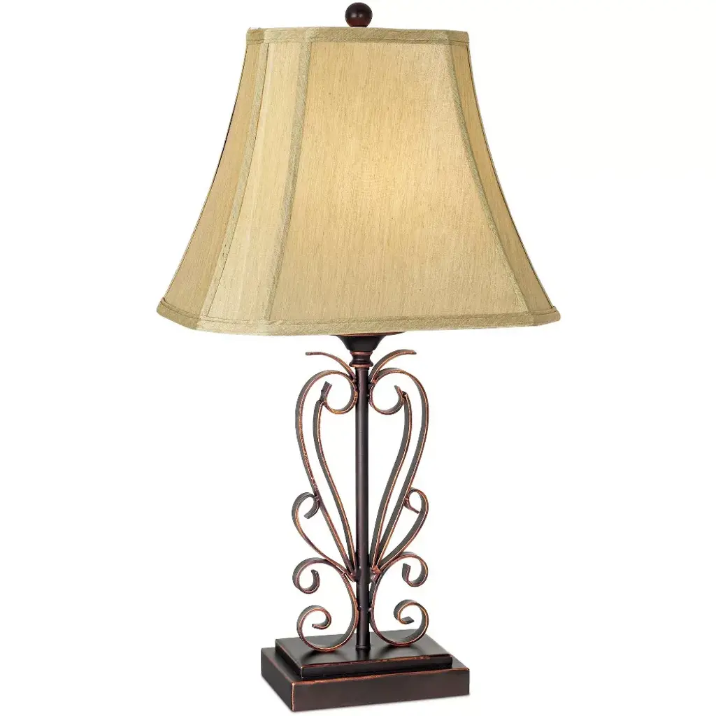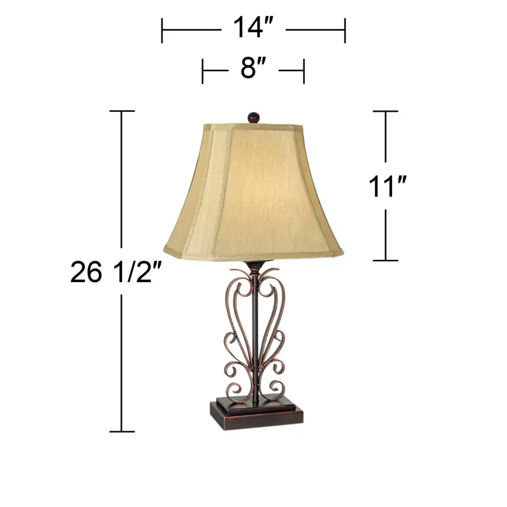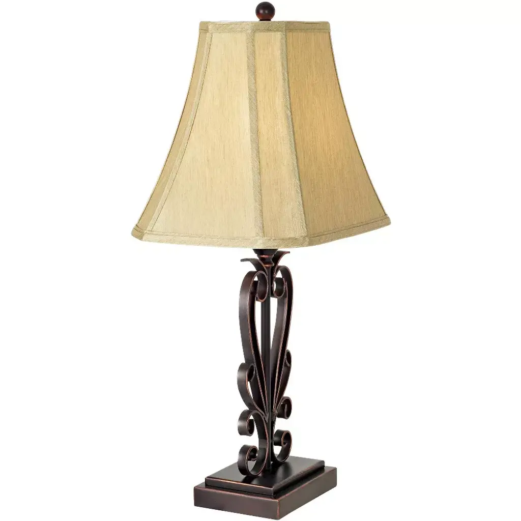 These pretty table lamps will dress up your decor. The wonderful iron scroll base design comes in a bronze finish with copper edging. The stacked rectangular base offers solid footing. A faux silk cut-corner shade tops each artistic design. The shades' rectangular shape allows for placement close to the wall.