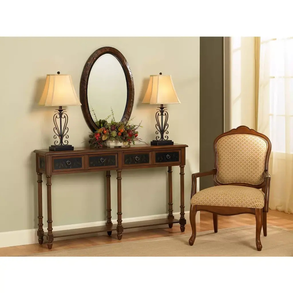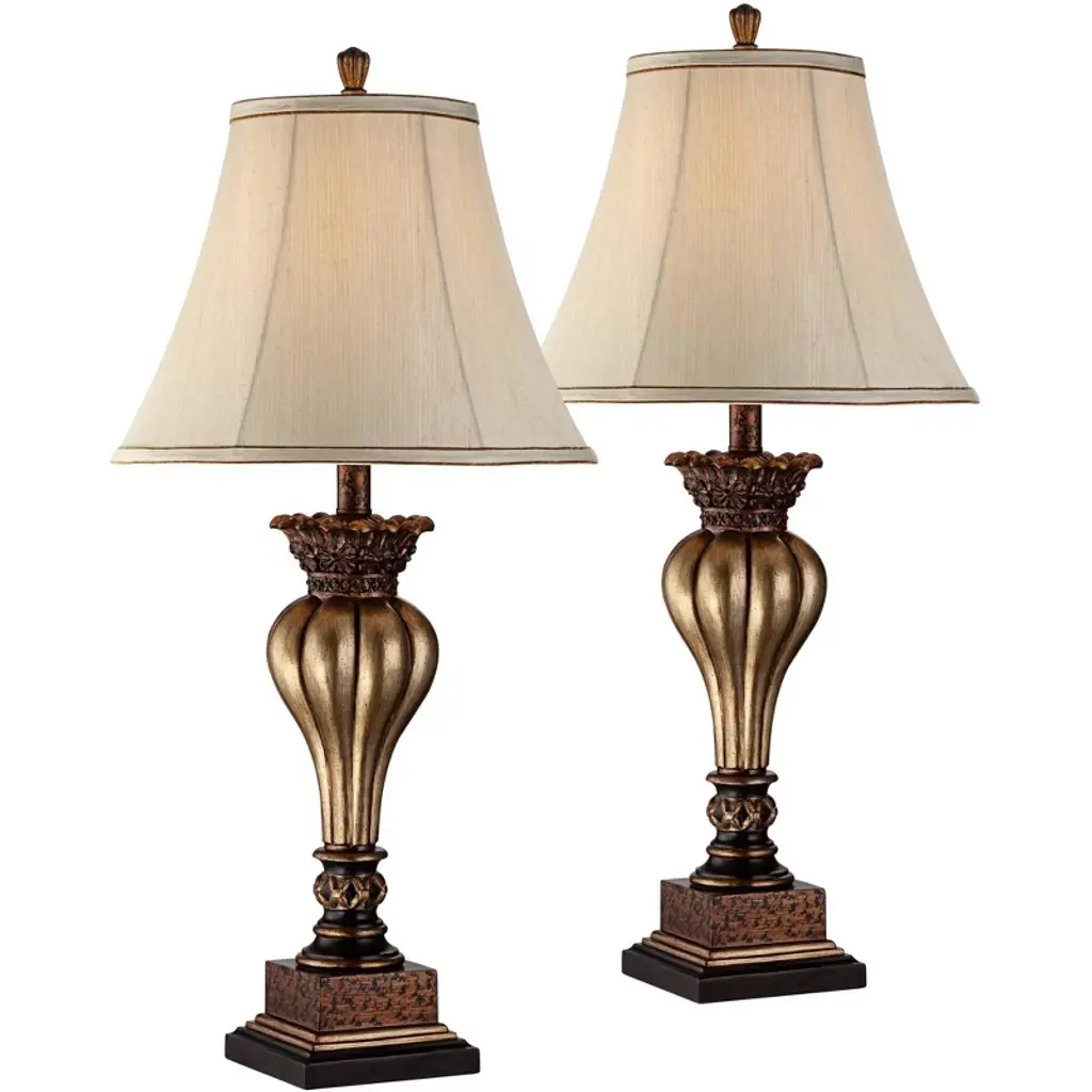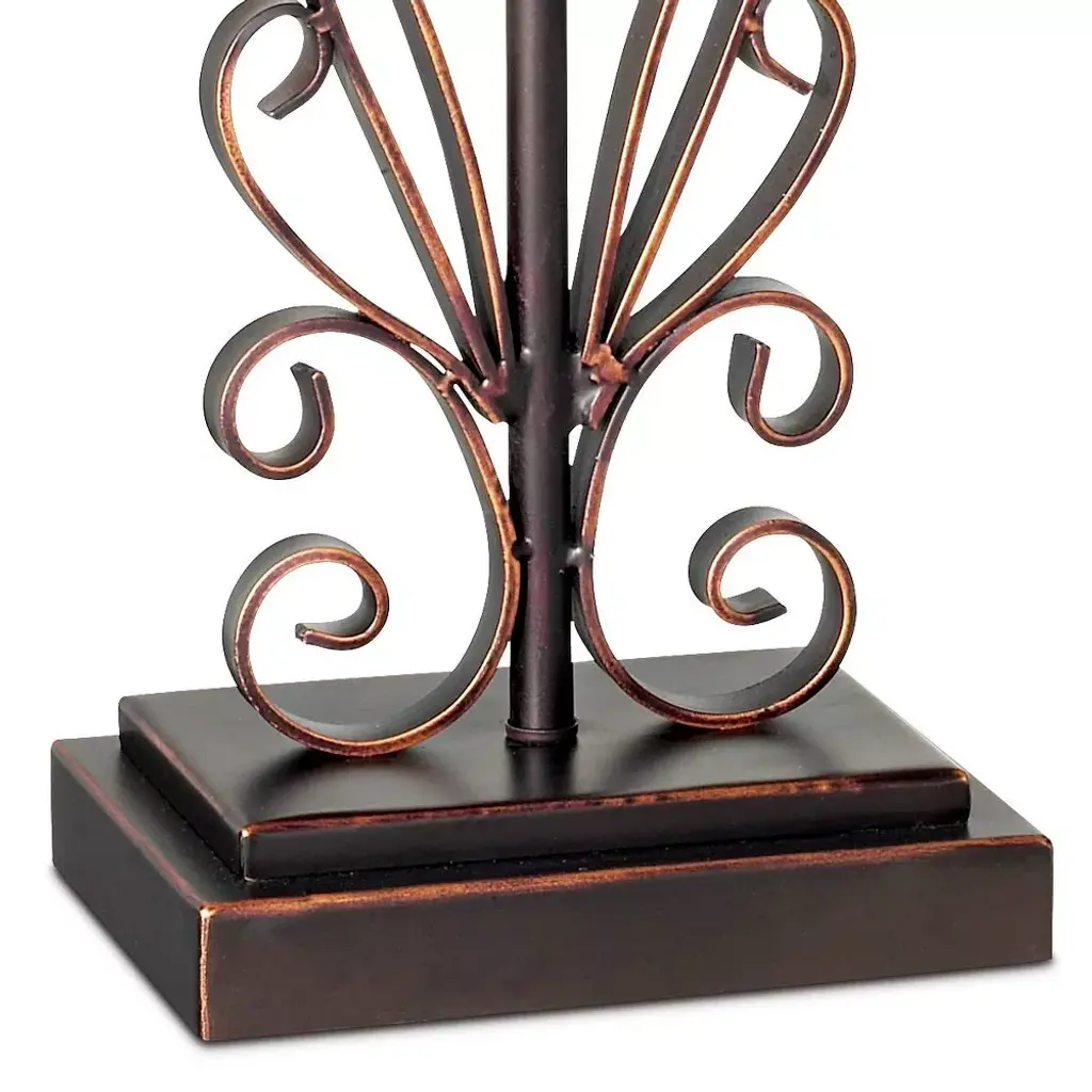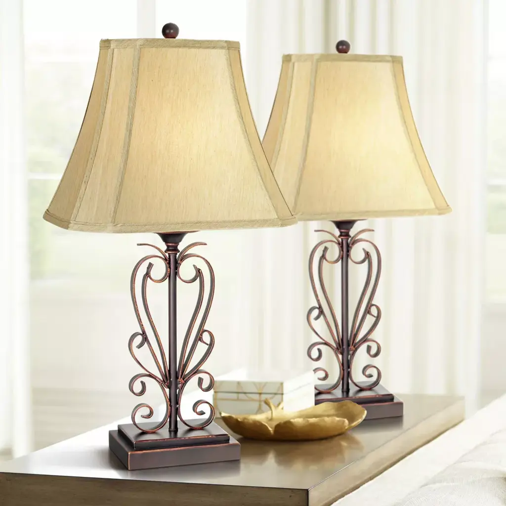These pretty table lamps will dress up your decor. The wonderful iron scroll base design comes in a bronze finish with copper edging. The stacked rectangular base offers solid footing. A faux silk cut-corner shade tops each artistic design. The shades' rectangular shape allows for placement close to the wall.