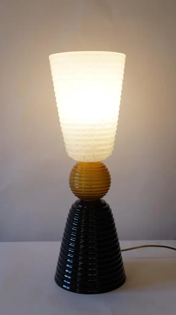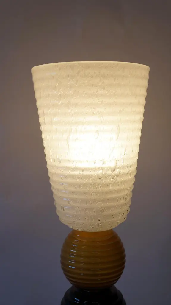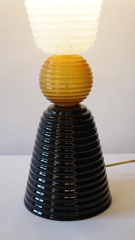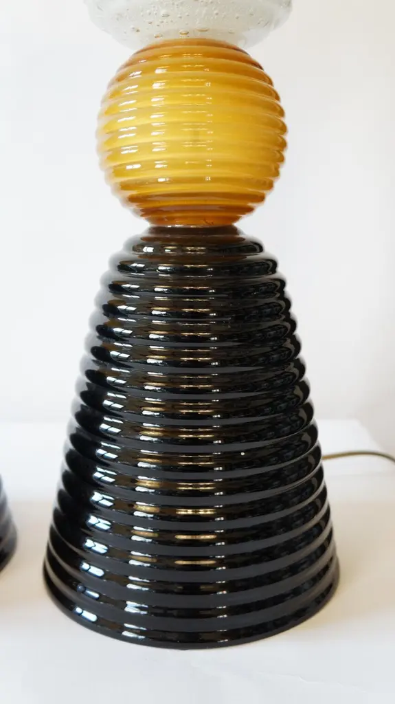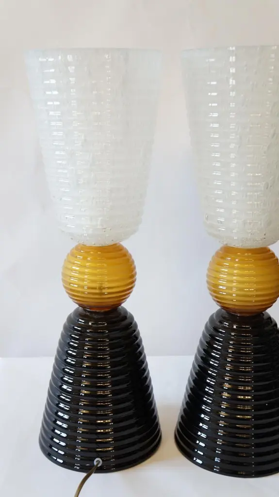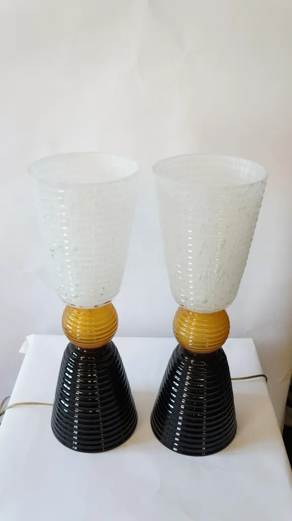 The lamp you can see in the picture is very simple but impressive. It is precisely the striking complementaritybetween black and white, divided by amber, that makes it so elegant. It develops with two symmetrical cups divided by a ribbed sphere. The ribbed work is obtained from an iron mold that makes the surface "a coste", precisely. In addition, what looks white is an effect of the glass called Pulegoso. Pulegoso glass is made by mixing oil directly with the glass inside the furnace. This special processing gives the glass a pockmarked appearance. The lamp reaches a height of 55.5 cm, and a diameter of 18.5 cm and was produced by Fratelli Toso in 1975.The products are entirely handmade in style Mid-Century ModernThe price of the item includes professional and tailored packing.Lamps can be rewired for your country code.