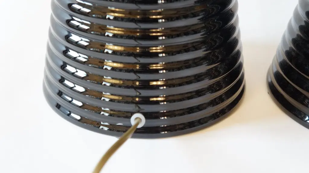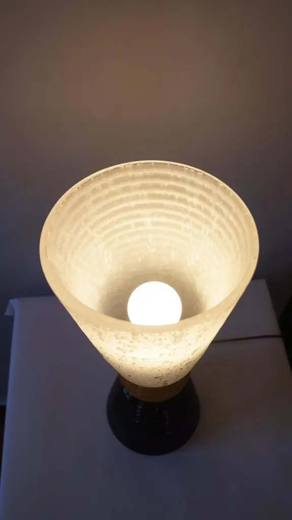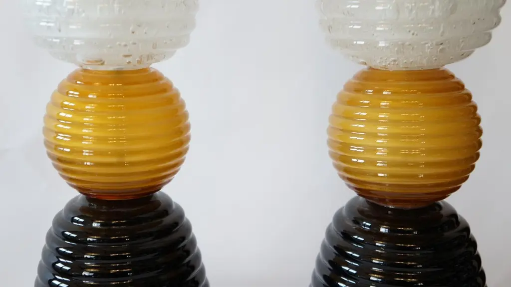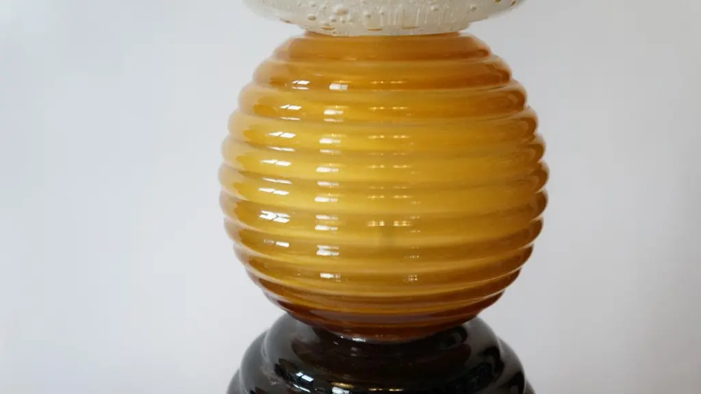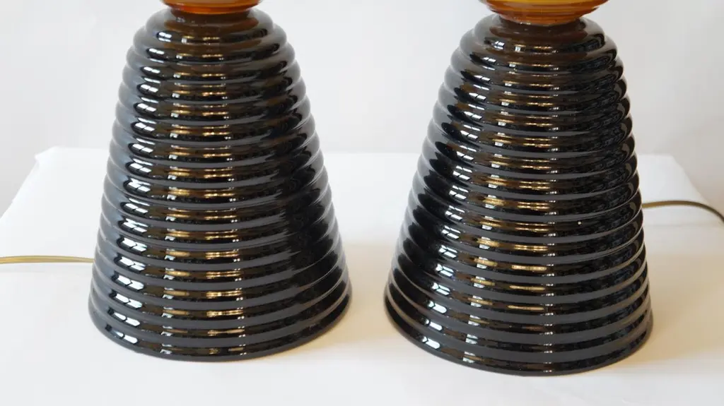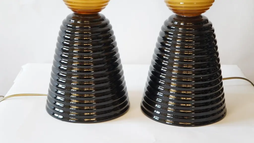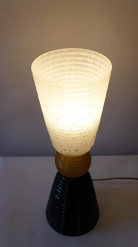 The lamp you can see in the picture is very simple but impressive. It is precisely the striking complementaritybetween black and white, divided by amber, that makes it so elegant. It develops with two symmetrical cups divided by a ribbed sphere. The ribbed work is obtained from an iron mold that makes the surface "a coste", precisely. In addition, what looks white is an effect of the glass called Pulegoso. Pulegoso glass is made by mixing oil directly with the glass inside the furnace. This special processing gives the glass a pockmarked appearance. The lamp reaches a height of 55.5 cm, and a diameter of 18.5 cm and was produced by Fratelli Toso in 1975.The products are entirely handmade in style Mid-Century ModernThe price of the item includes professional and tailored packing.Lamps can be rewired for your country code.