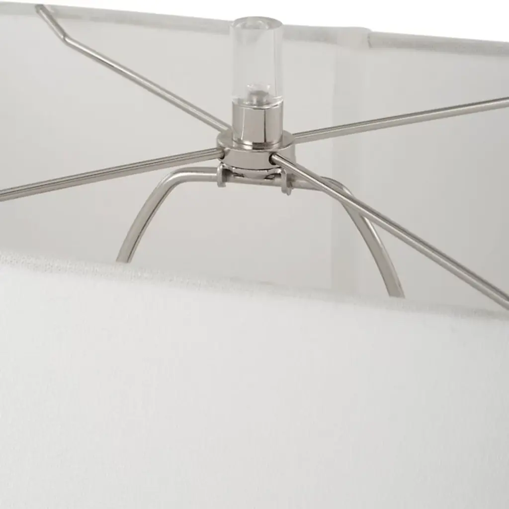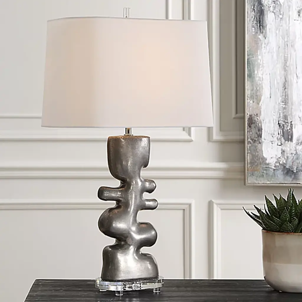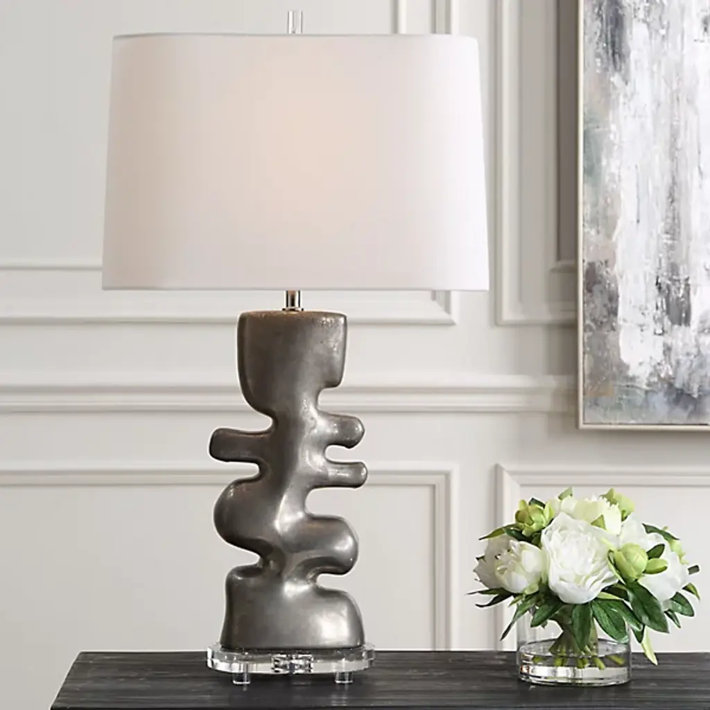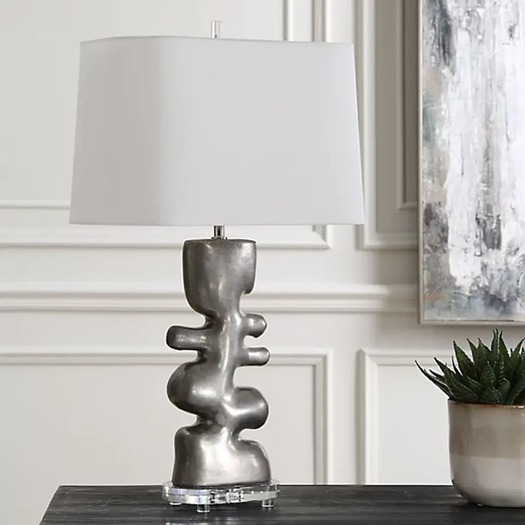 The Free Flowing Table Lamp from Uttermost combines artistic expression with practical function in its carefree design. Designer David Frisch created a truly unique base that sits atop a thick crystal foot, adding an unexpected element to the composition. The rectangular shade with rounded corners provides a directional yet soft light that enhances the lamp's sculptural qualities. The Free Flowing Table Lamp serves as both a lighting source and conversation piece, making it ideal for spaces where distinctive design is appreciated.