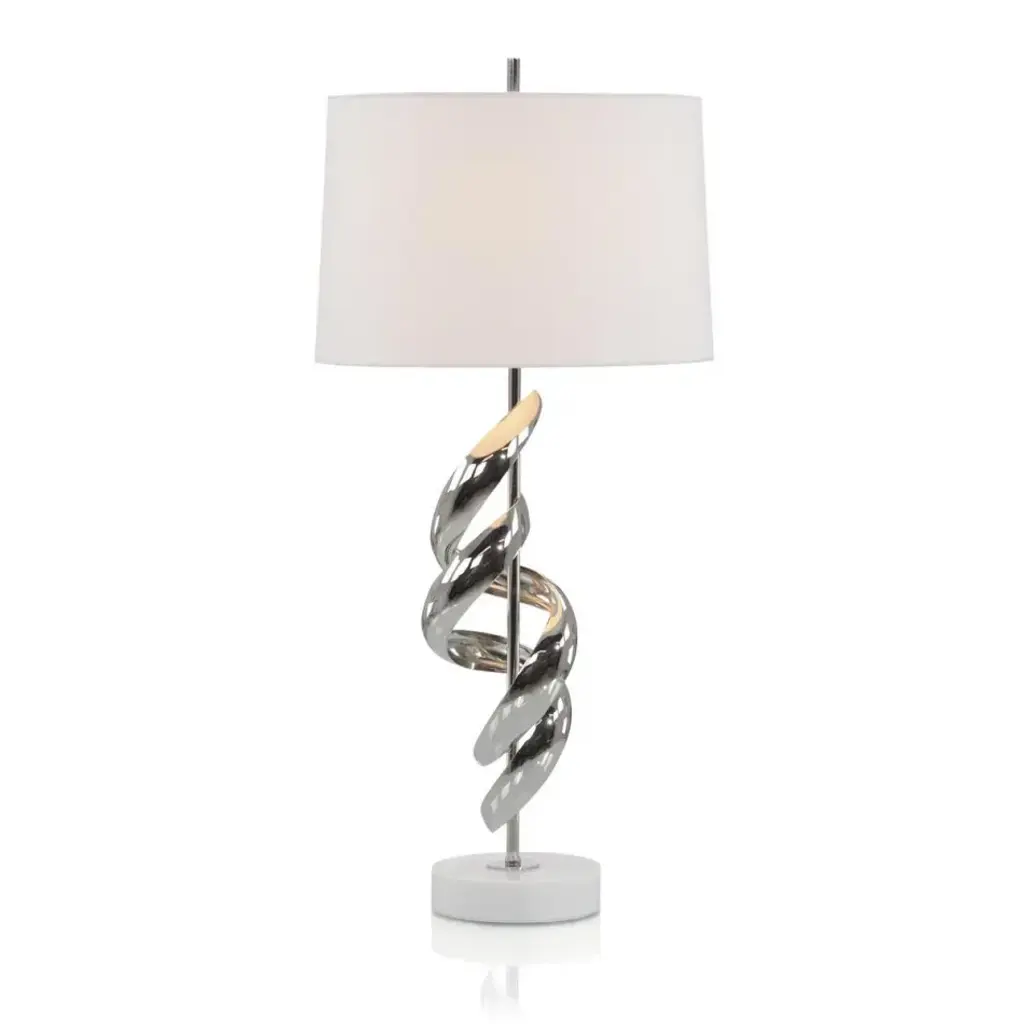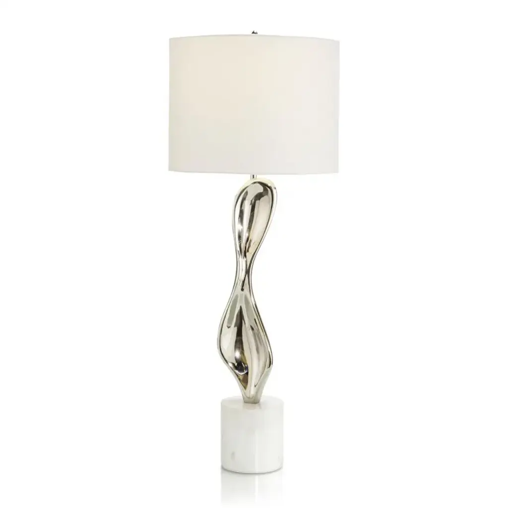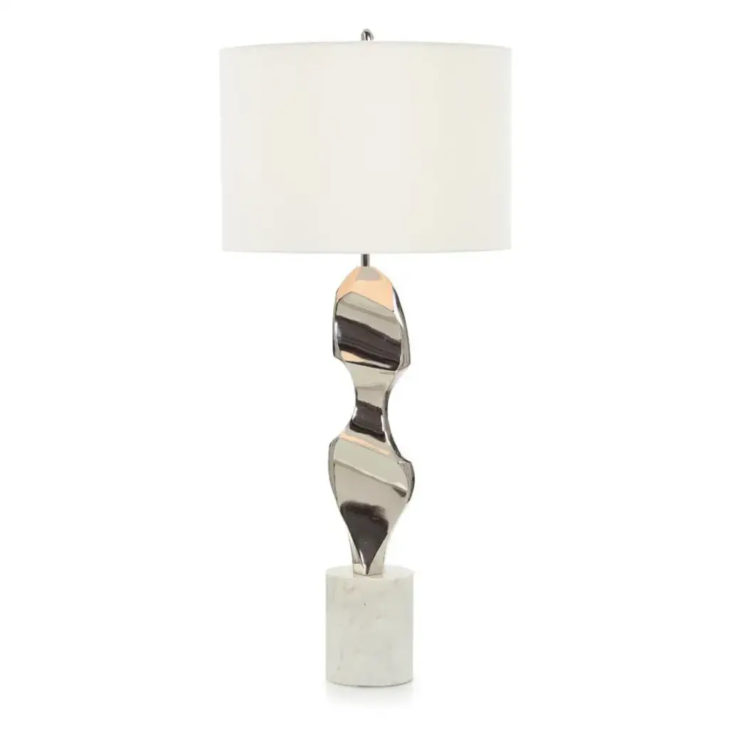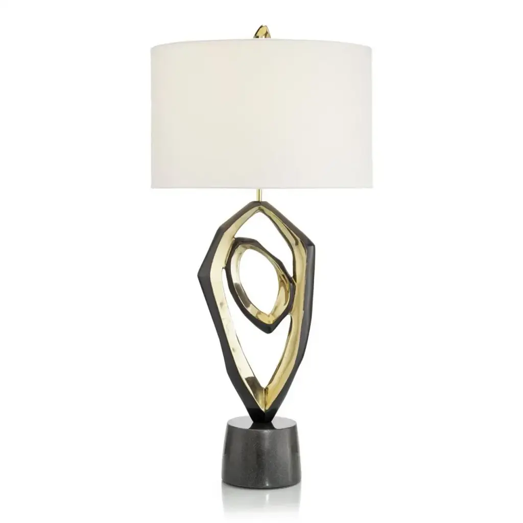 The Freer Cove Bronze Lamp demands attention with its playful and unique profile. The design is crafted from cast iron, finished in a plated warm bronze and displayed on a thick black marble foot, giving this table lamp a rich elegance. A round hardback drum shade made with a crisp white linen fabric completes the piece. Partial assembly may be required.