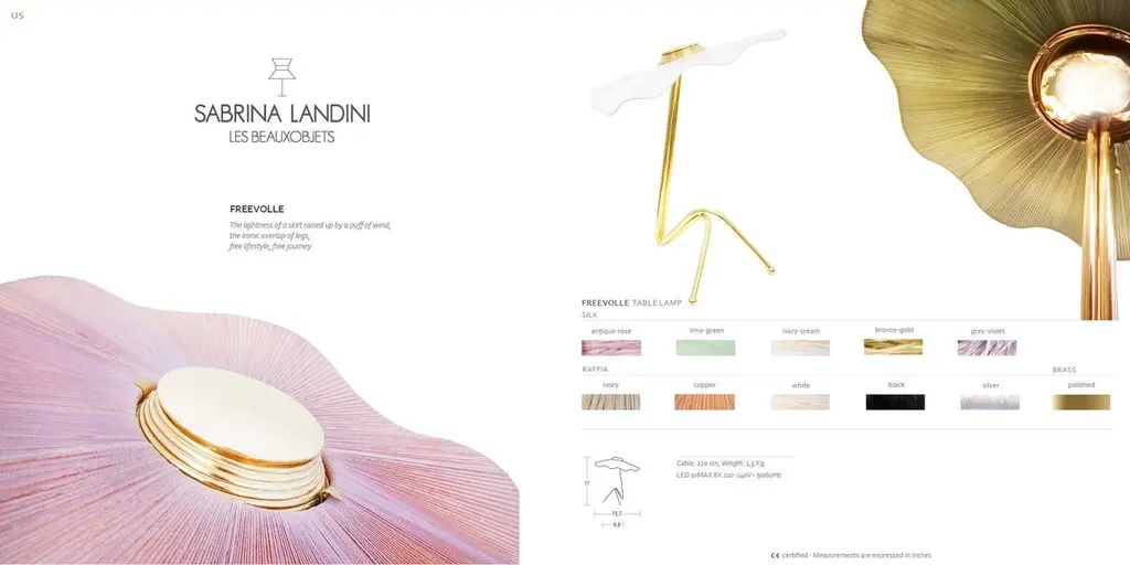 FREEVOLLETwist and go! The timeless “Made-in-Italy” celebrates the graceful Italian manufacture and offers new life expression at the Maison Sabrina Landini.Creativity explores new shapes achieving the essence, overcomes life-blood to appreciate the vibrant happiness, an ode to movement, like a free dance, welcomes the upcoming Lady-lamp "Freevolle".The lampshade seems to flight like colored skirts raised up by a puff of wind.Brass shimmers by its sinuous shape and winkes at the captivating twist of legs and its turning head Freevolle, the exquisite Lady-lamp that adds a touch of glamour and identity to home interiors CE certified and Electrified : US, EU, UK, 1xG9 lamp holder, dimmable