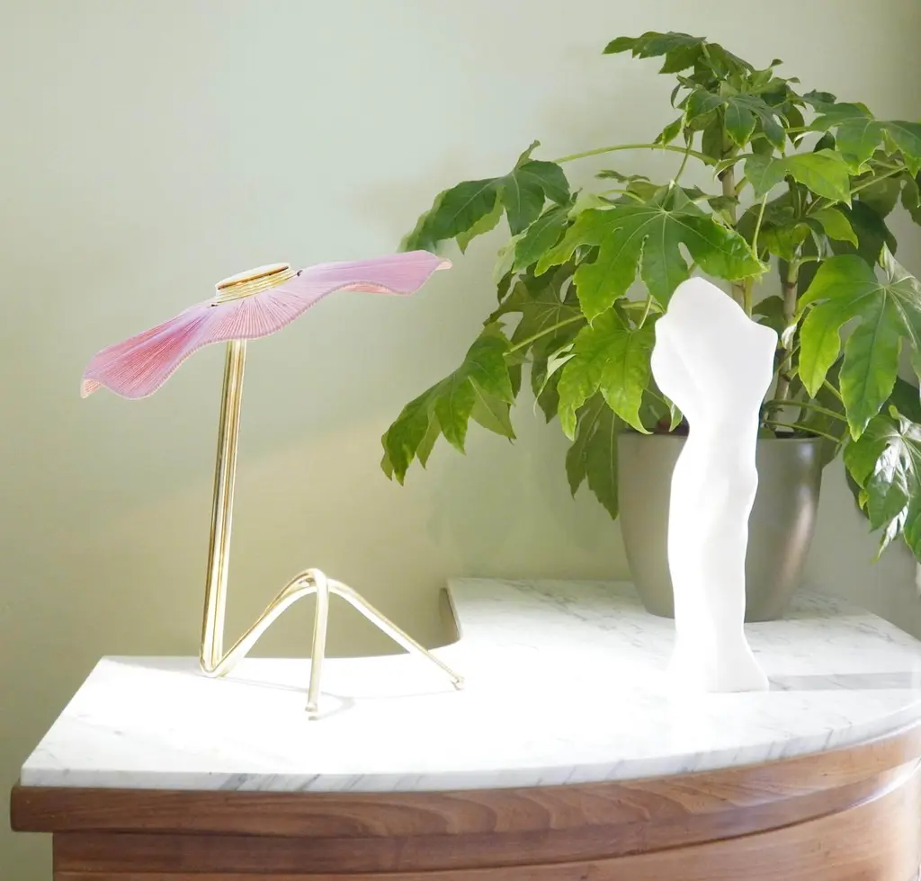 Freevolle Sculpture Feminine Table Lamp, Brass, Rose Silk, Art Silvered Glass