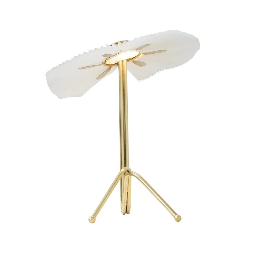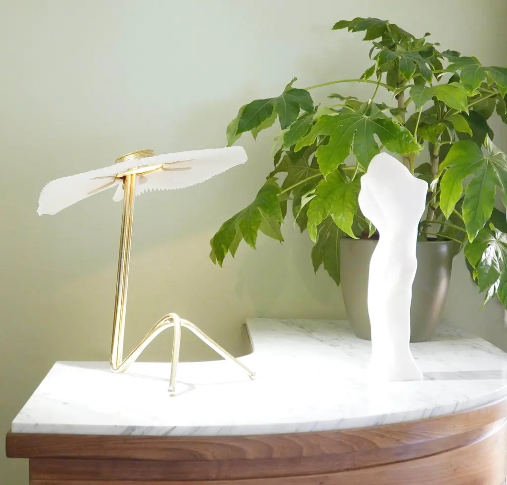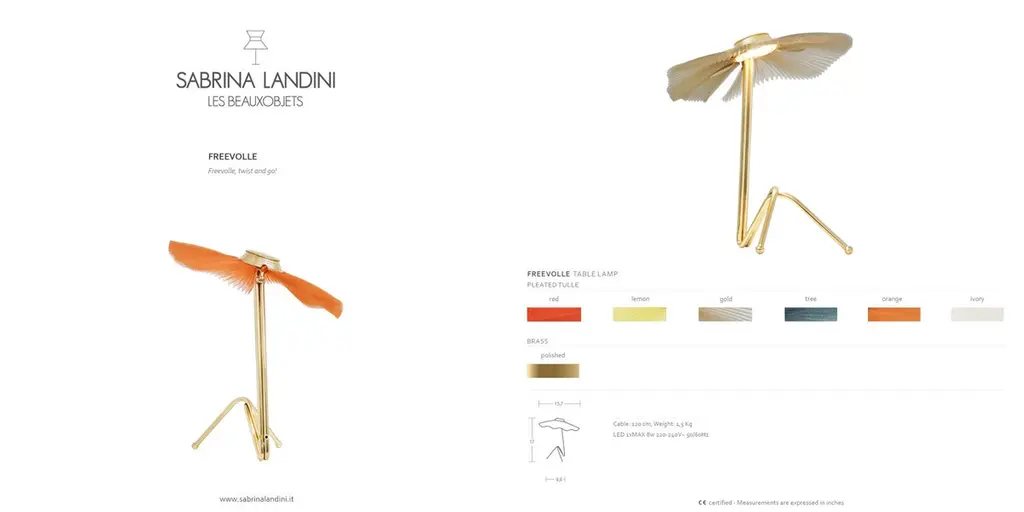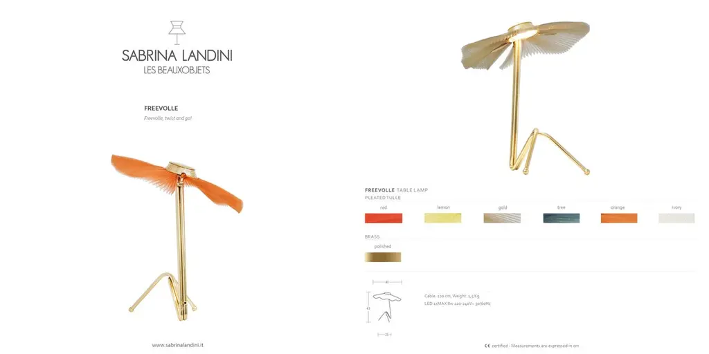 FREEVOLLETwist and go! The Freevolle Lady lamp captures a quiet elegance, with its refined curves, delicate and airy silhouette, it moves with grace—striking the perfect balance between structure and freedom.The timeless “Made-in-Italy” celebrates the graceful Italian manufacture and offers new life expression at the Maison Sabrina Landini.Creativity explores new shapes achieving the essence, overcomes life-blood to appreciate the vibrant happiness, an ode to movement, like a free dance, welcomes the upcoming Lady-lamp "Freevolle".The lampshade seems to flight like colored skirts raised up by a puff of wind.Brass shimmers by its sinuous shape and winkes at the captivating twist of legs and its turning head Freevolle, the exquisite Lady-lamp that adds a touch of glamour and identity to home interiors. Lampshade Colors : red, lemon, gold, tree, orange, ivoryGlass diffuser and silvered crystal tipBrass body polished finishWiring : Flat led 1xmax 8W US electrified